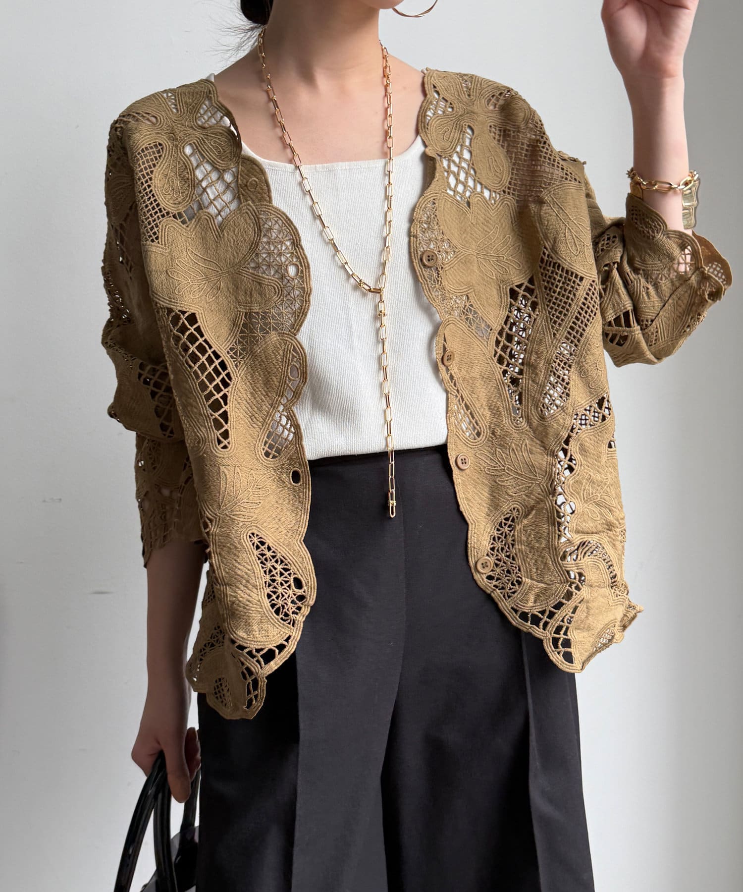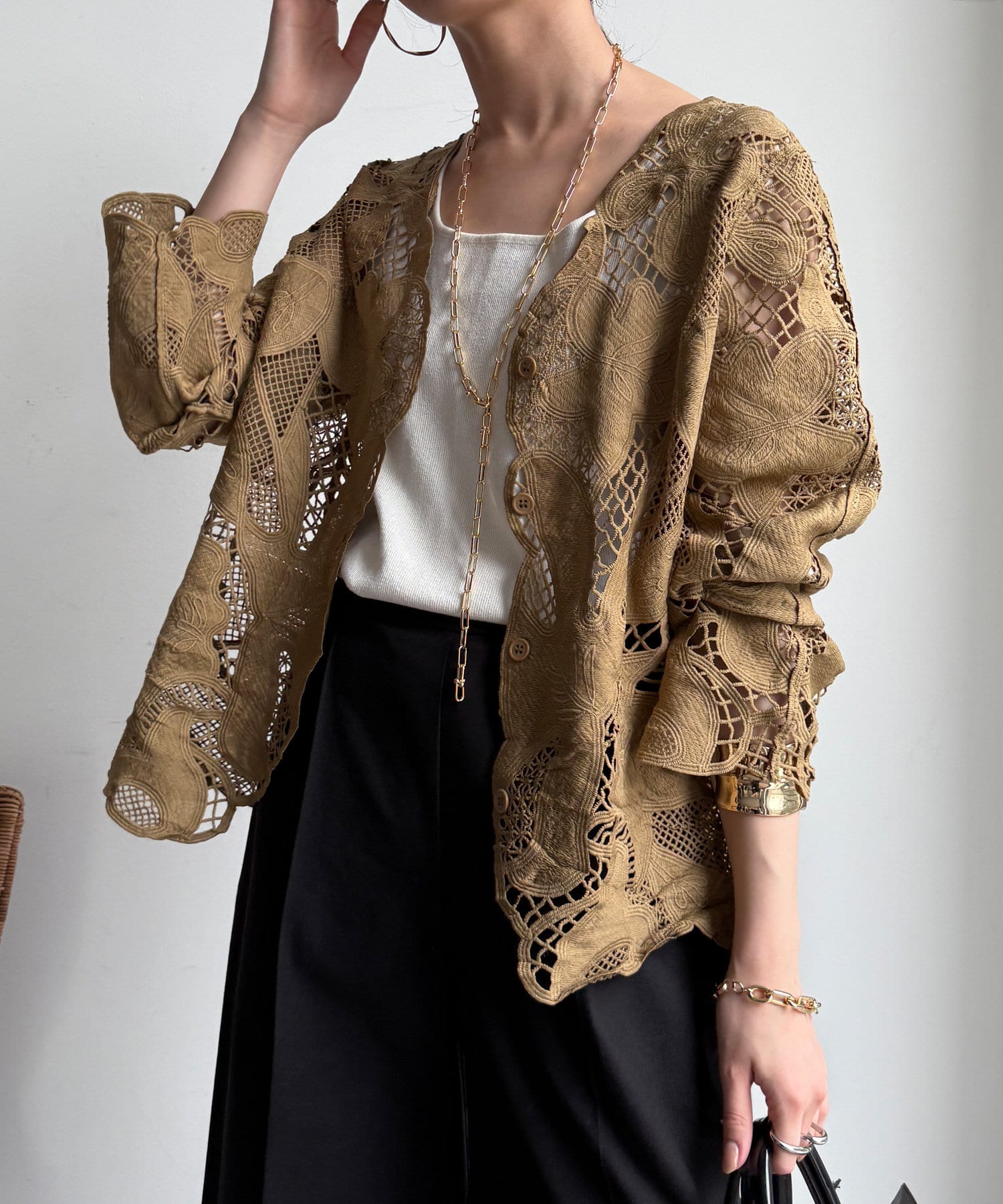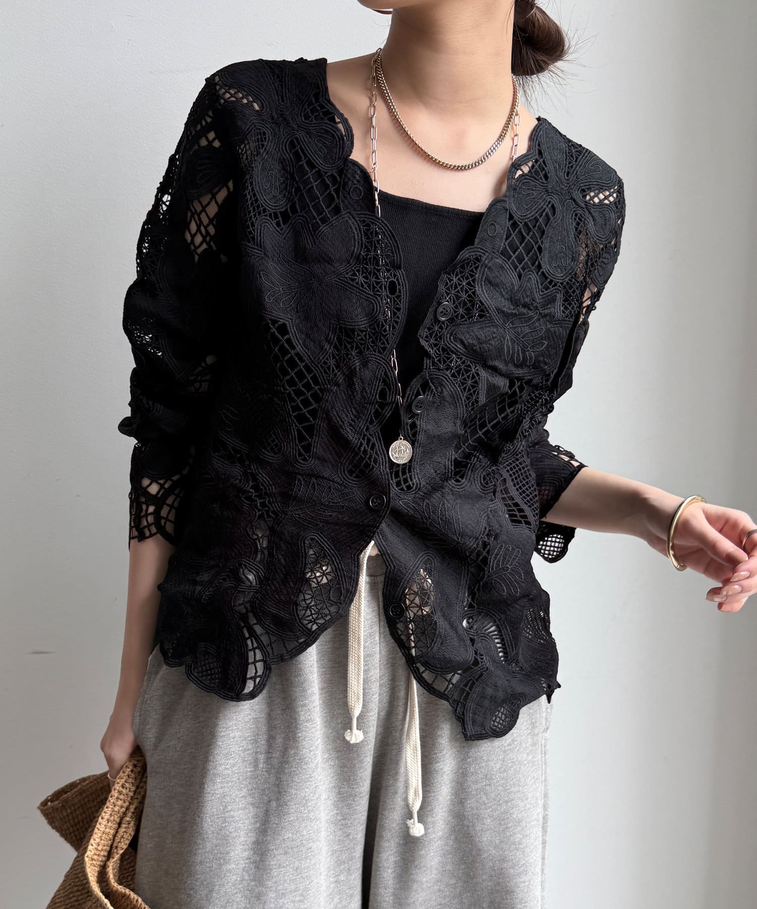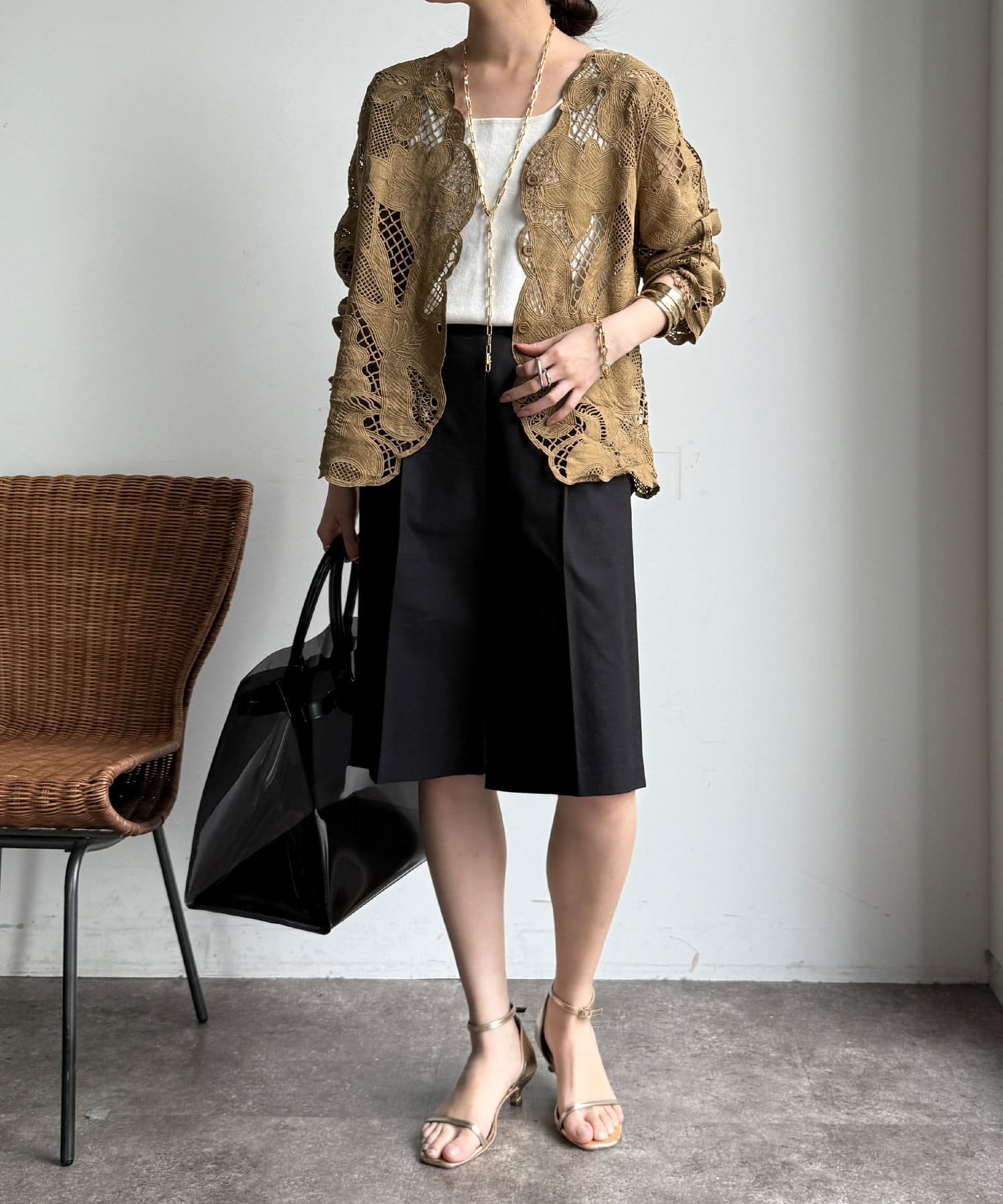 全体に施されたレースデザインがスタイリングを新鮮に見せてくれるアイテムです!