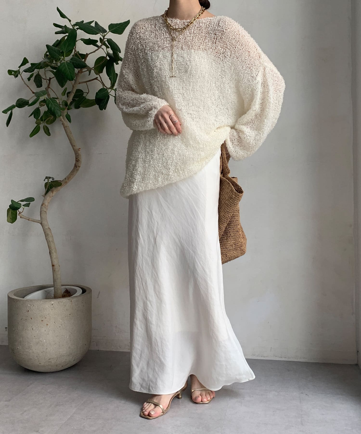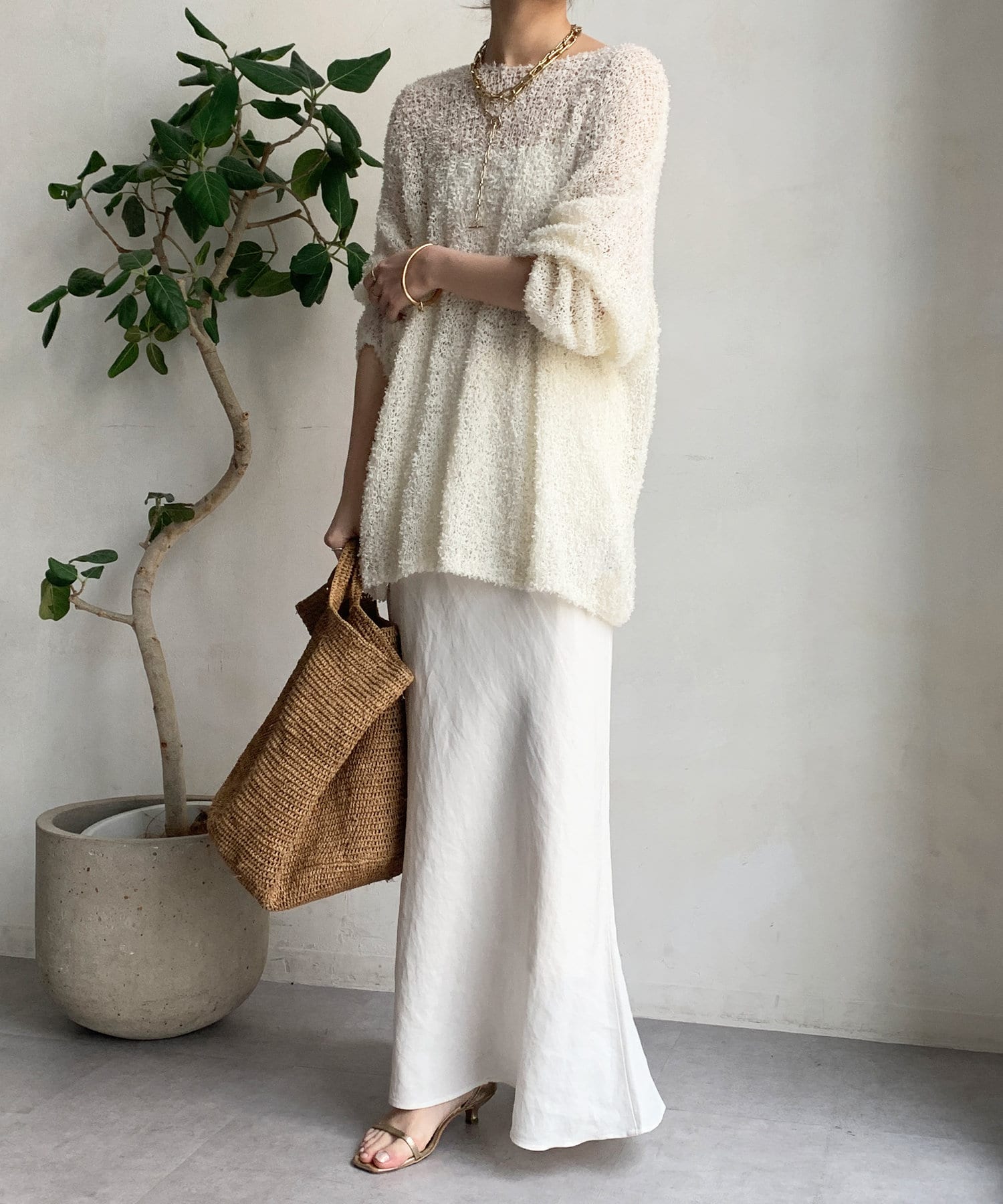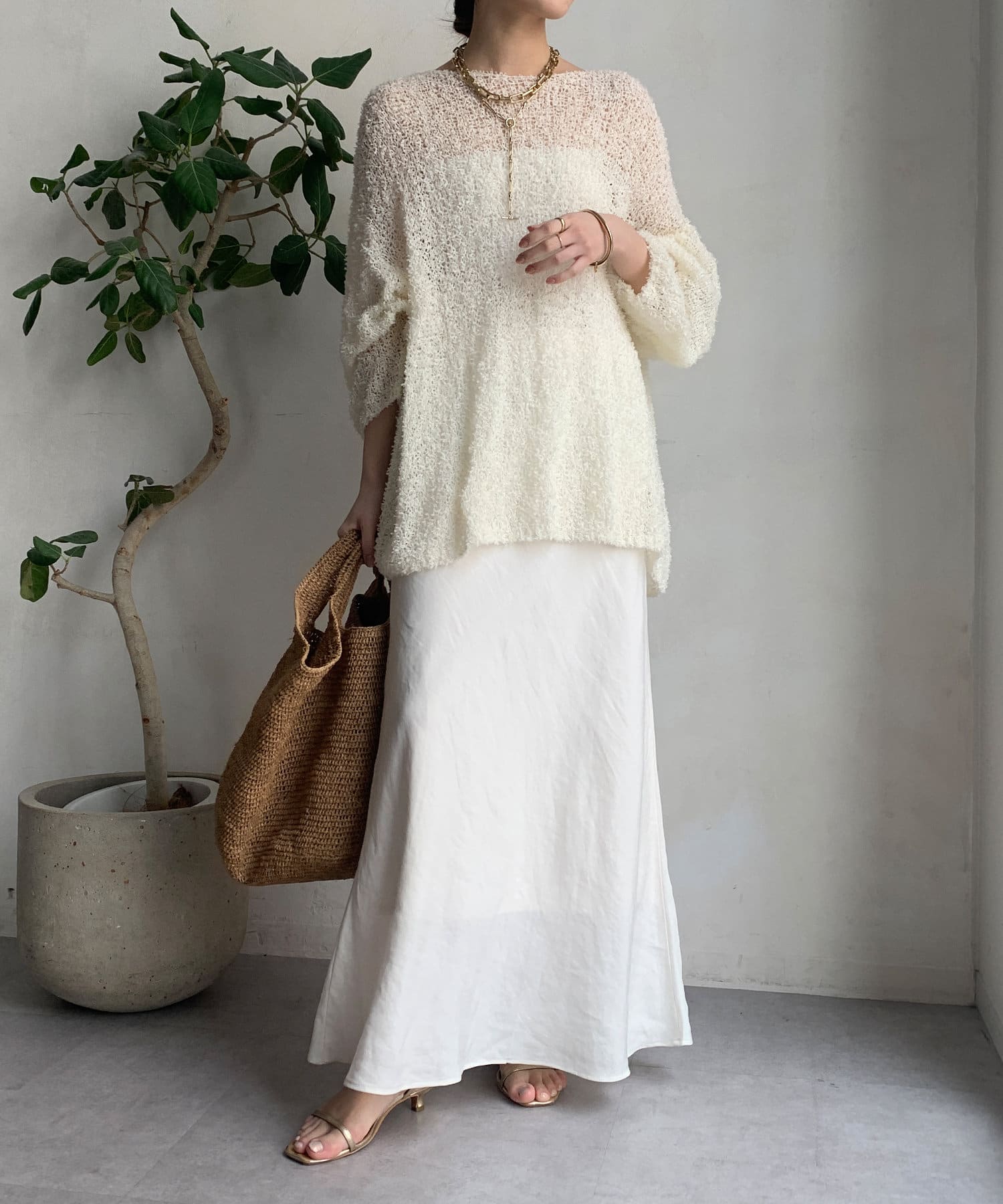 ネックラインの抜け感あるシルエットがレディライクなポイントに。