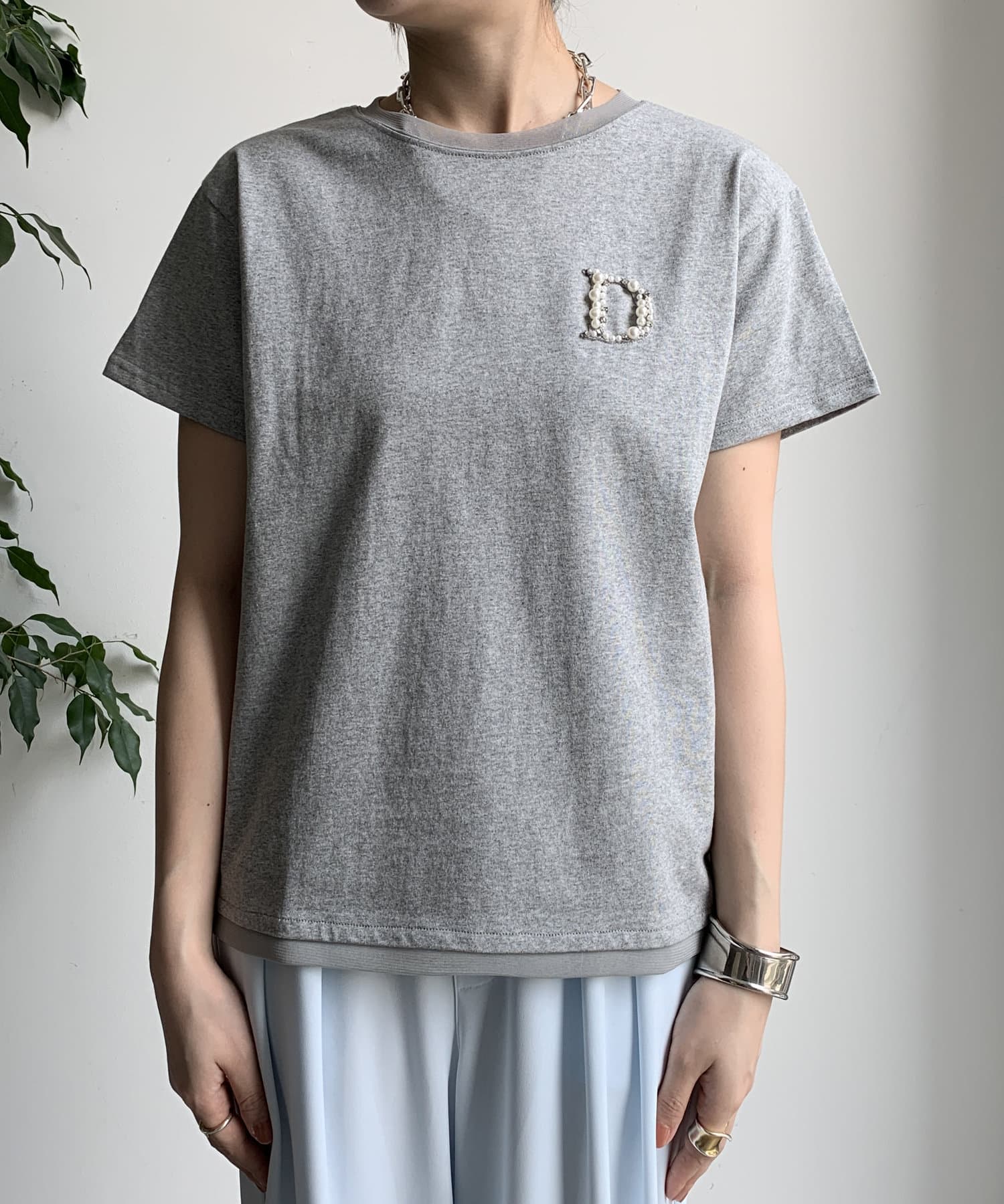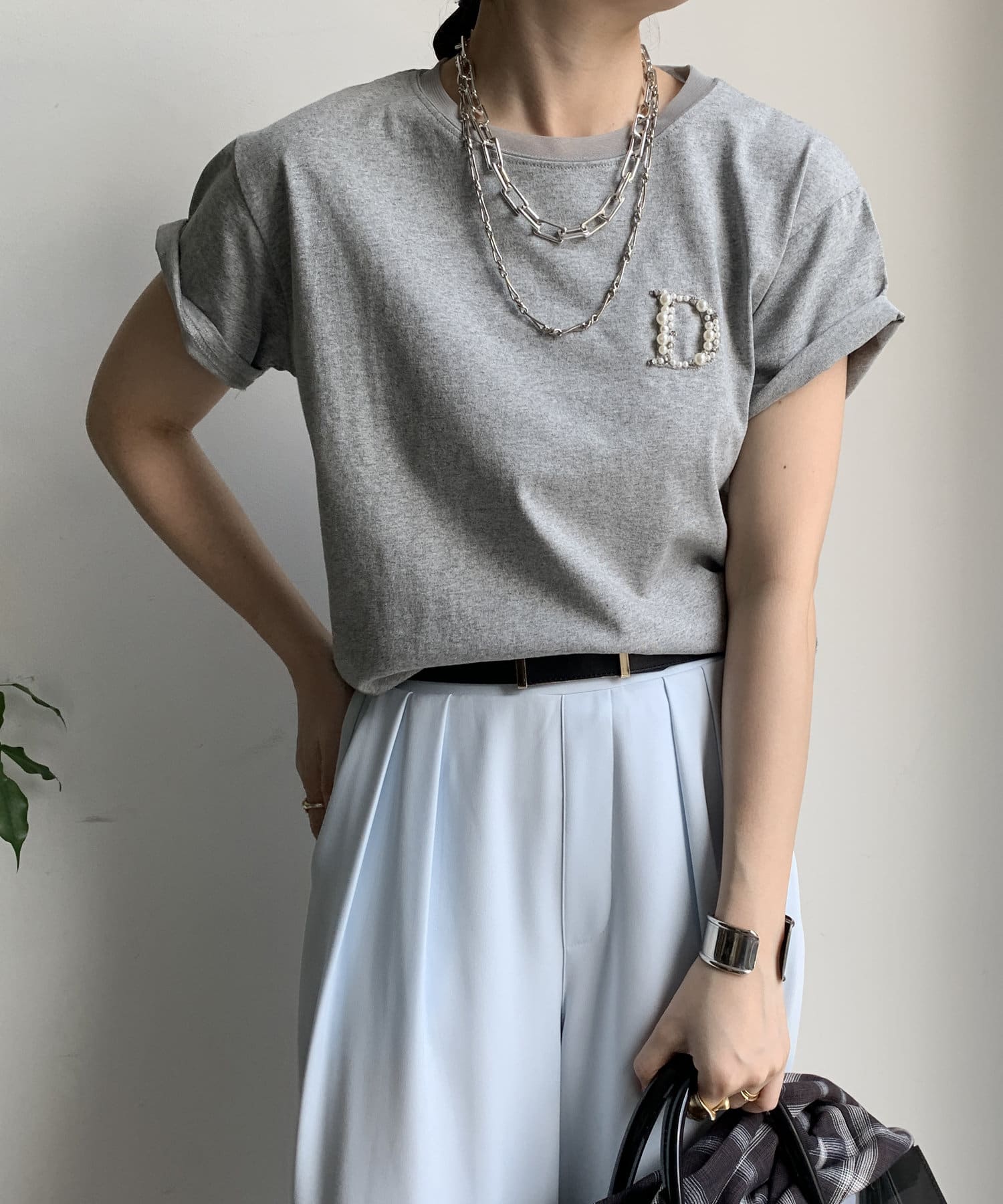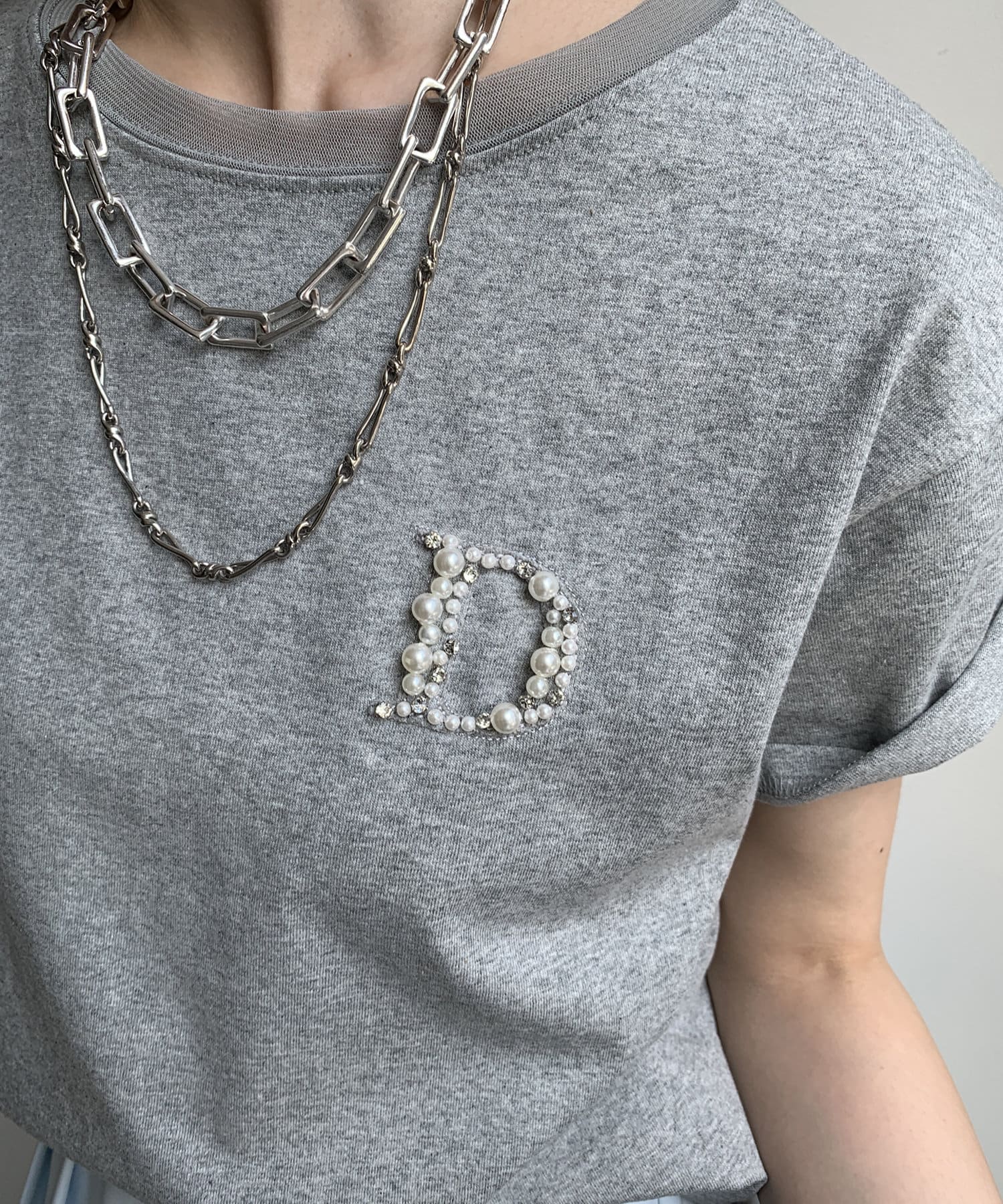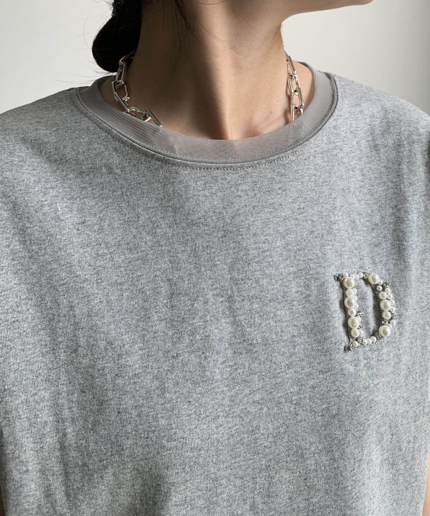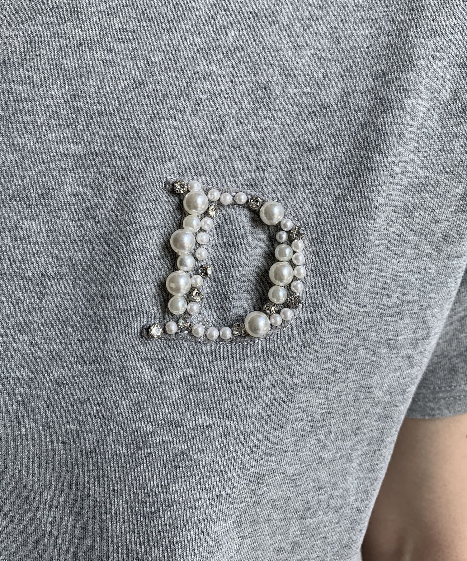 一見シンプルなクルーネックTシャツですが、左胸にあしらわれた「D」のイニシャルビジューが、上品なアクセントとして存在感を放ちます。