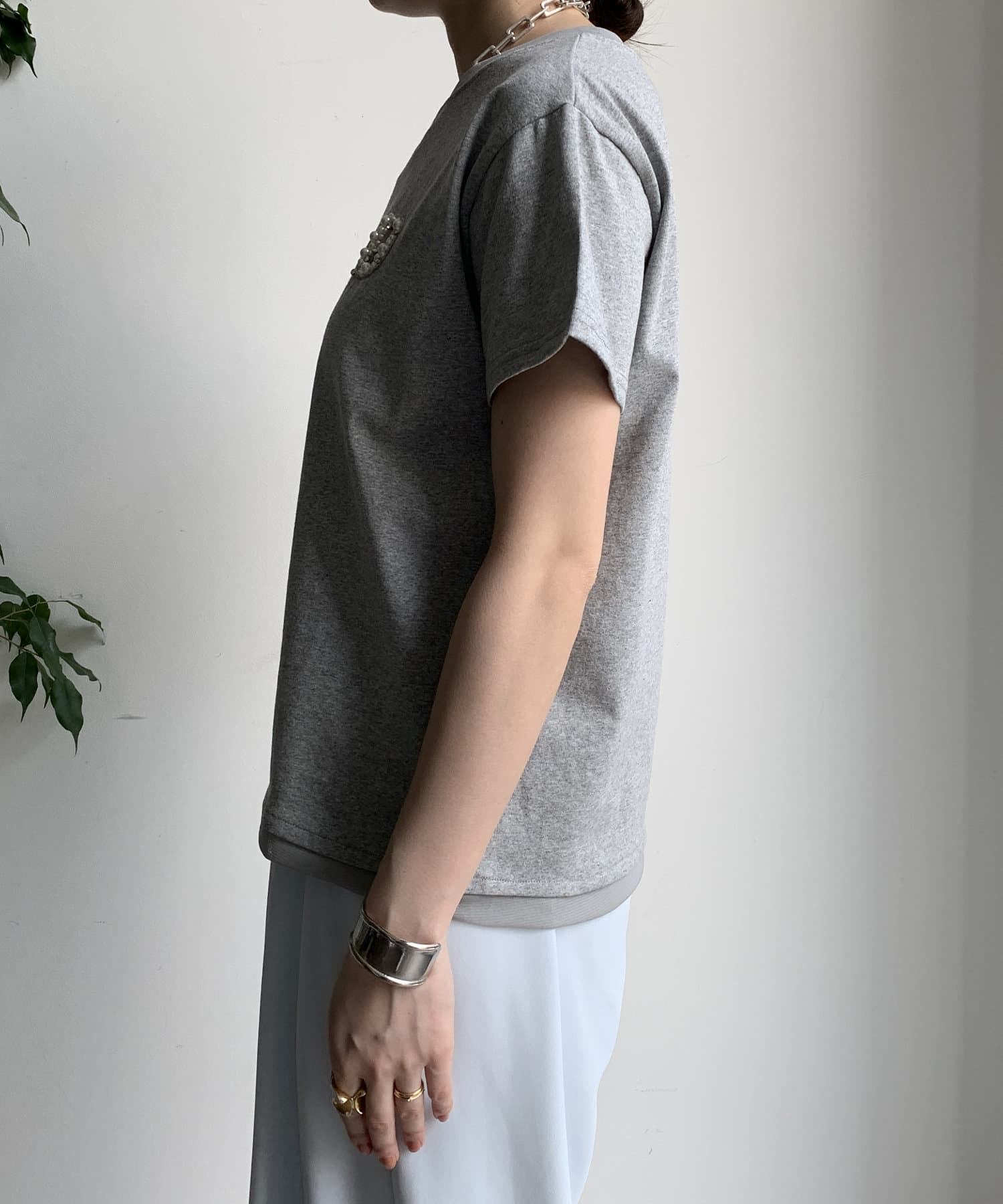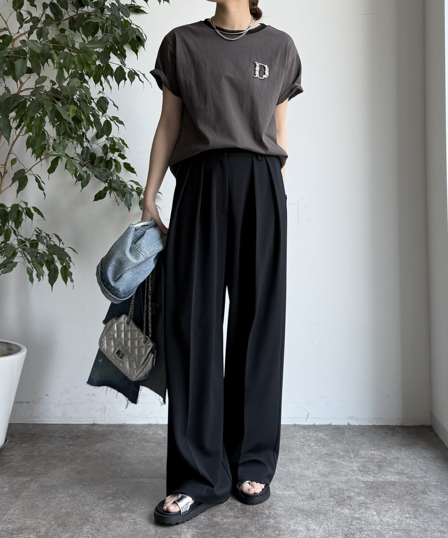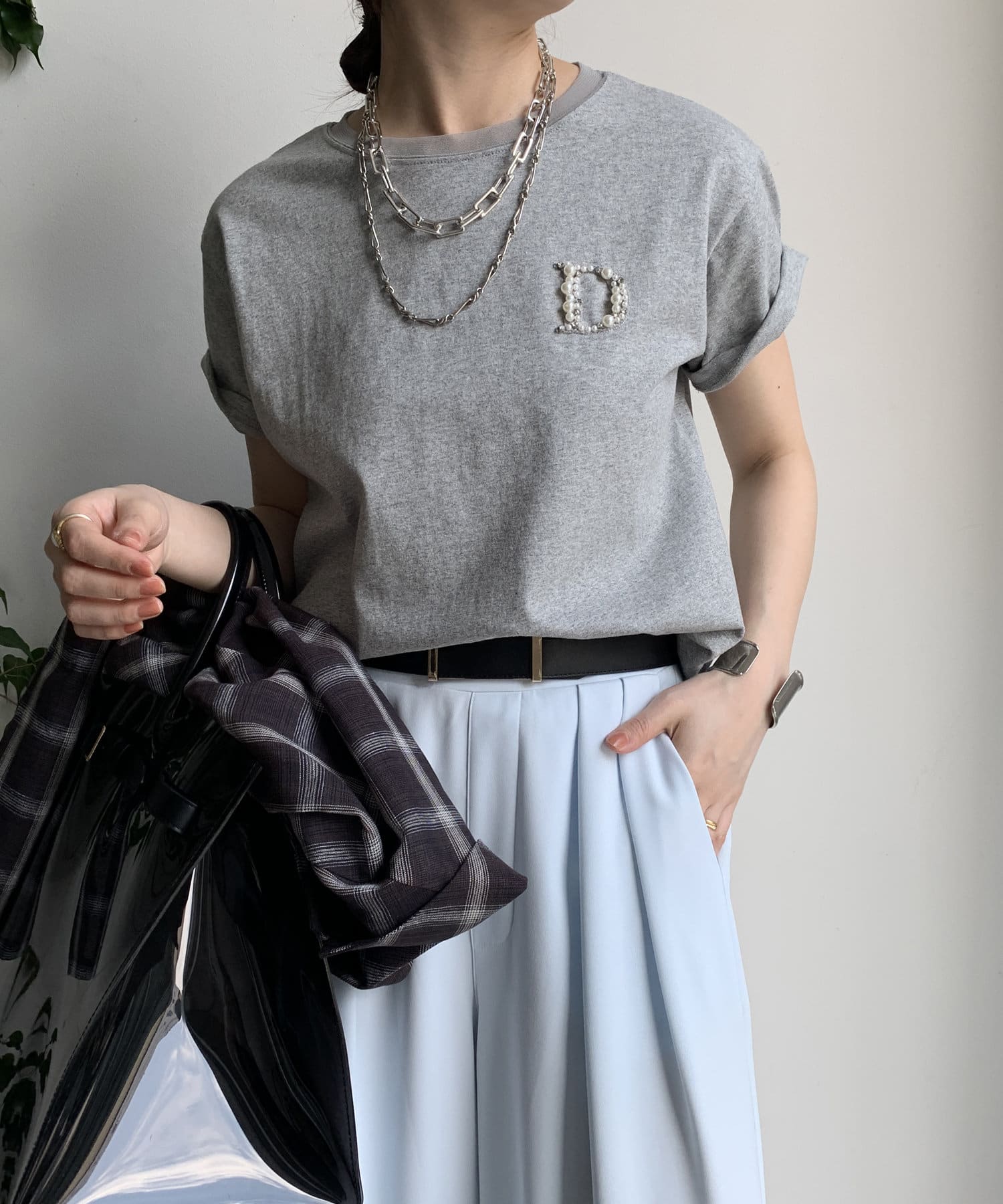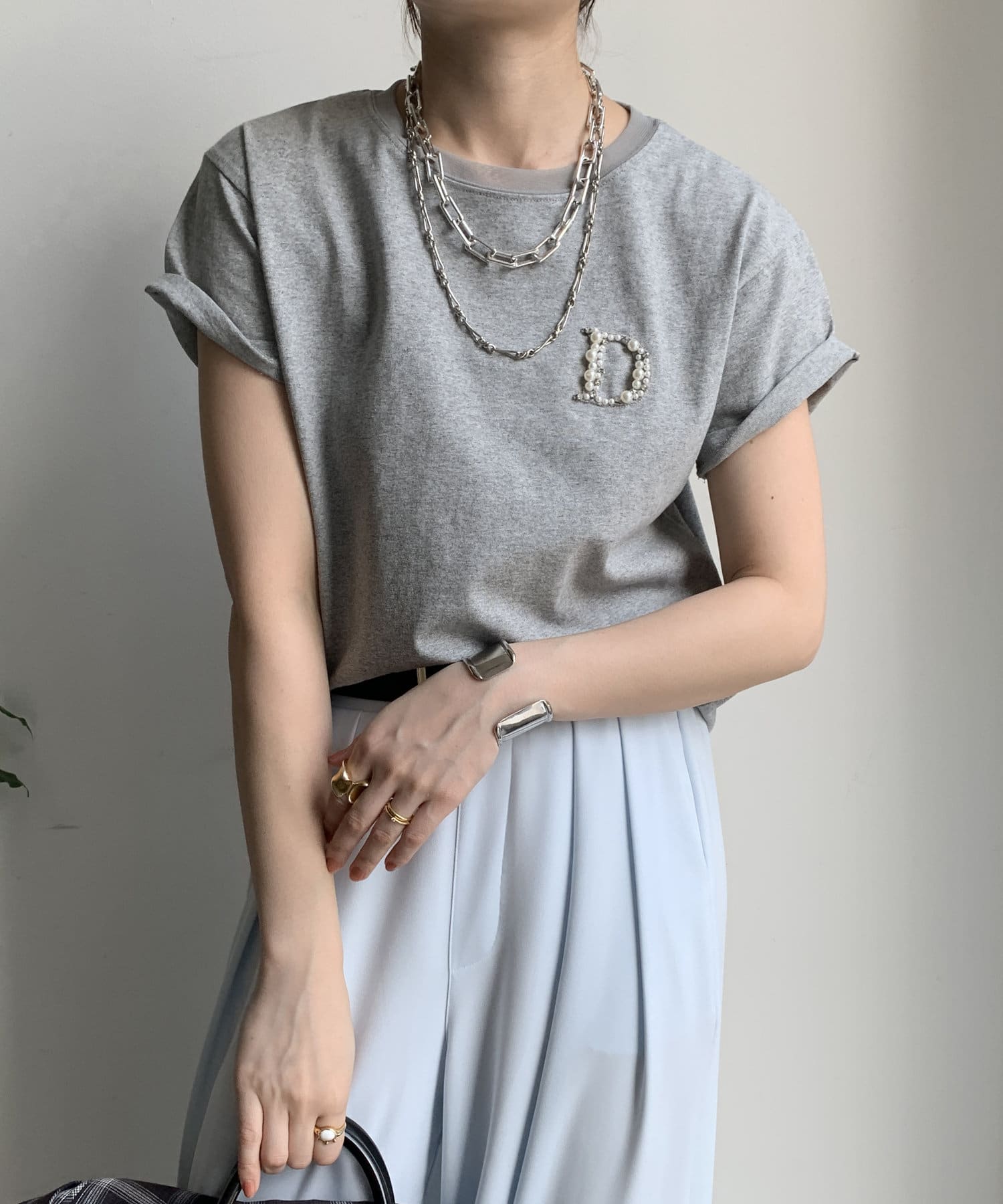 一見シンプルなクルーネックTシャツですが、左胸にあしらわれた「D」のイニシャルビジューが、上品なアクセントとして存在感を放ちます。