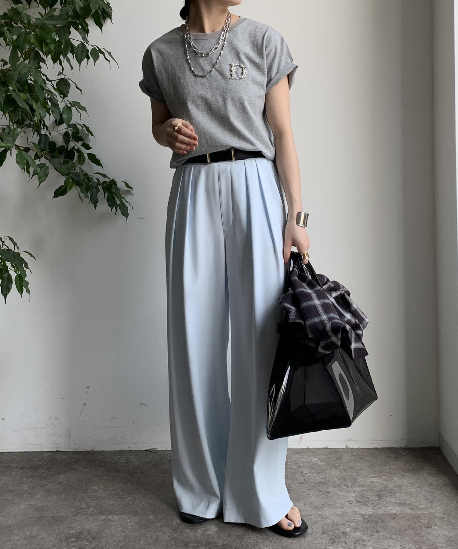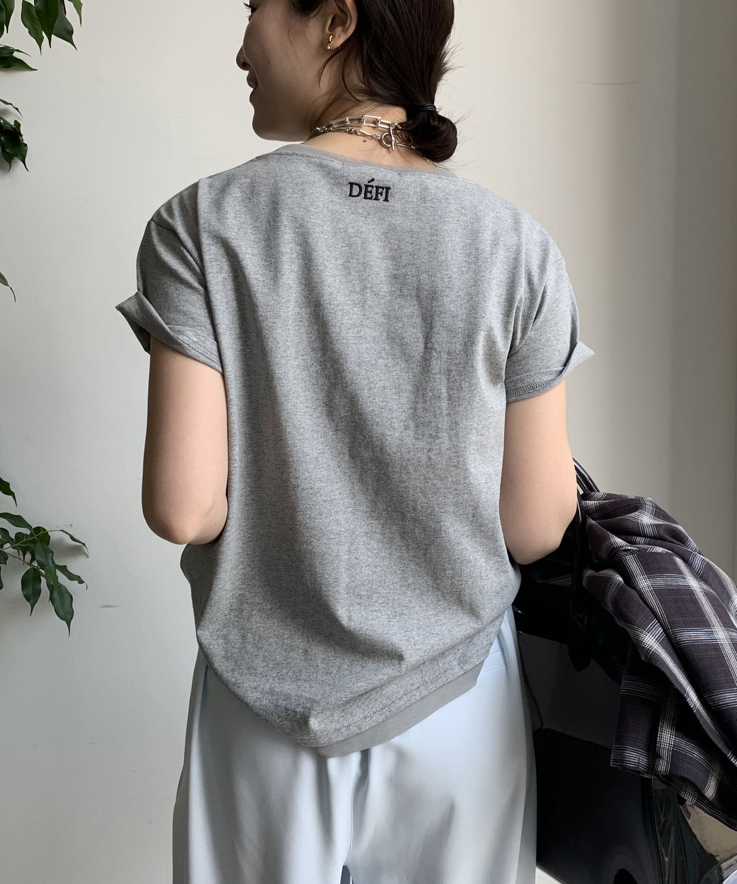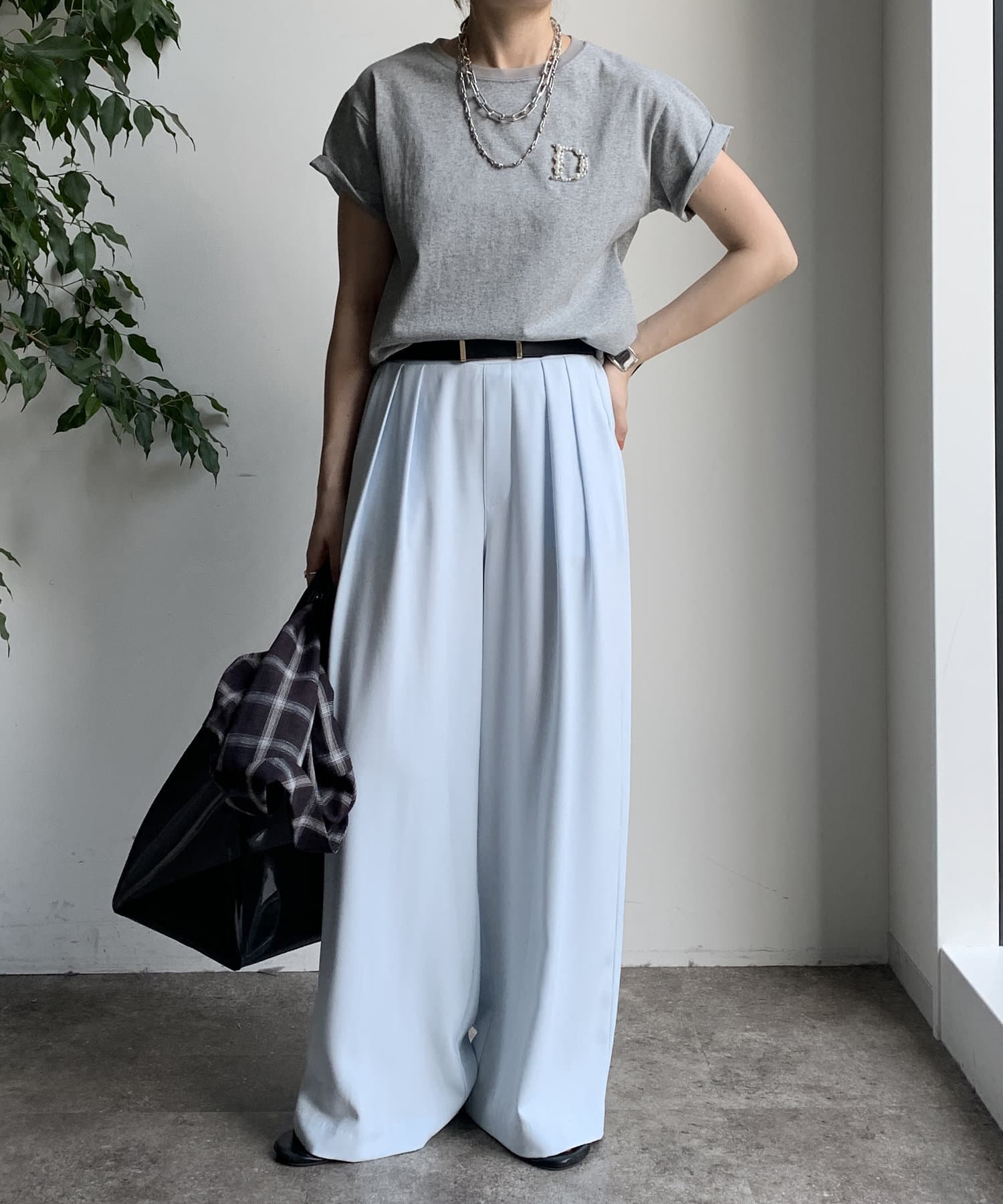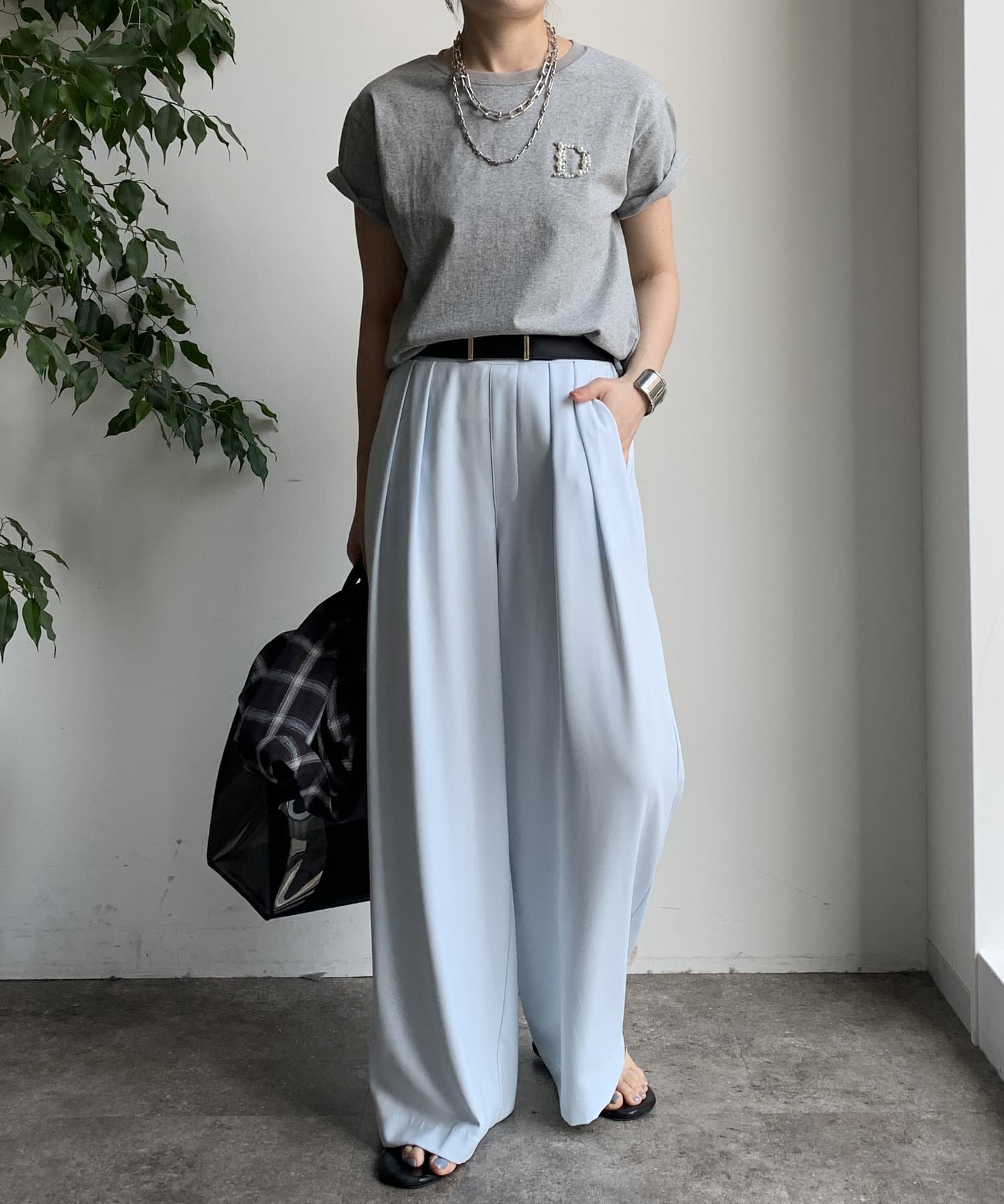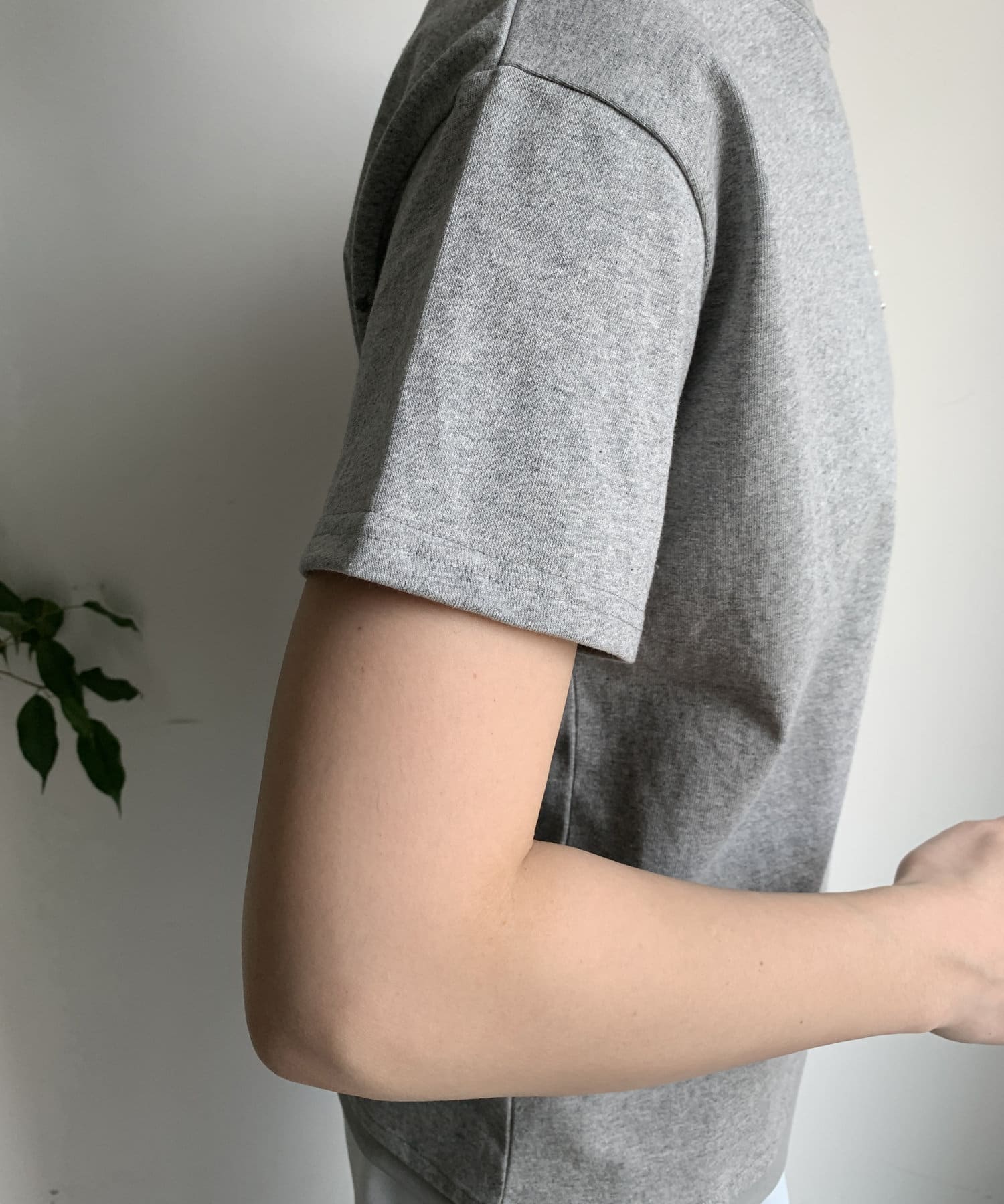 一見シンプルなクルーネックTシャツですが、左胸にあしらわれた「D」のイニシャルビジューが、上品なアクセントとして存在感を放ちます。