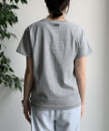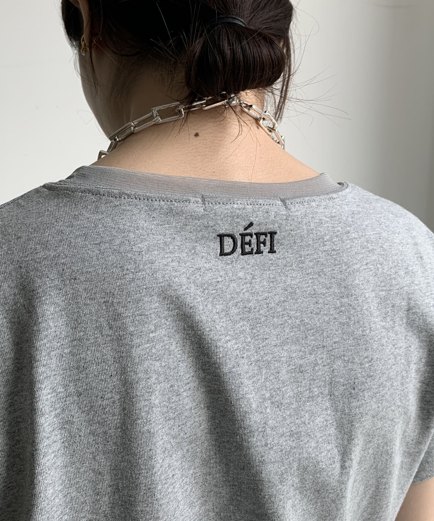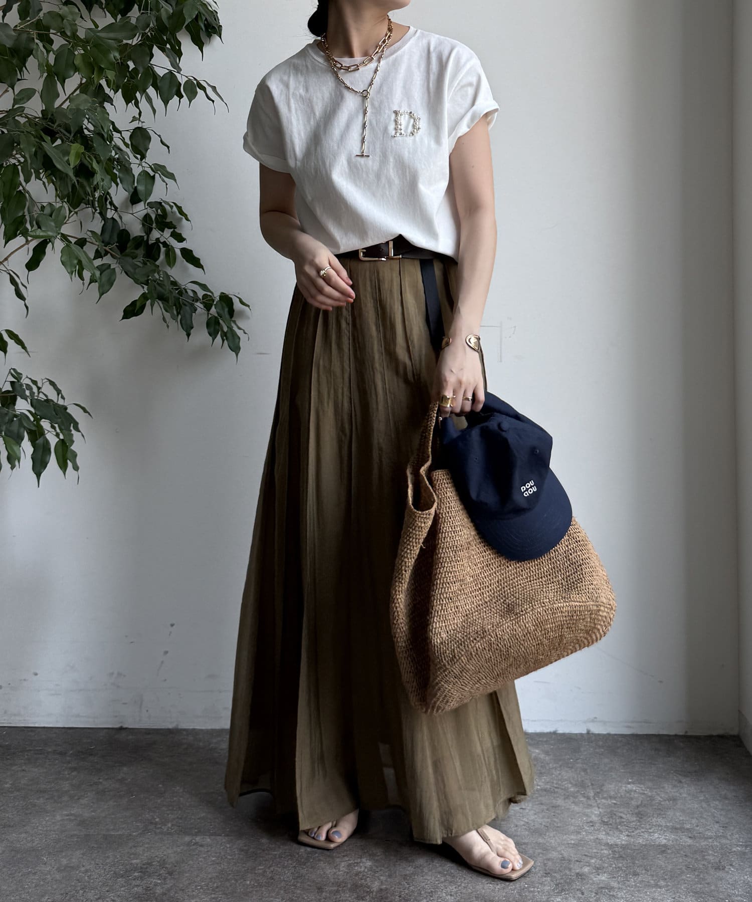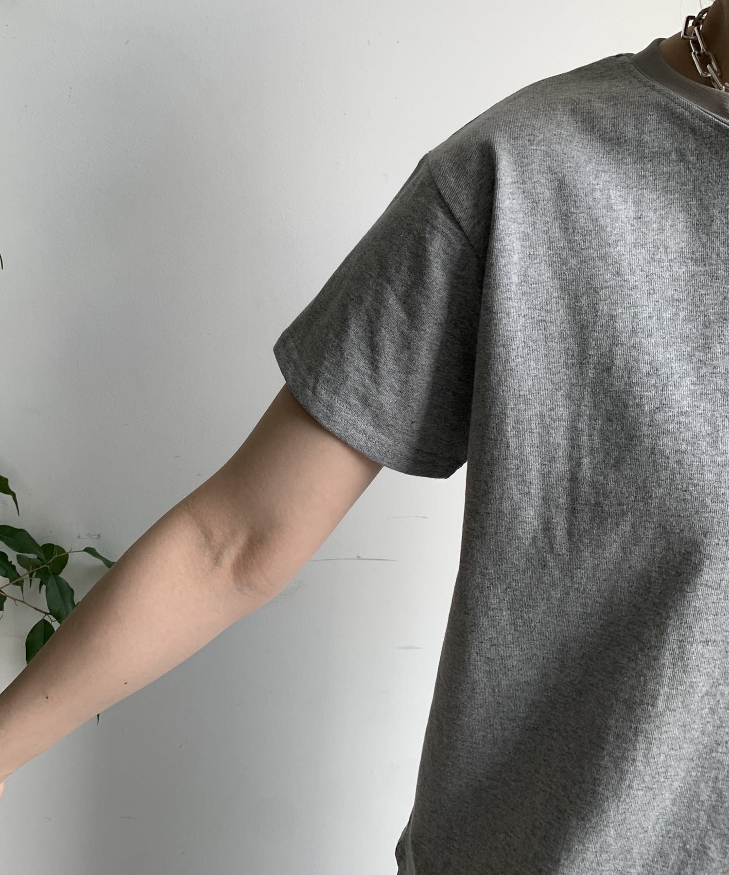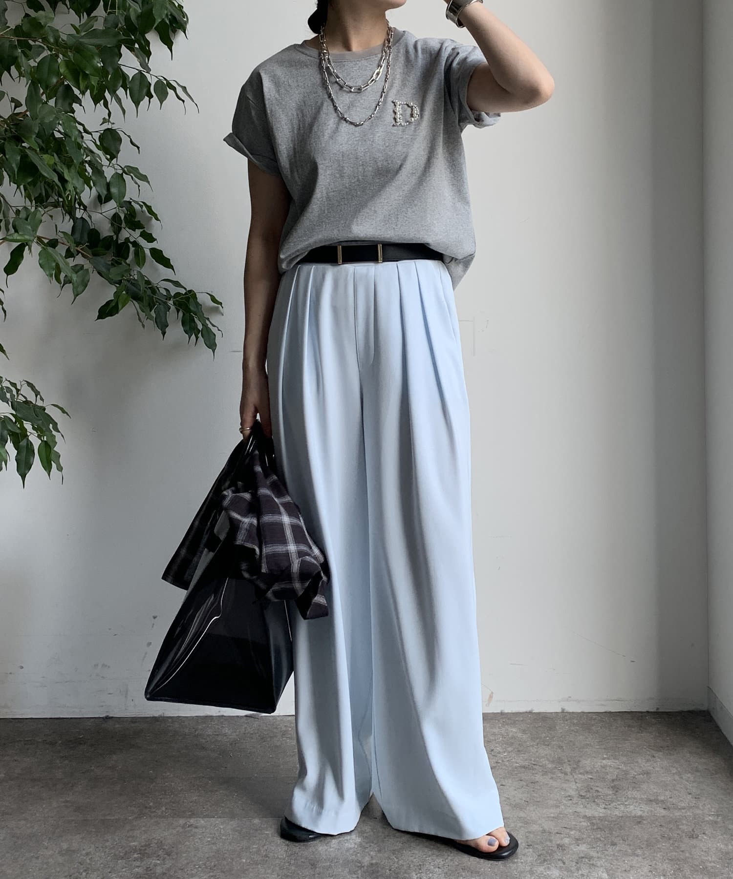 一見シンプルなクルーネックTシャツですが、左胸にあしらわれた「D」のイニシャルビジューが、上品なアクセントとして存在感を放ちます。