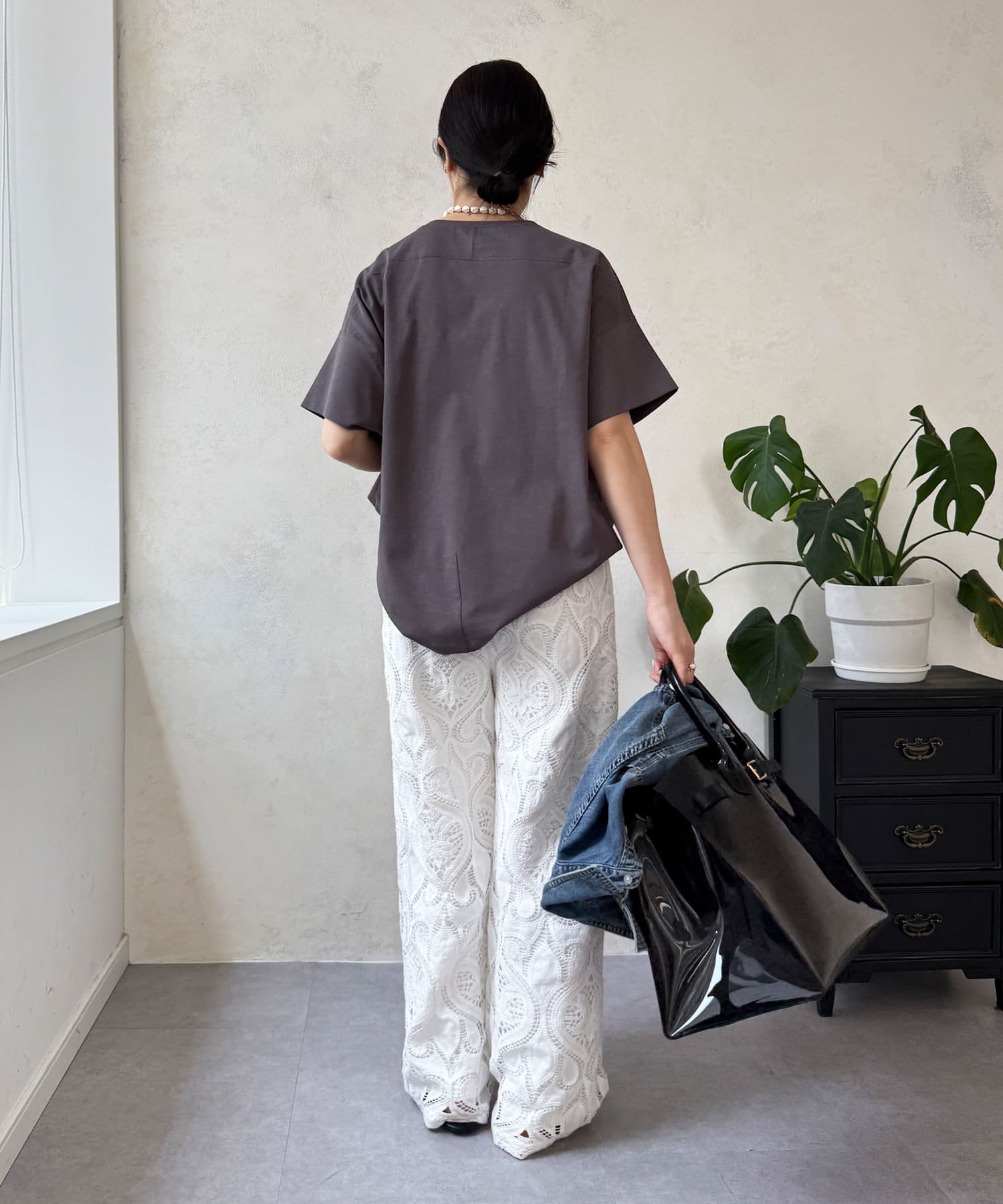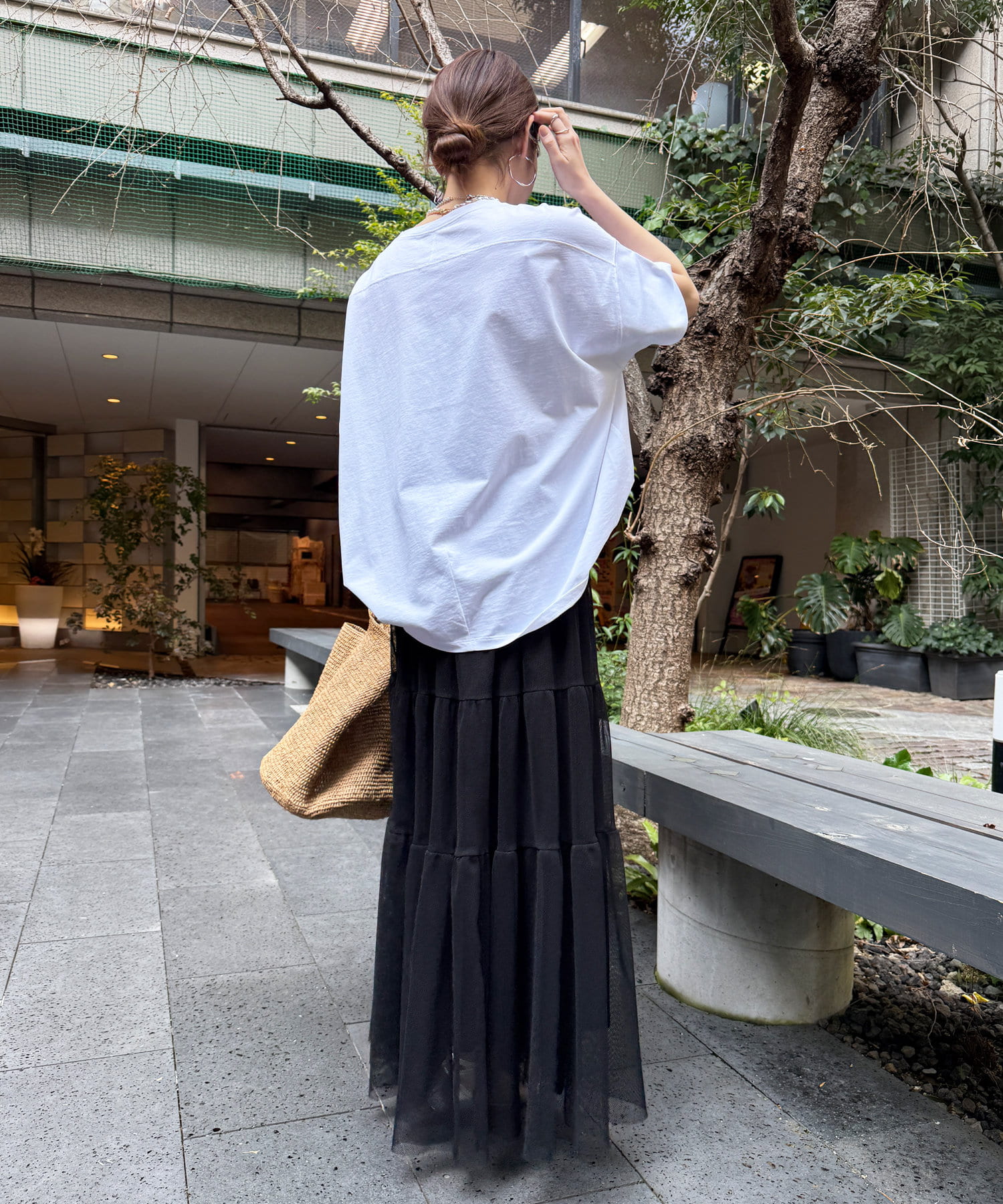 ワイドなシルエットで、身体のラインを拾いにくく、リラクシーに着ていただけます。