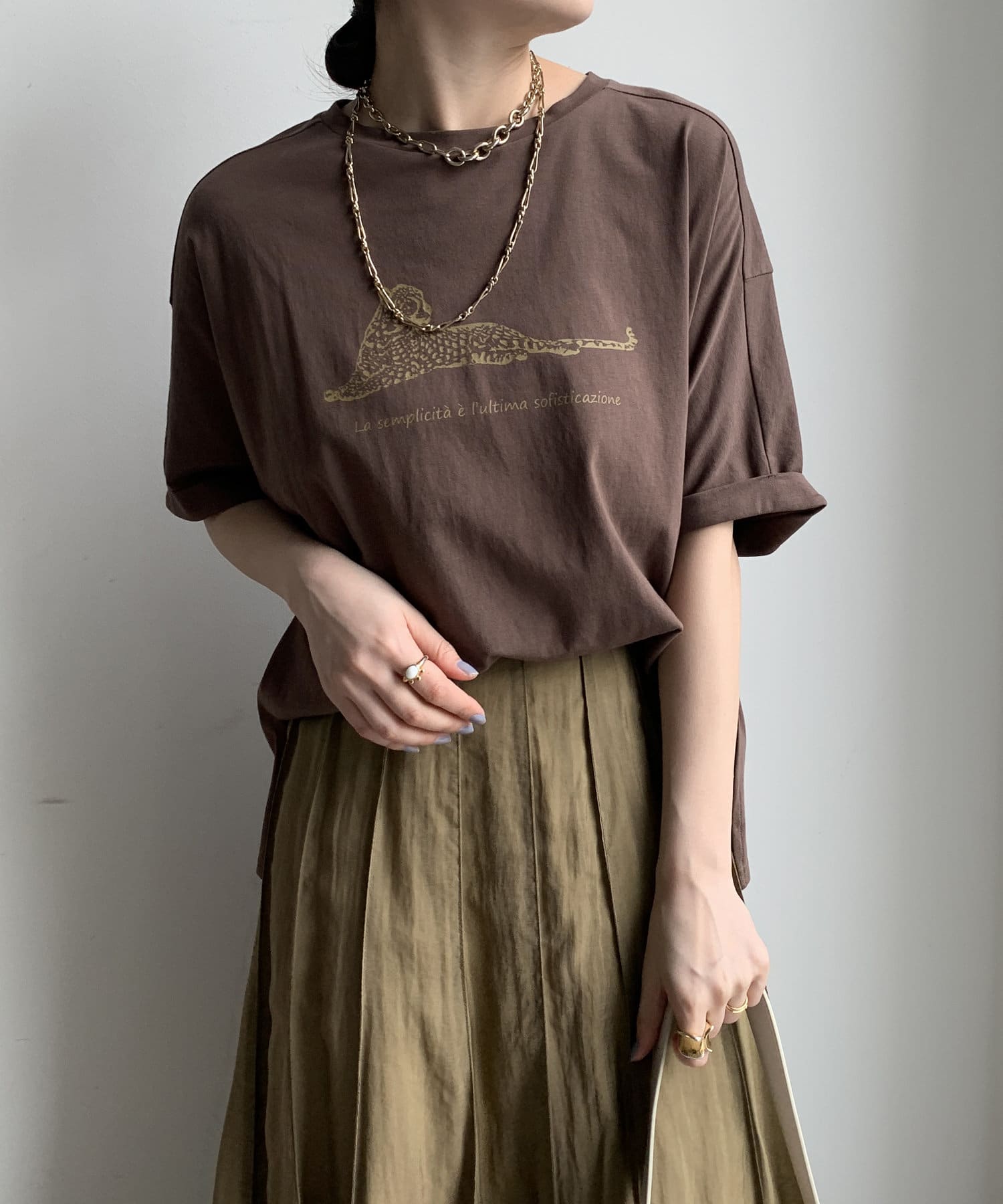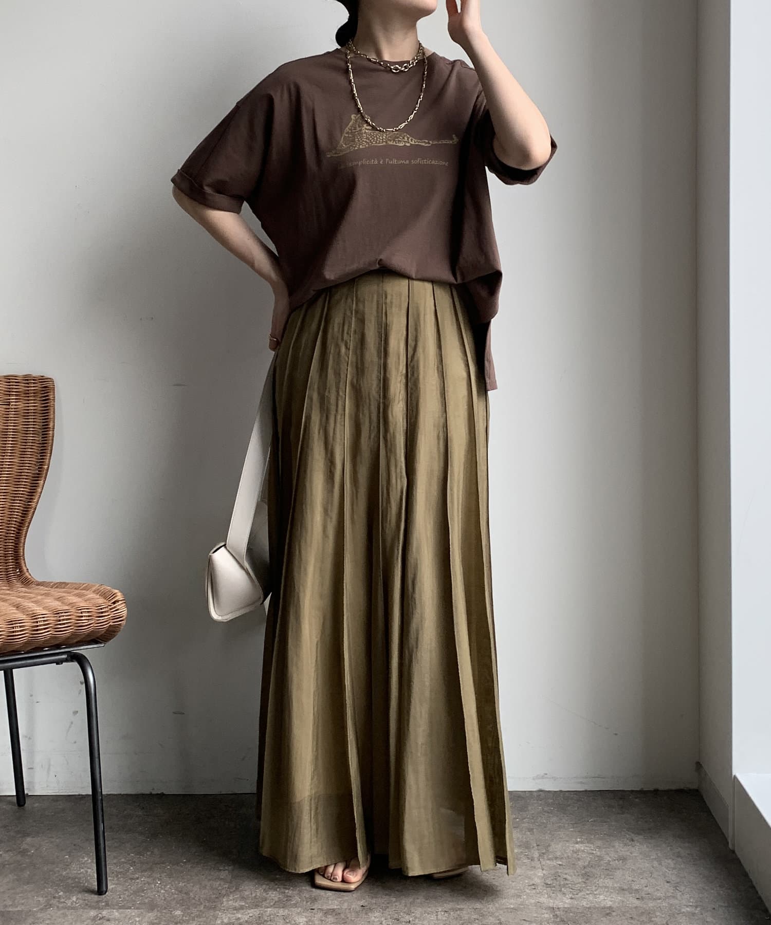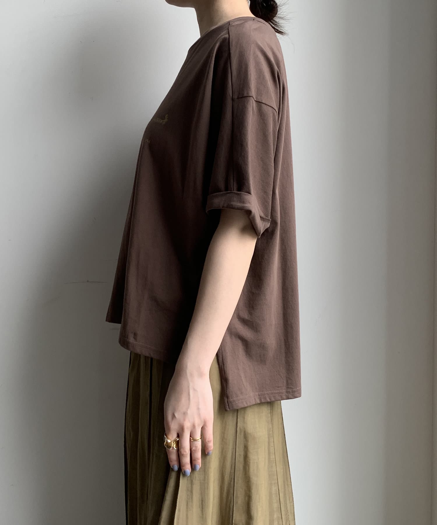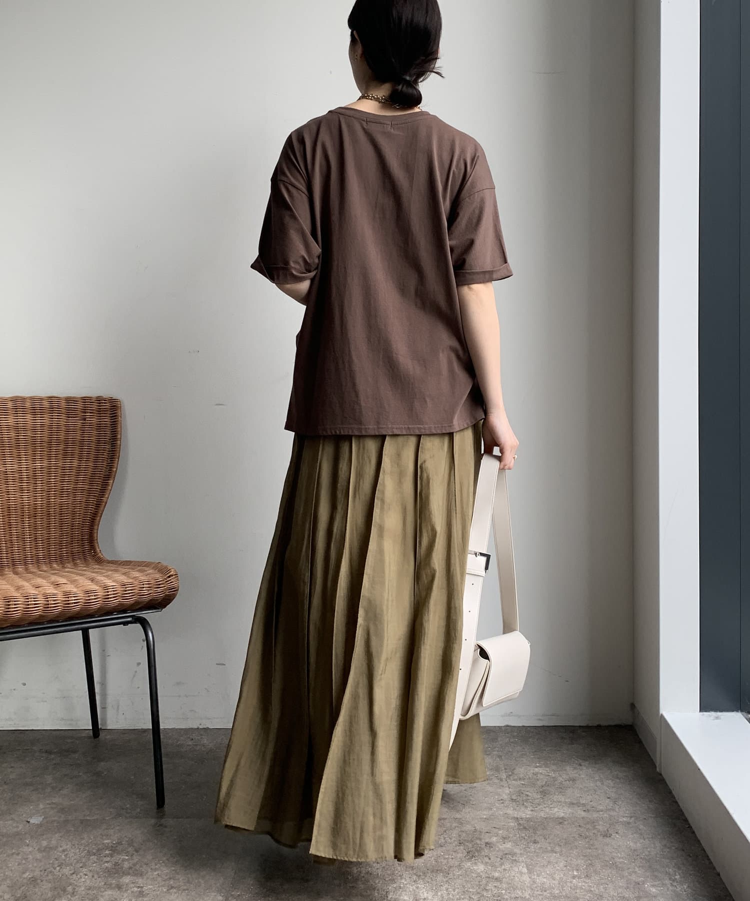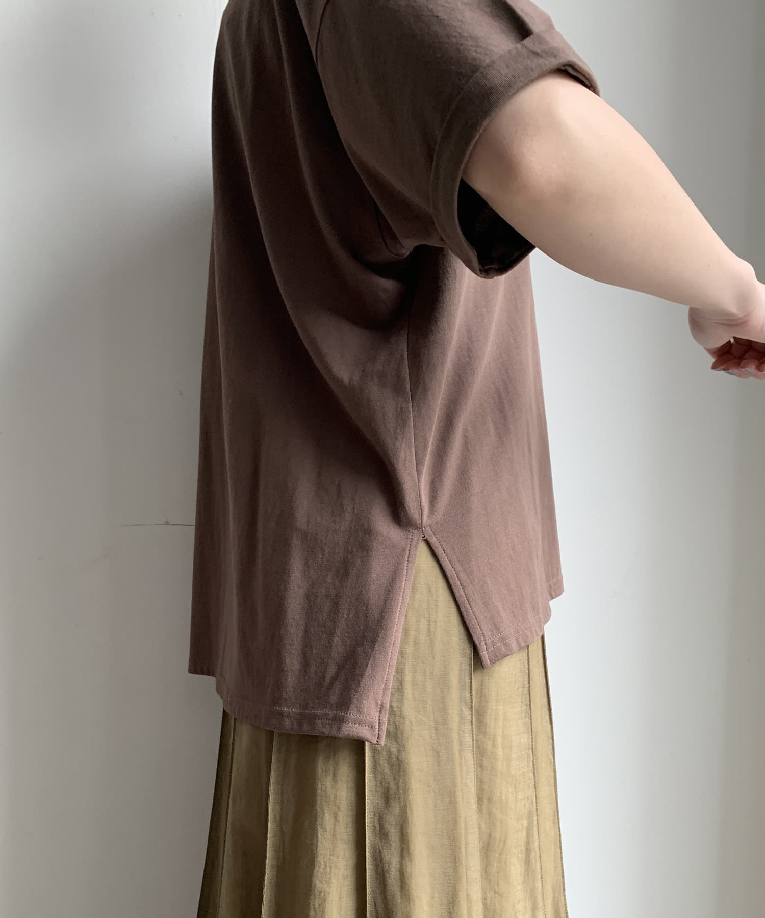 ブラウンの色味も綺麗で生地感もサラッとしてて大人にTシャツです。首元の空きもちょうど良い。この素材感のTシャツはずっと定番にしてほしい