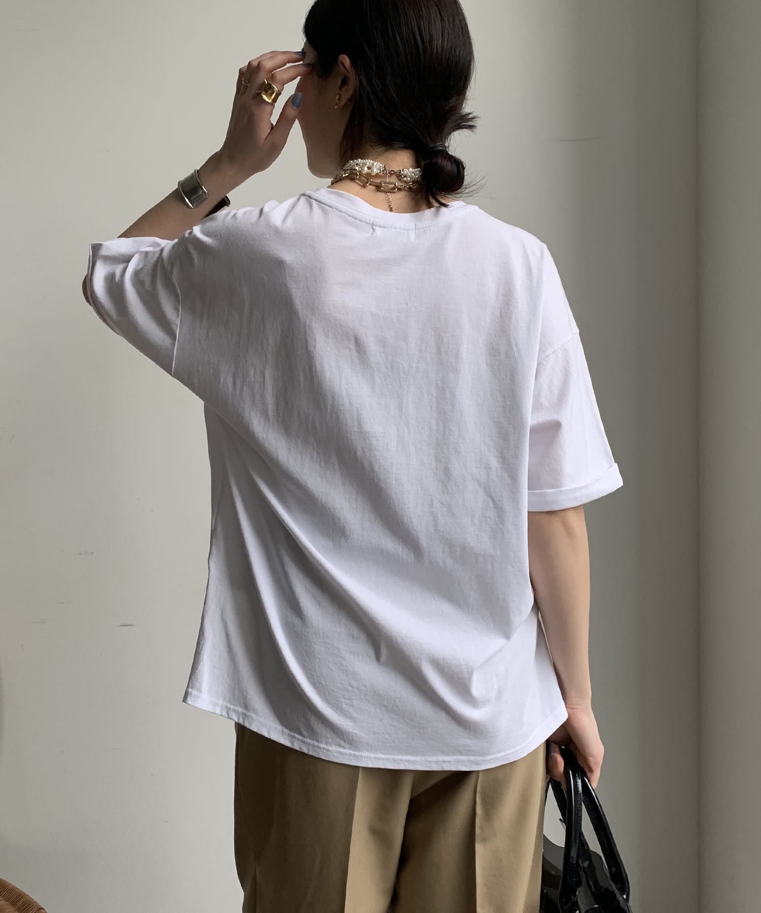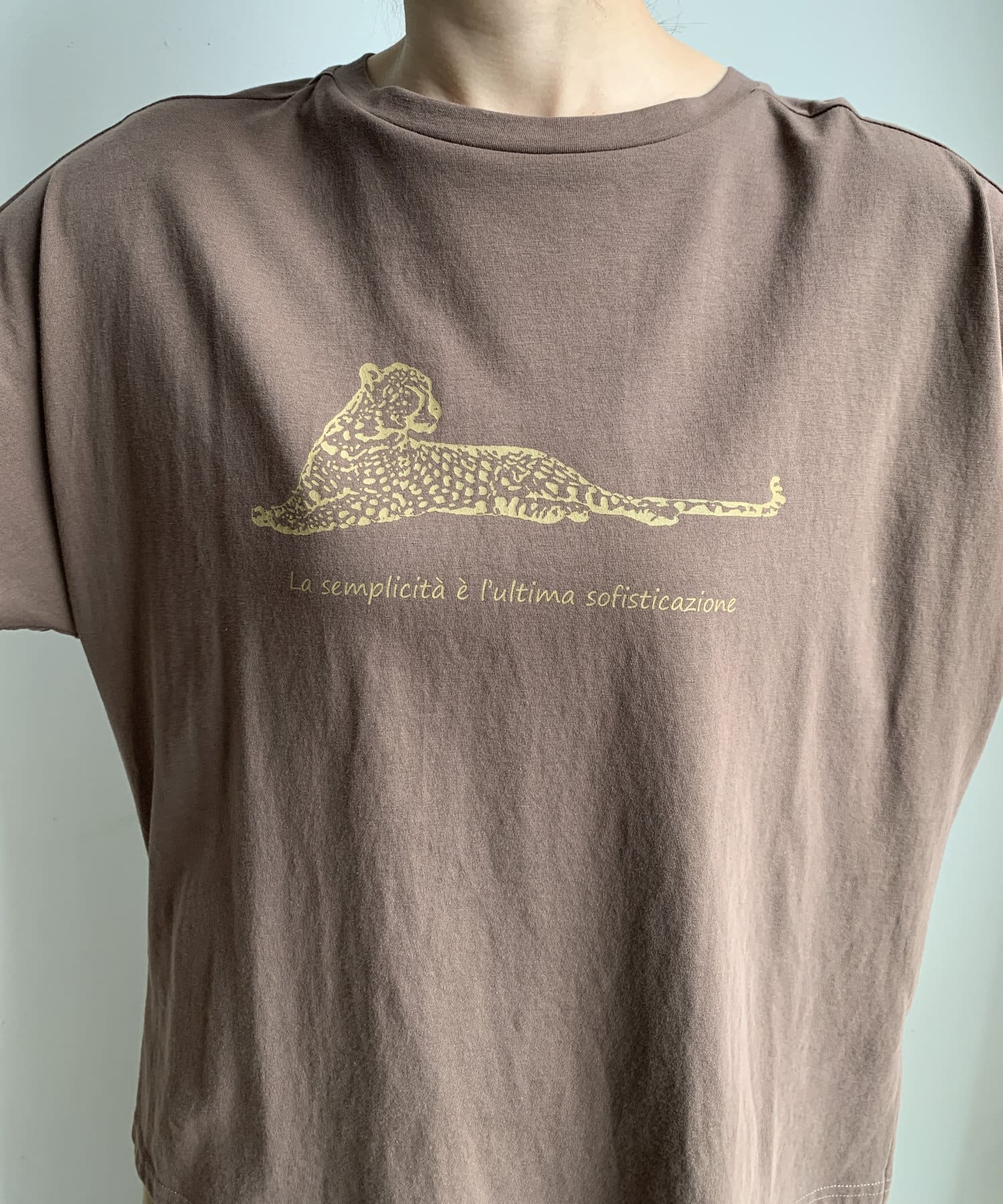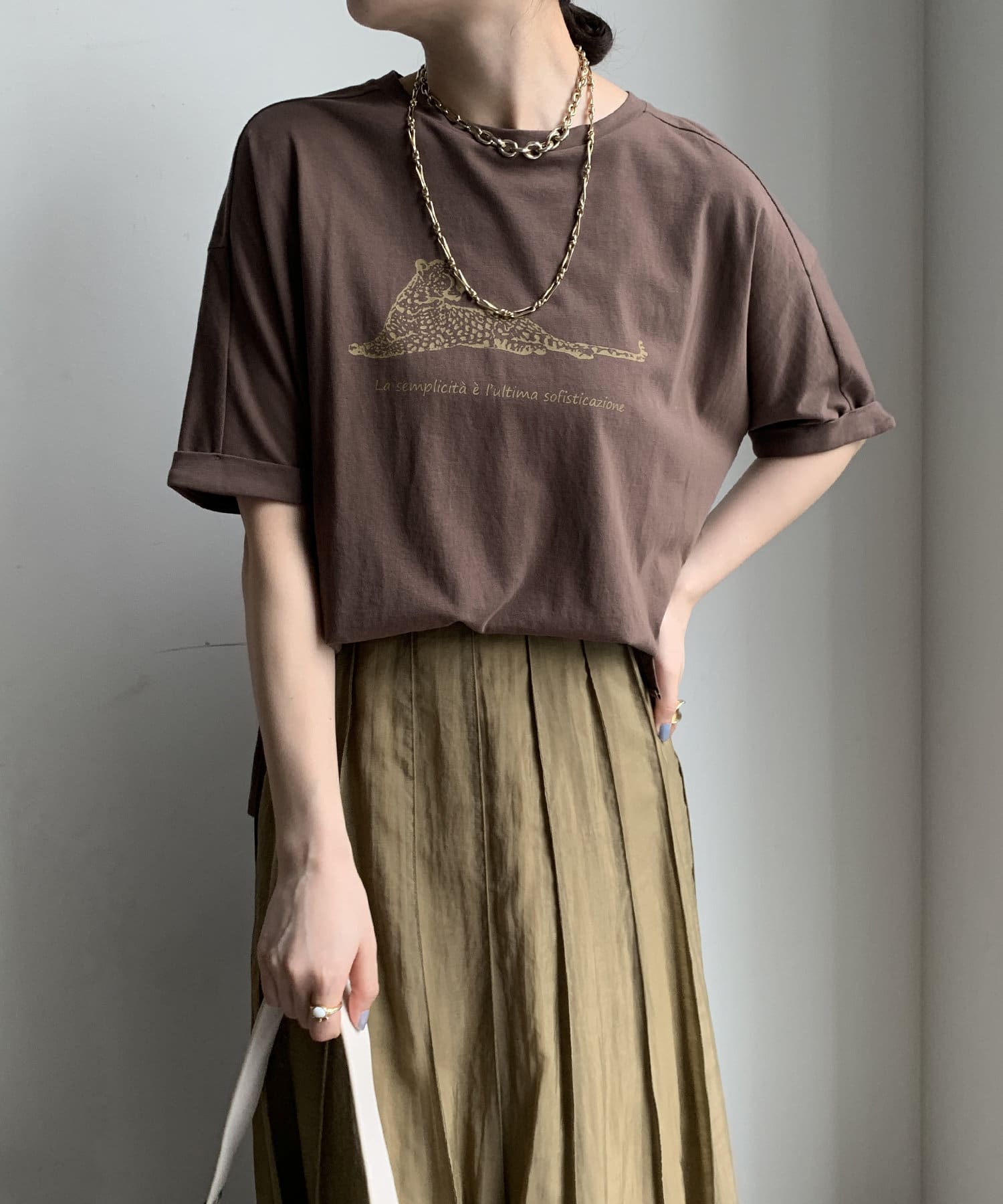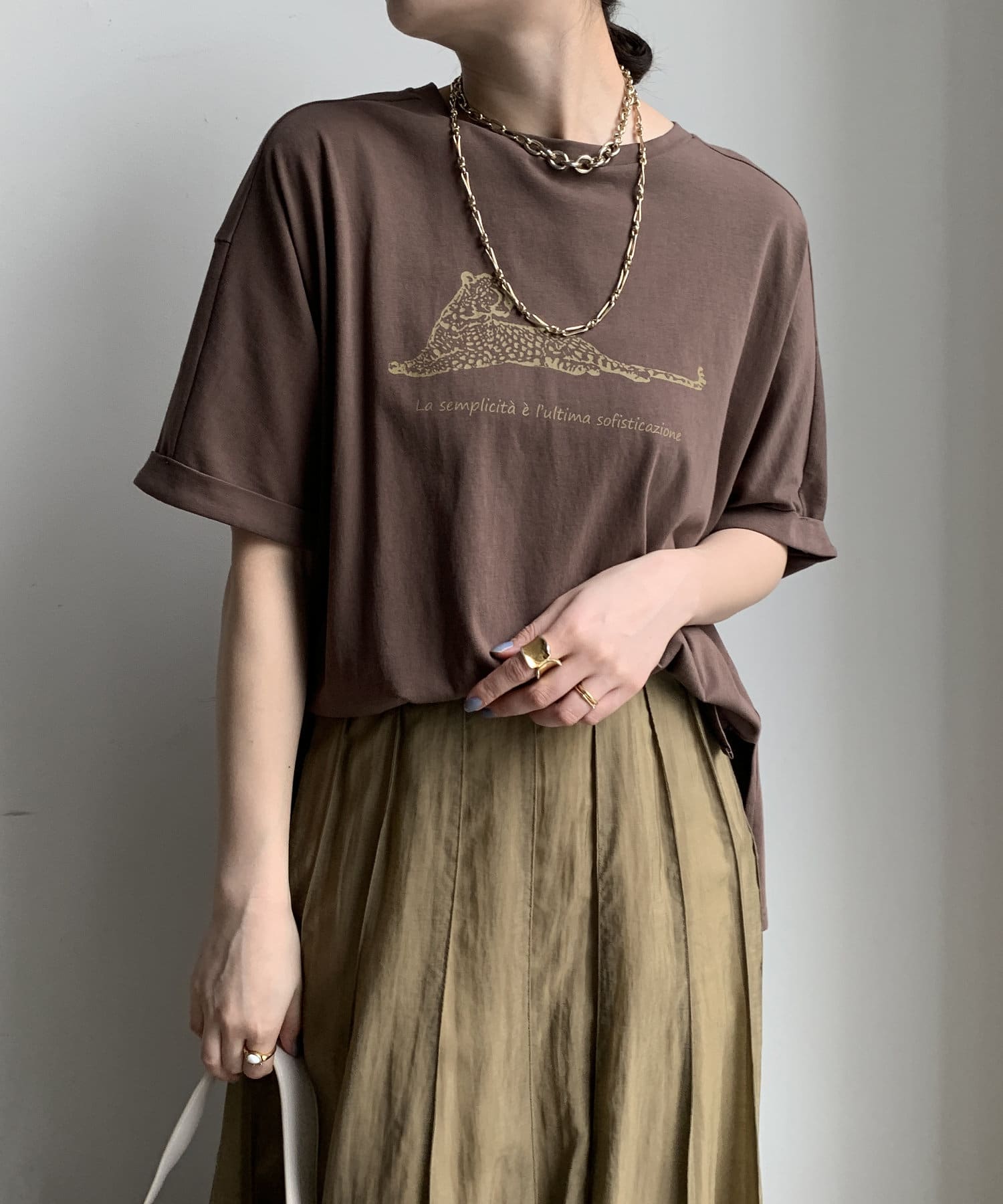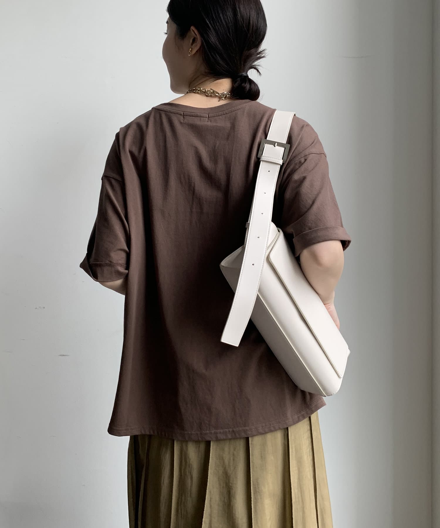 ブラウンの色味も綺麗で生地感もサラッとしてて大人にTシャツです。首元の空きもちょうど良い。この素材感のTシャツはずっと定番にしてほしい