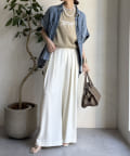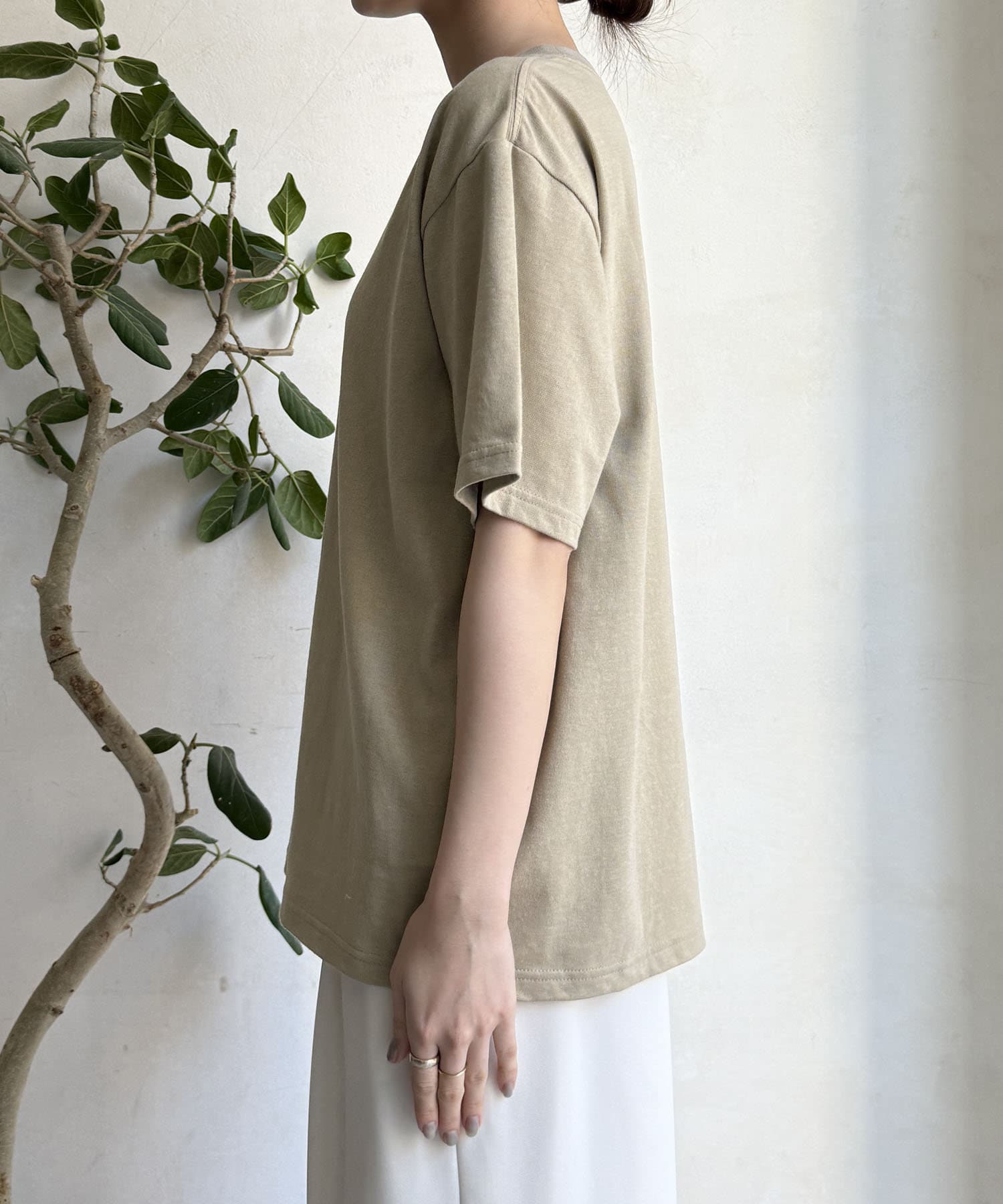 ドロップショルダーのデザインが肩のラインを滑らかに見せ、女性らしい抜け感を演出。