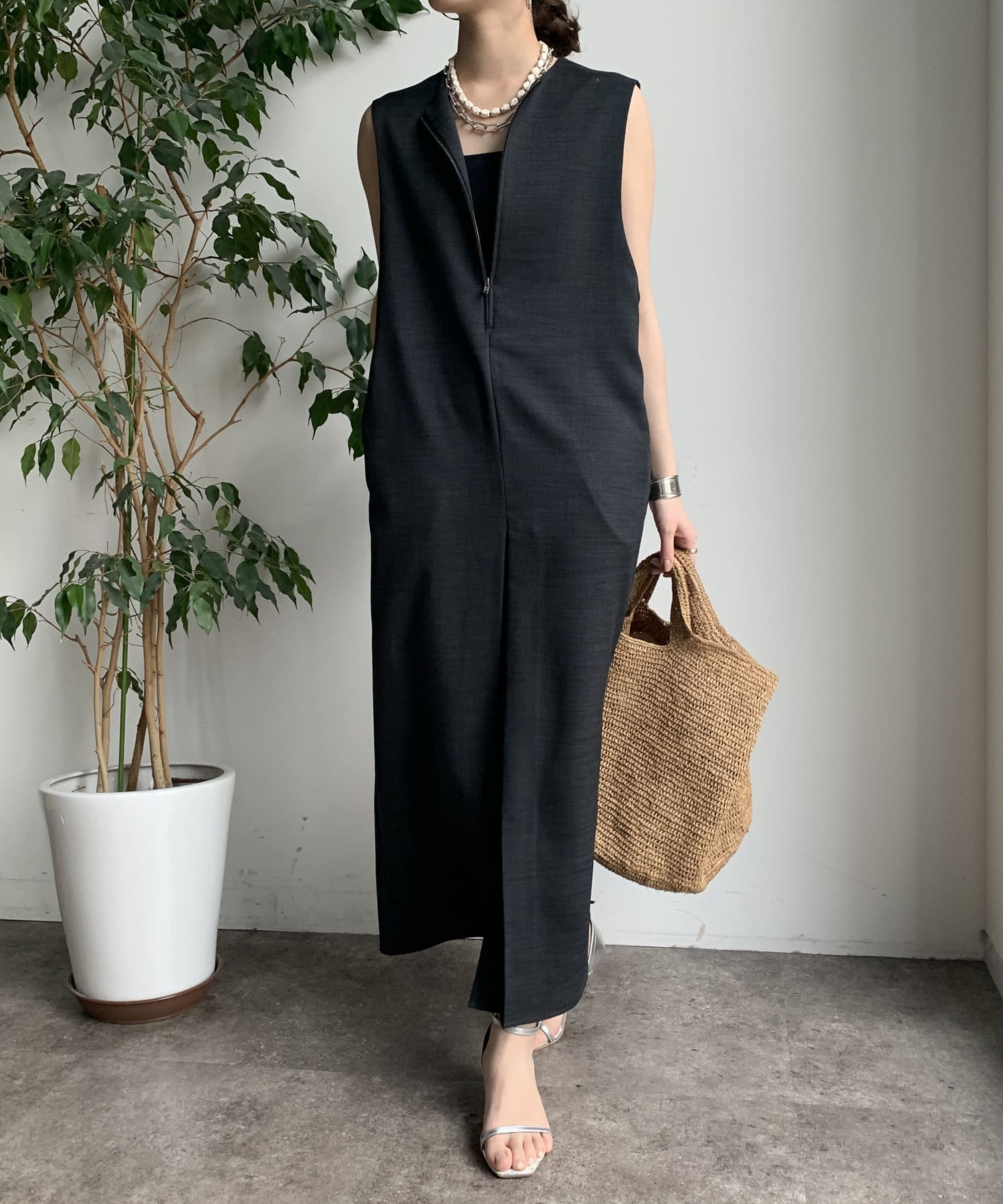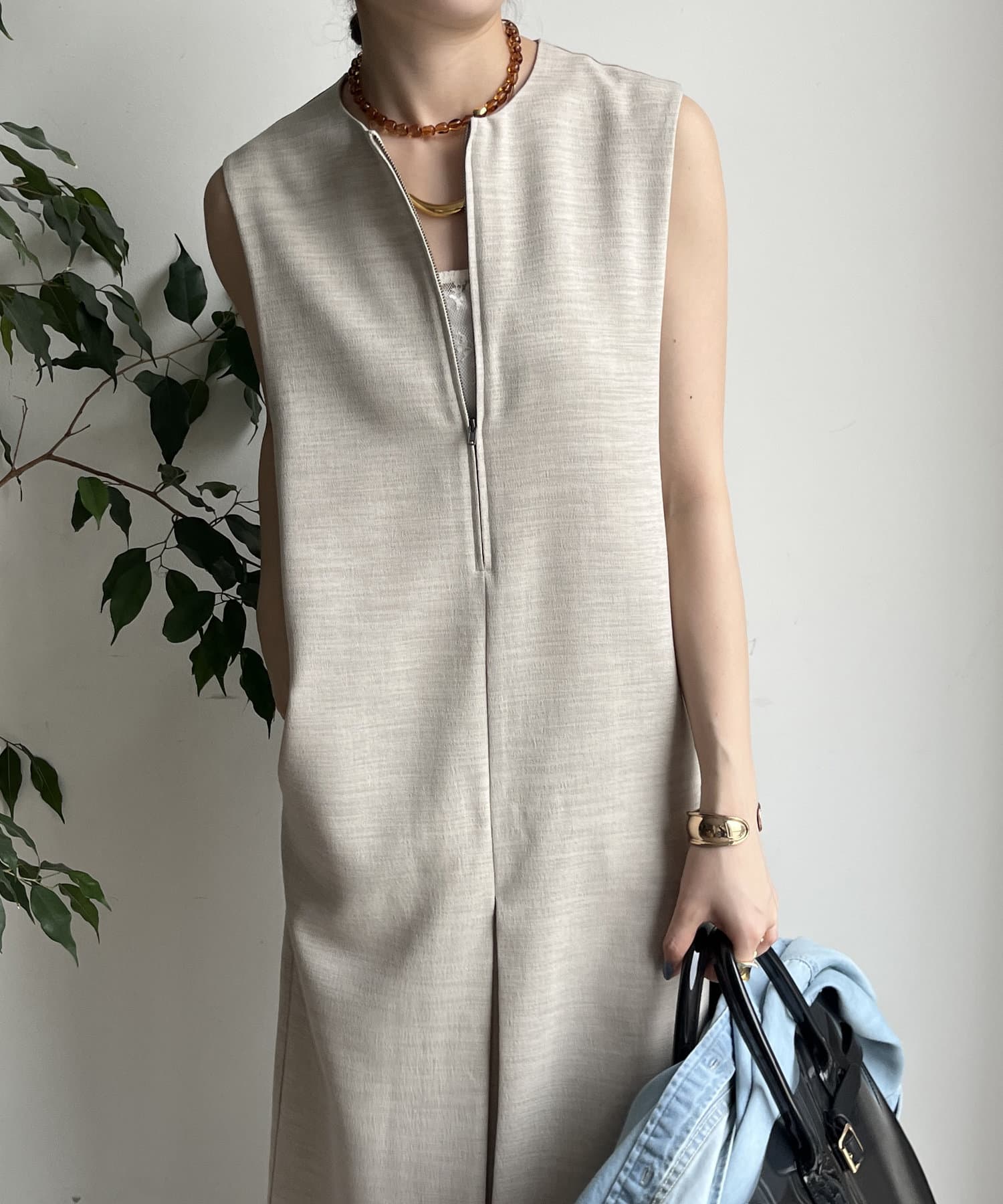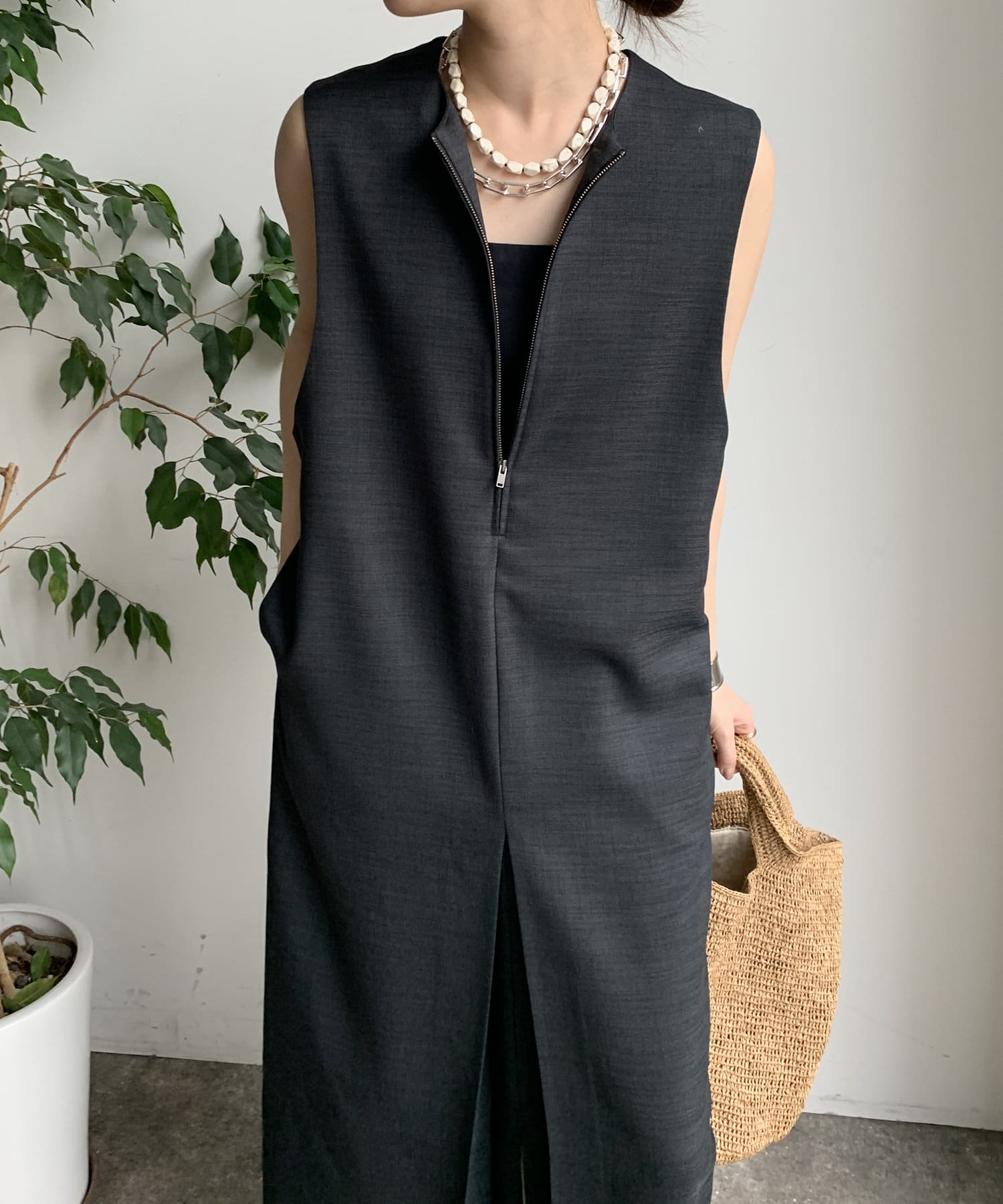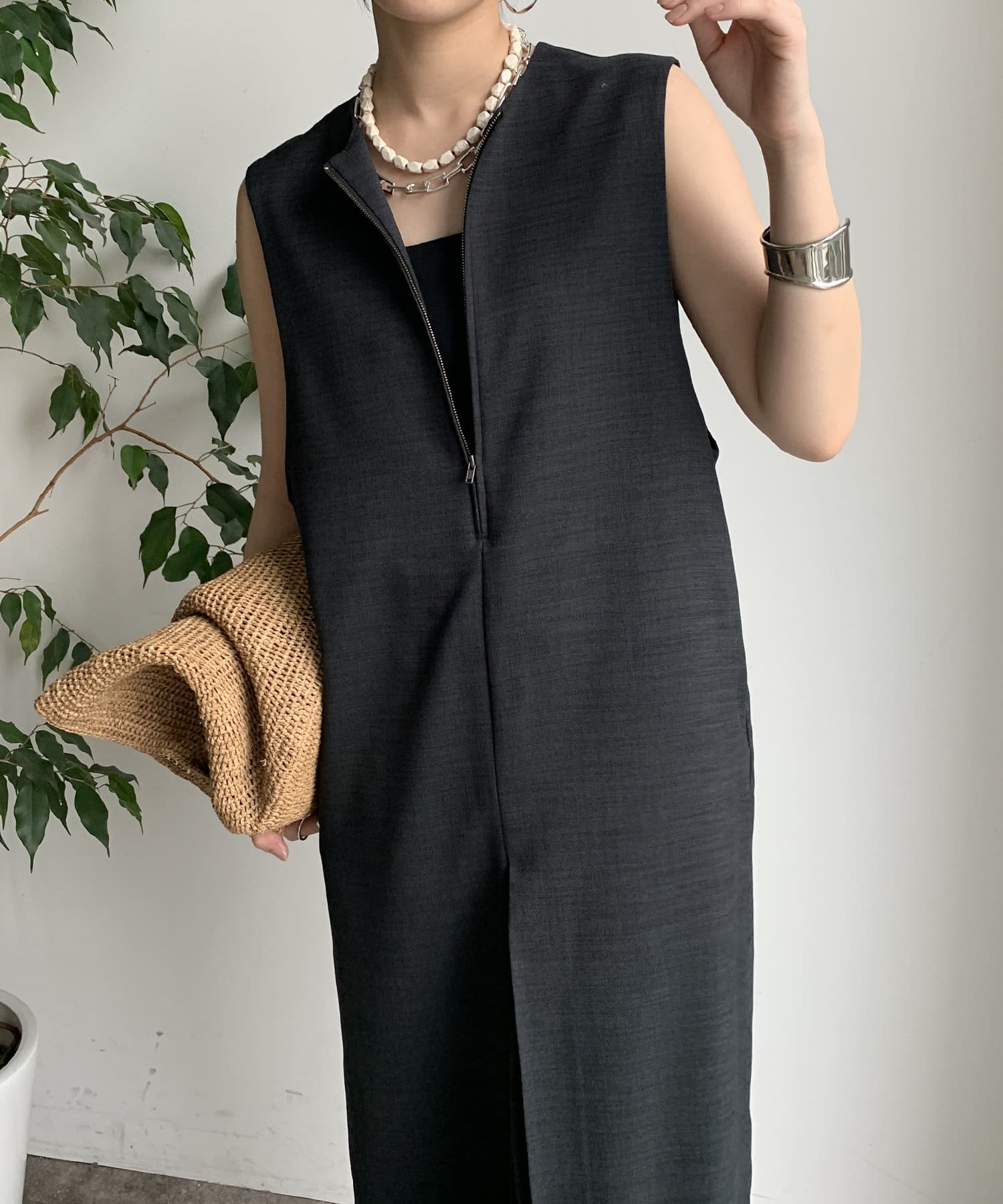 フロントジップがアクセントになったジャンスカは、シンプルなデザインながら1枚で存在感!
