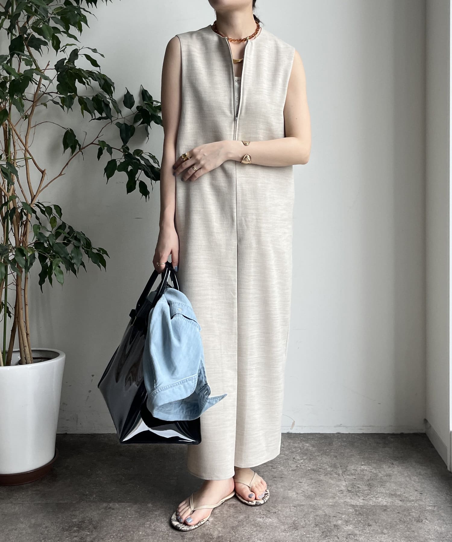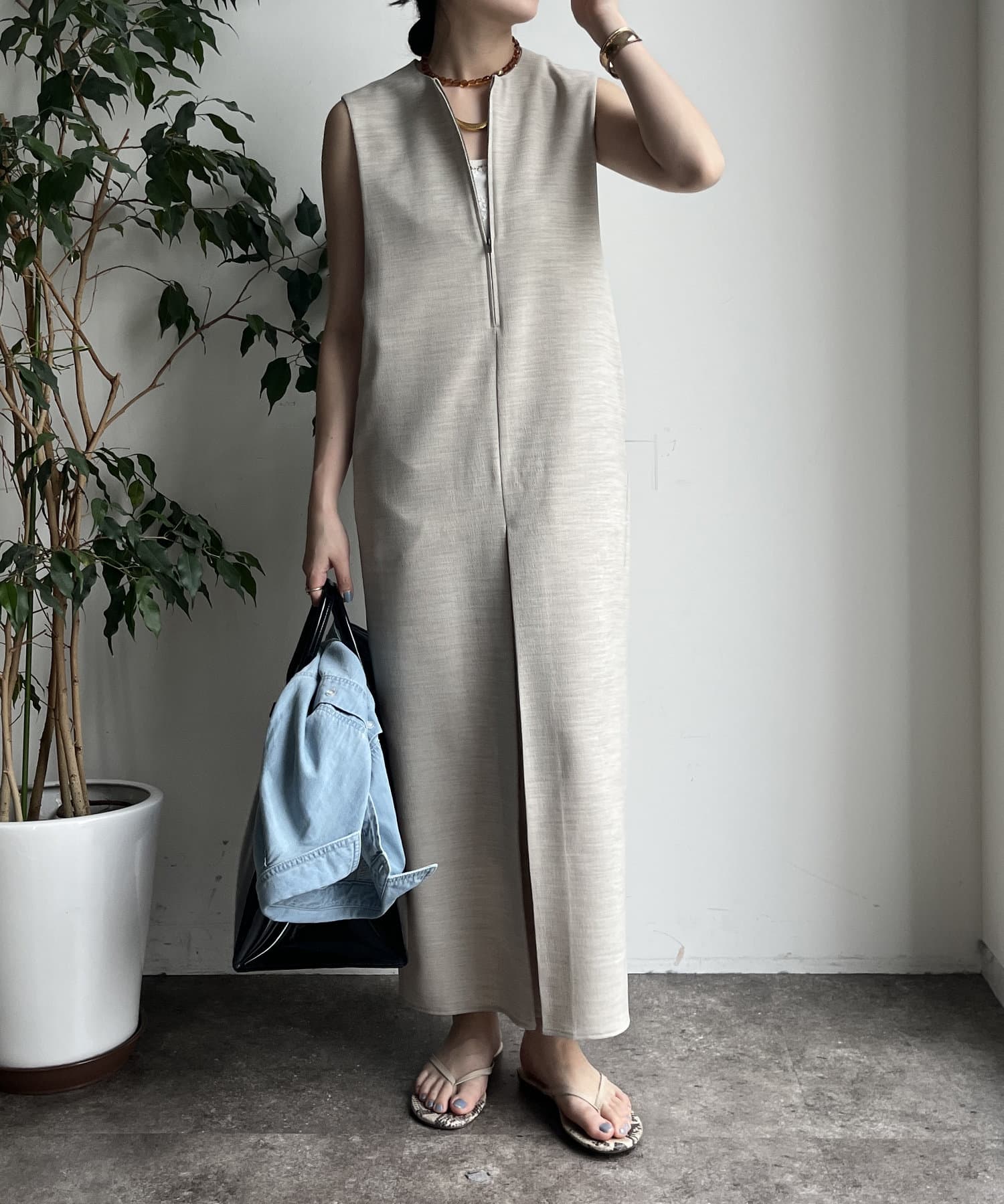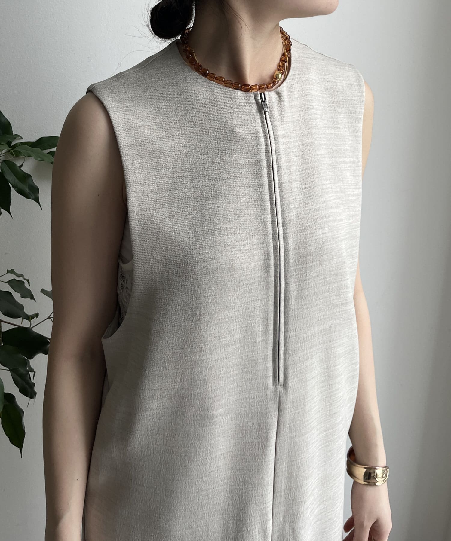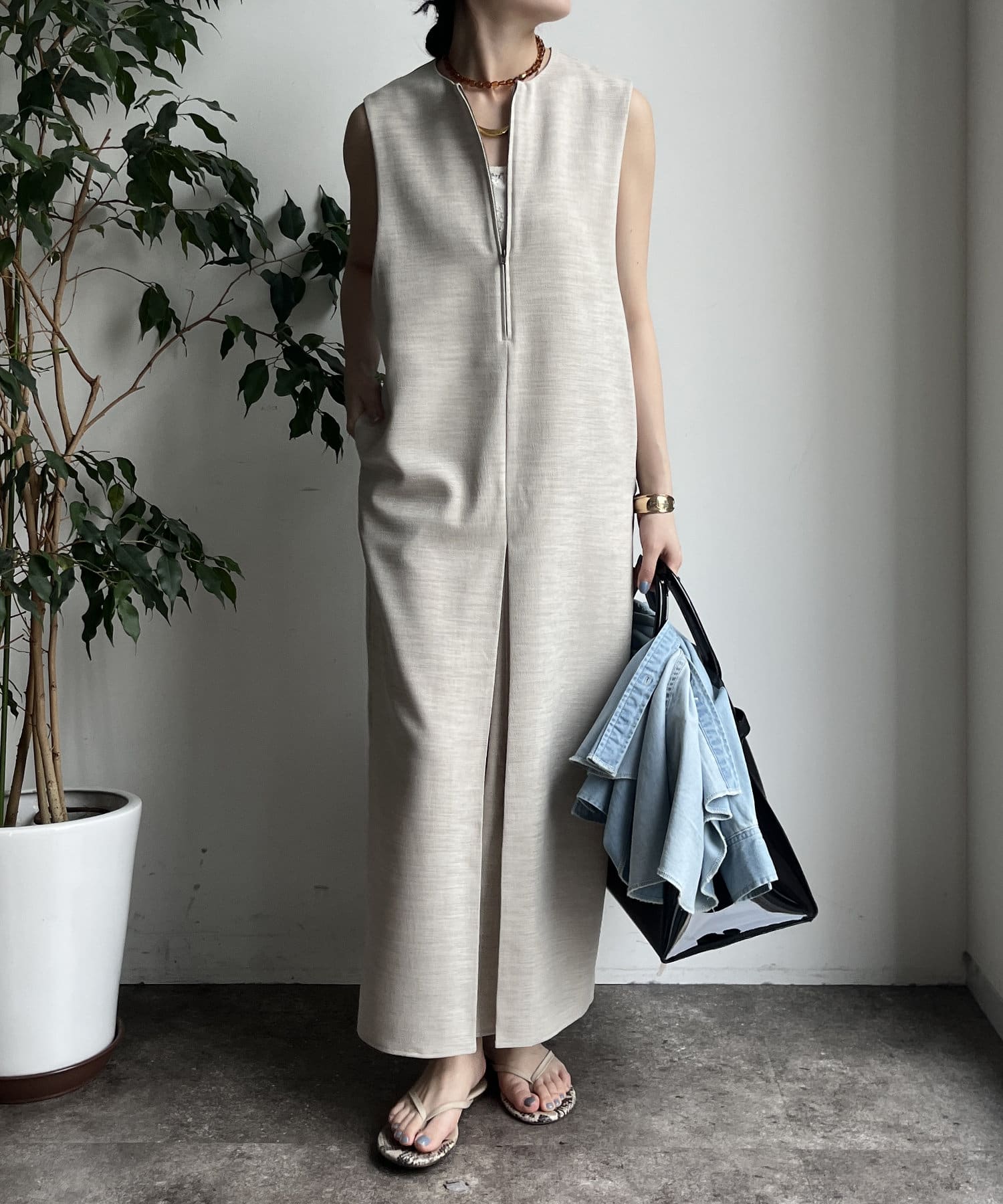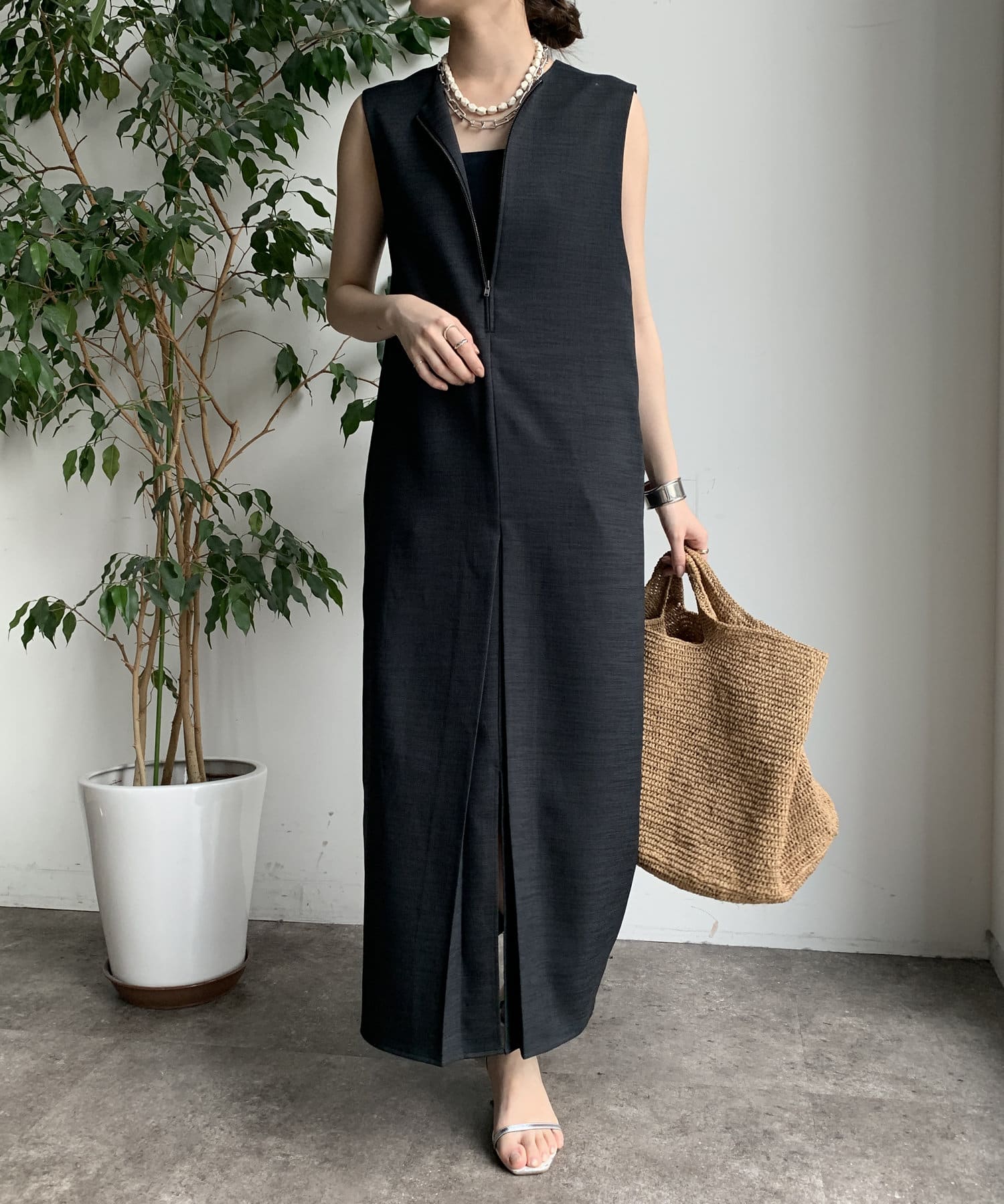 フロントジップがアクセントになったジャンスカは、シンプルなデザインながら1枚で存在感!