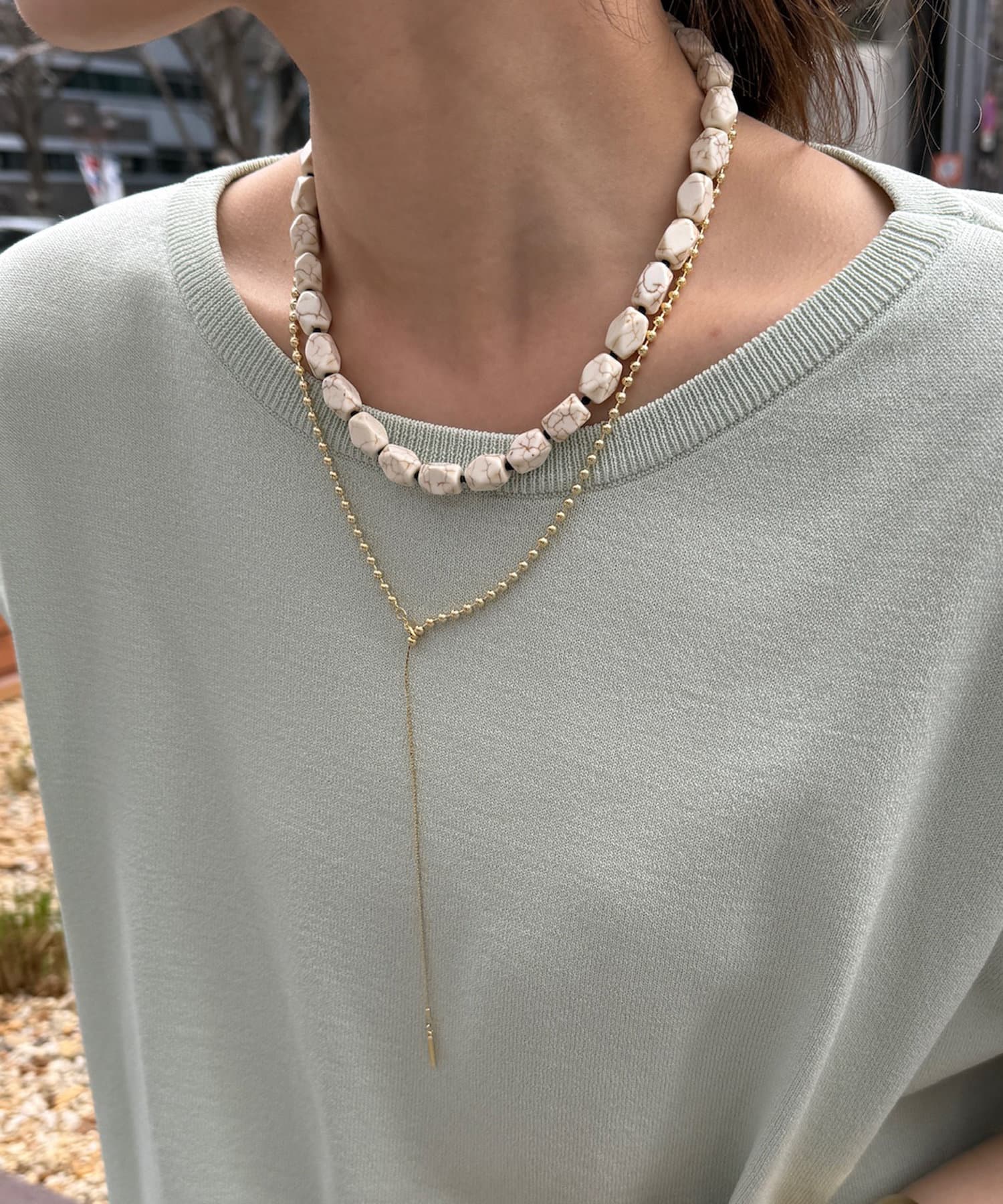 二つ目のスタイルは、Y字のパーツを調整することで、ベーシックなラウンドネックレスとしてもお使いいただけます。
