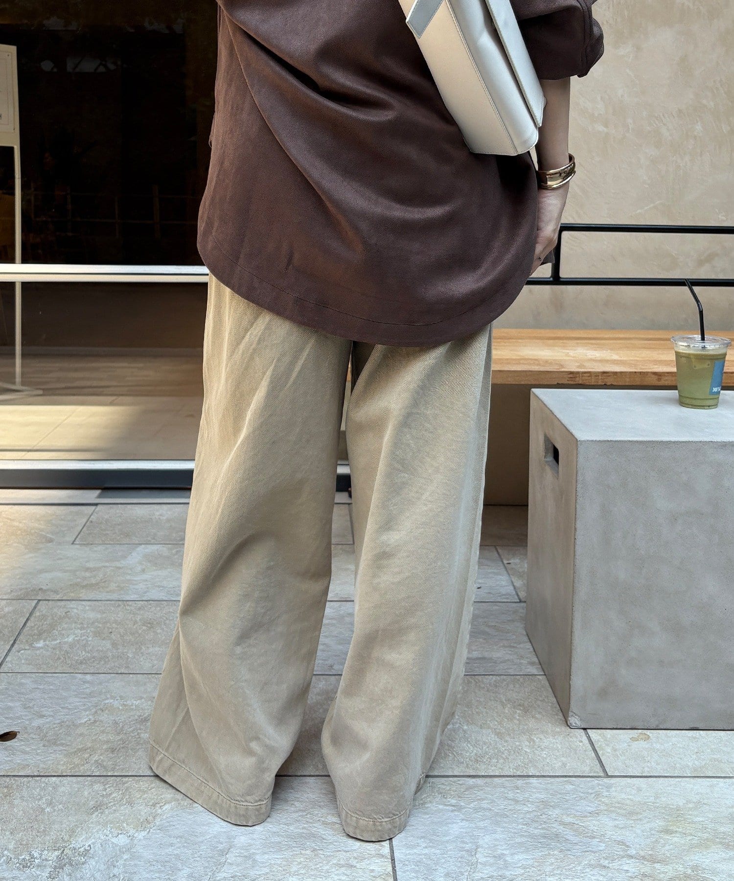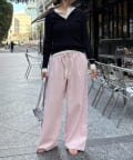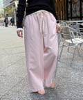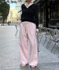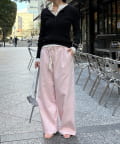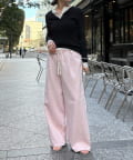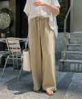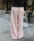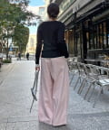 両サイドの切替ラインは裾に向かって内側に入っていくデザインで、脚のラインをきれいに見せてくれ、ウエスト部分にはタックを施しているので、自然と落ち感の出るシルエットを作り上げます。