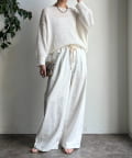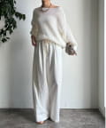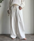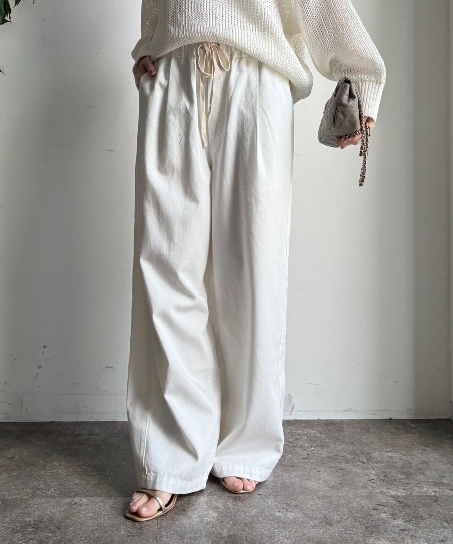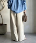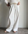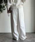 両サイドの切替ラインは裾に向かって内側に入っていくデザインで、脚のラインをきれいに見せてくれ、ウエスト部分にはタックを施しているので、自然と落ち感の出るシルエットを作り上げます。