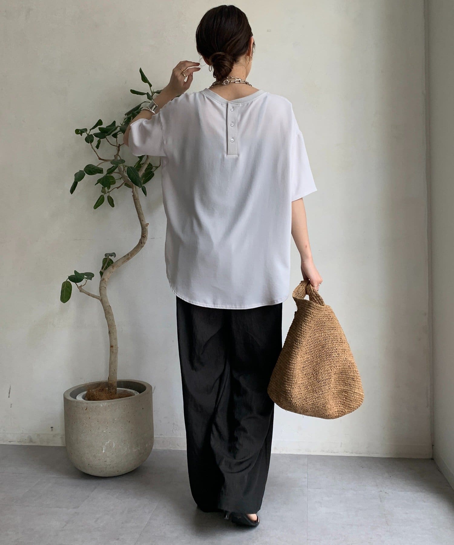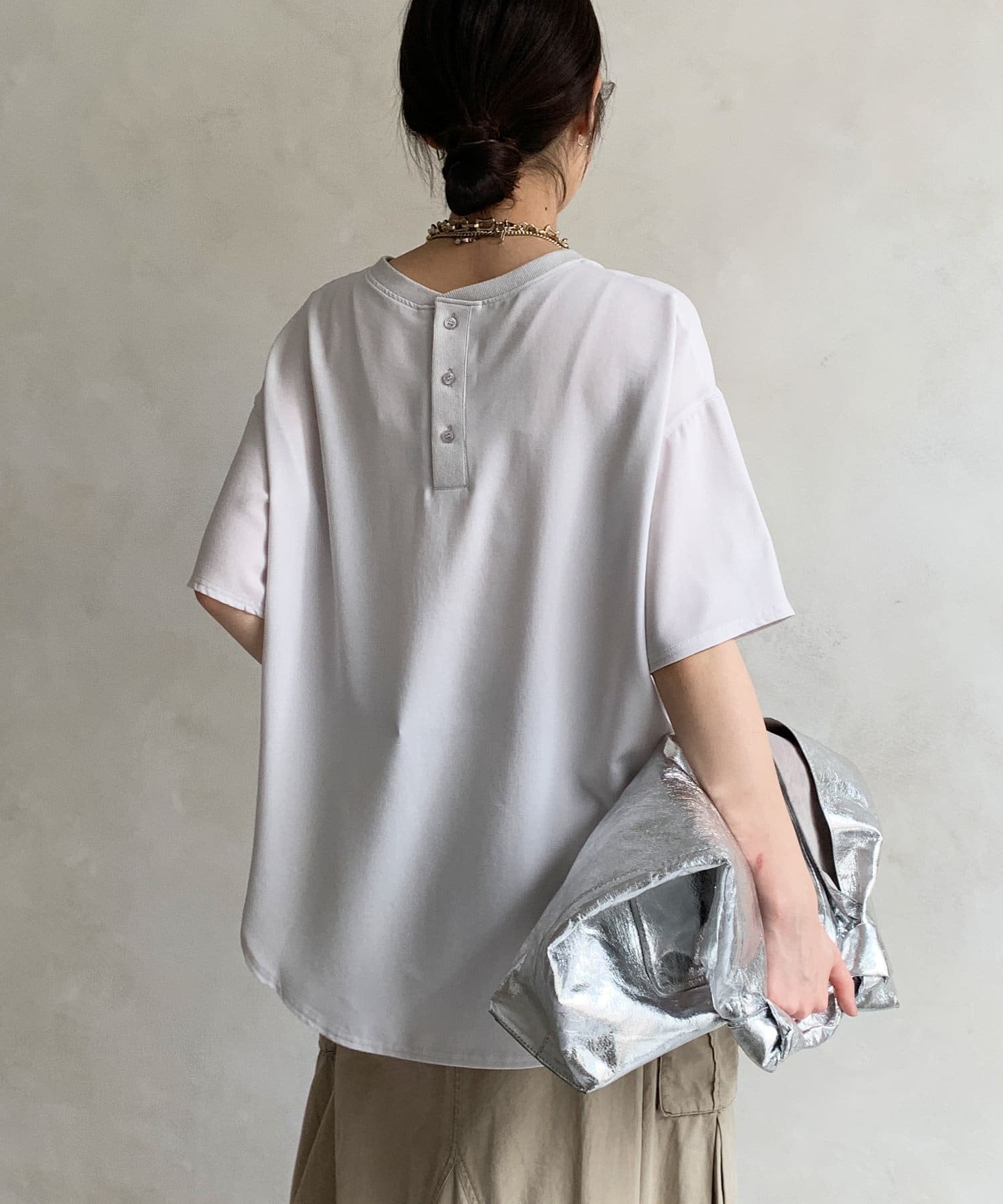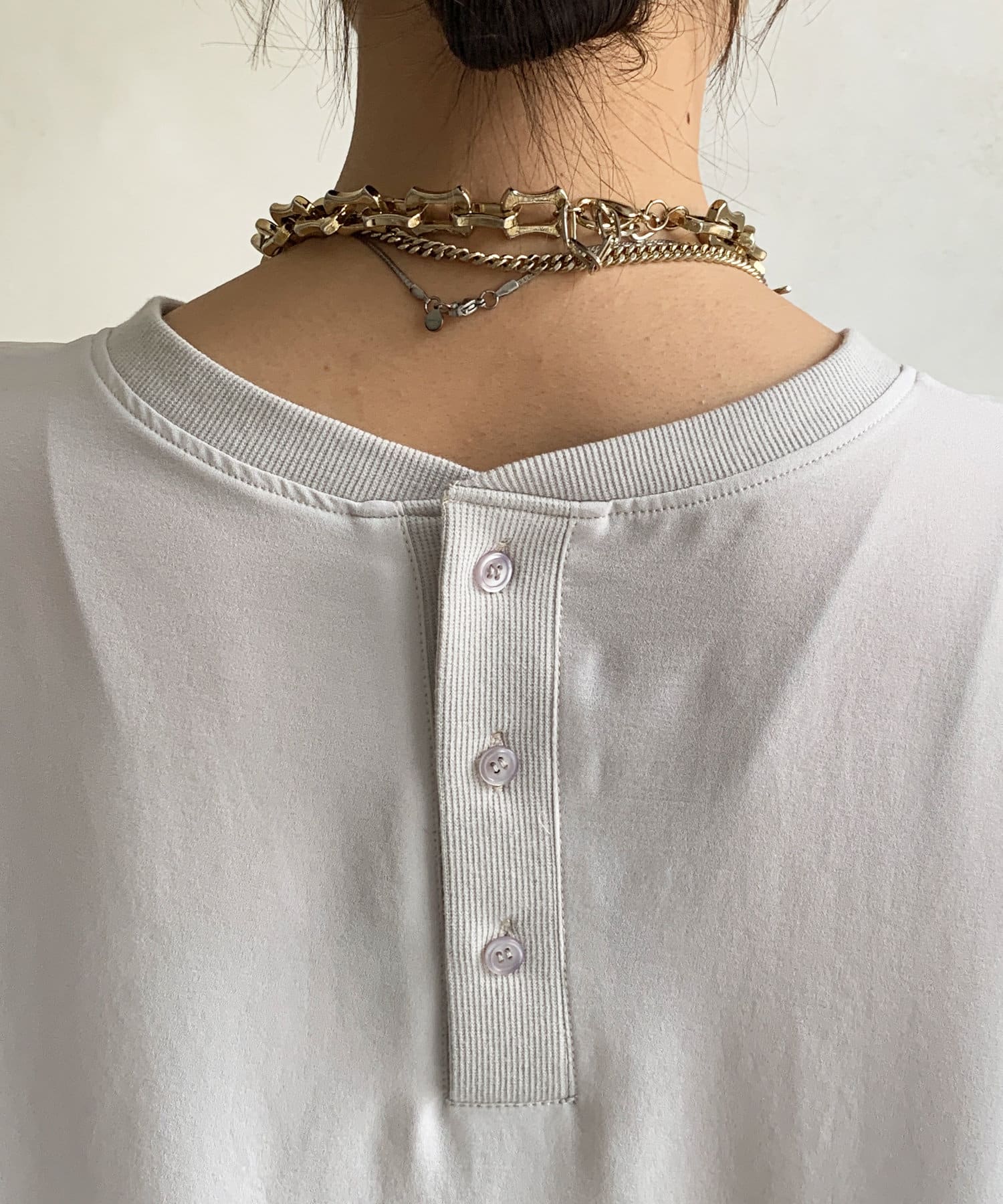 バックネック部分にはボタンのデザインをプラスし、さり気のないポイントになってくれますよ。