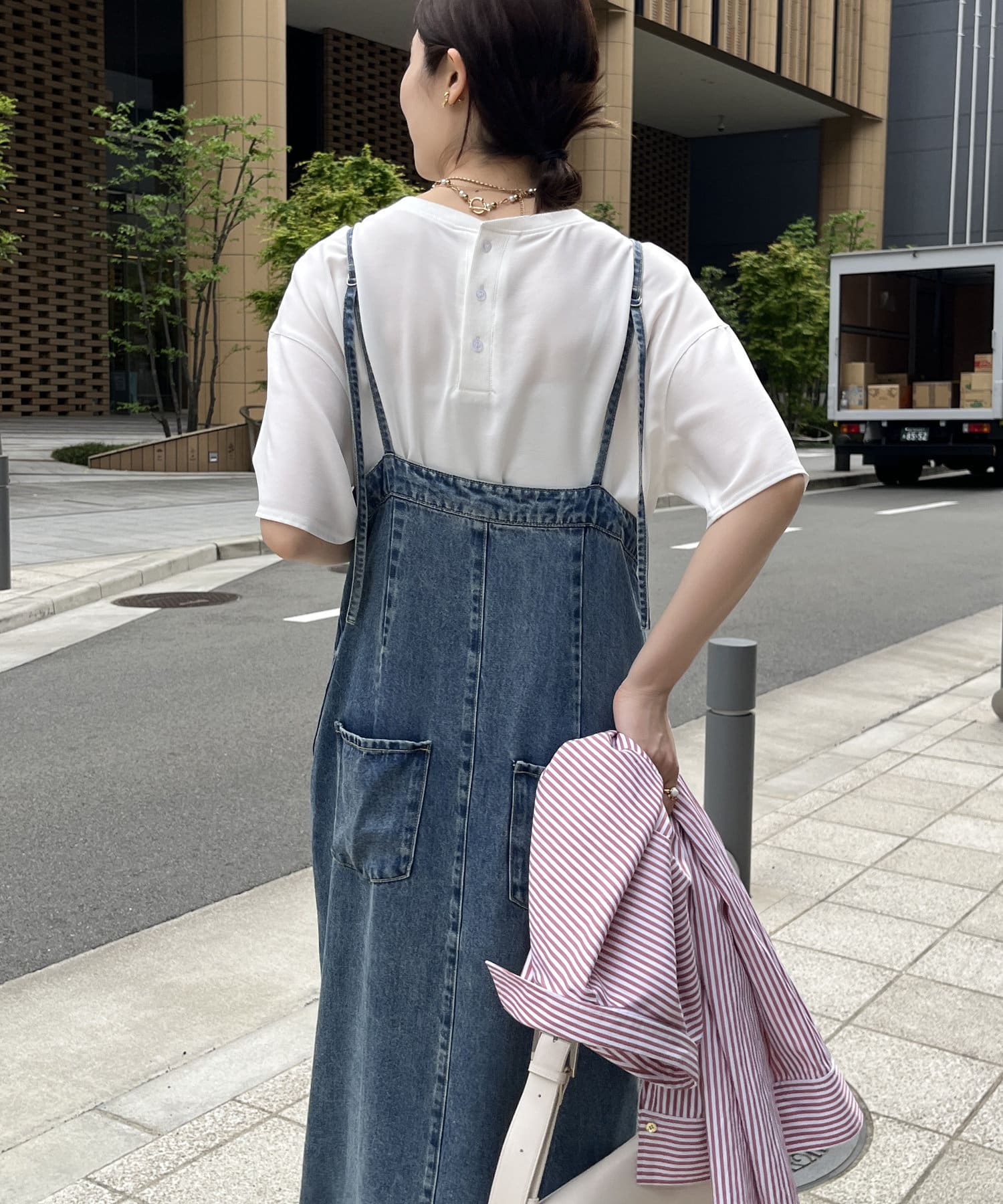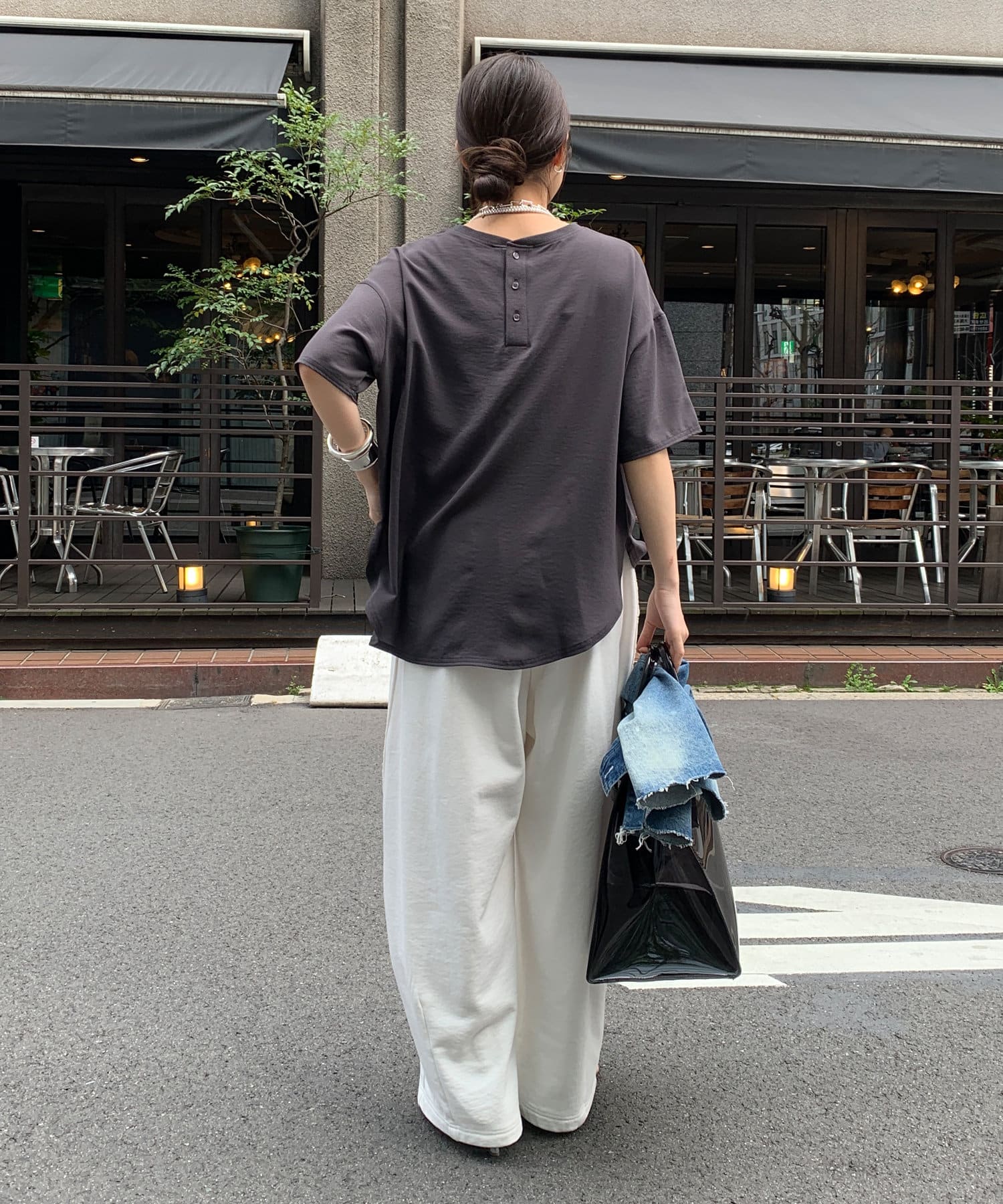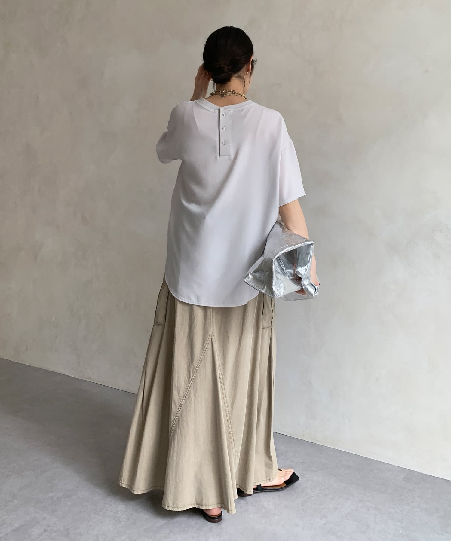 バックネック部分にはボタンのデザインをプラスし、さり気のないポイントになってくれますよ。