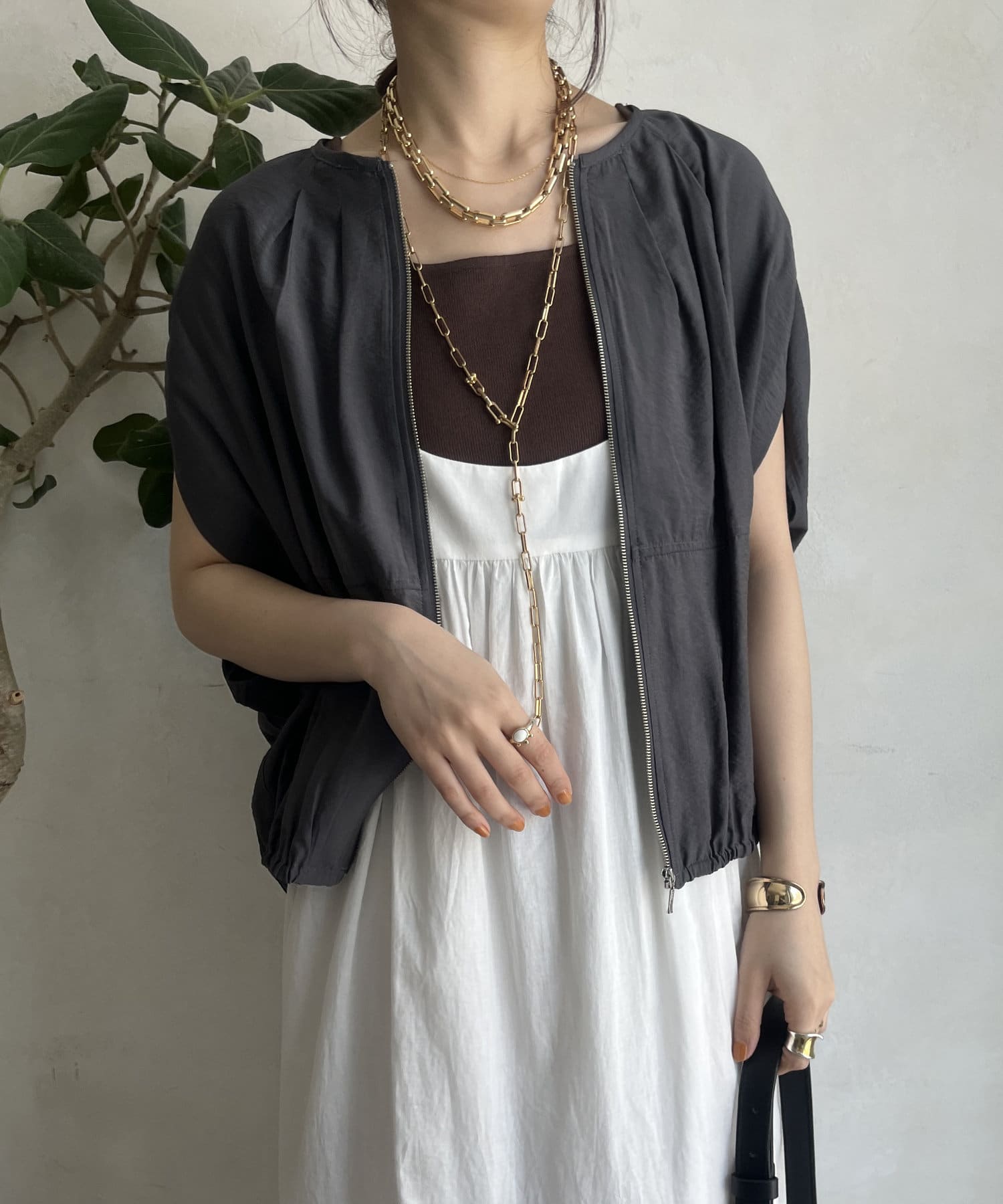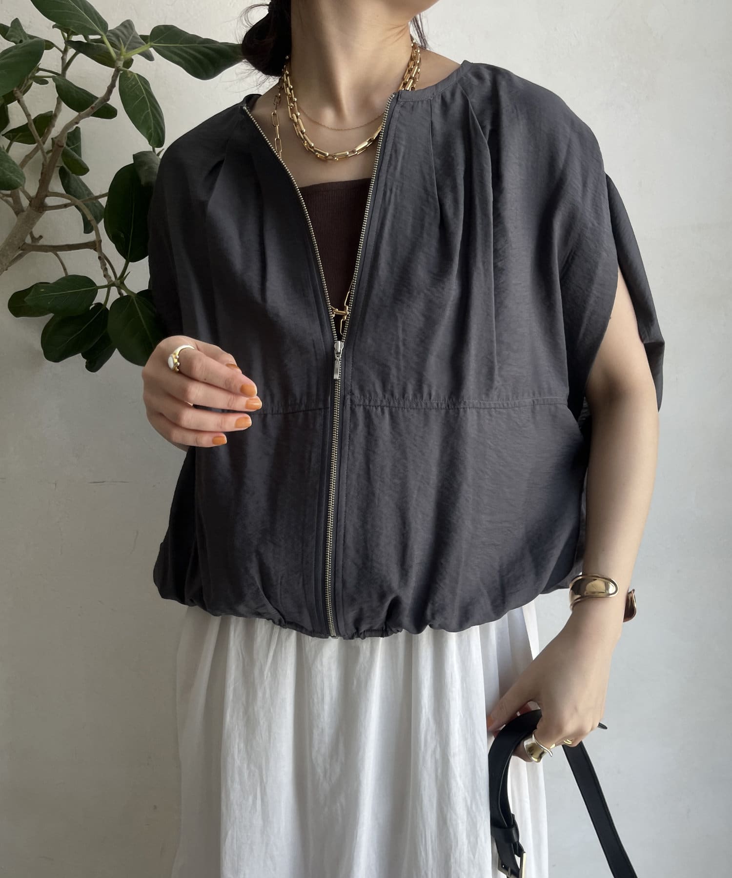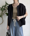 フロントジップを閉めてトップス風に、開けて羽織りとして。