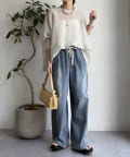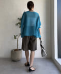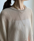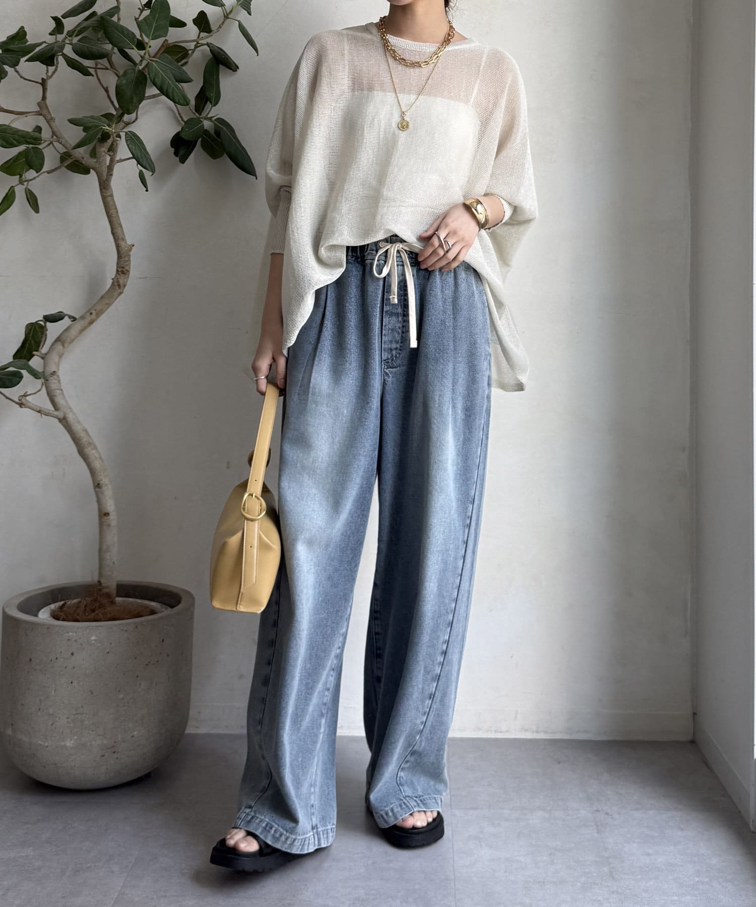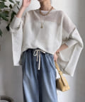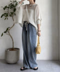 広めのクルーネックはデコルテを美しく見せ、抜け感を演出。