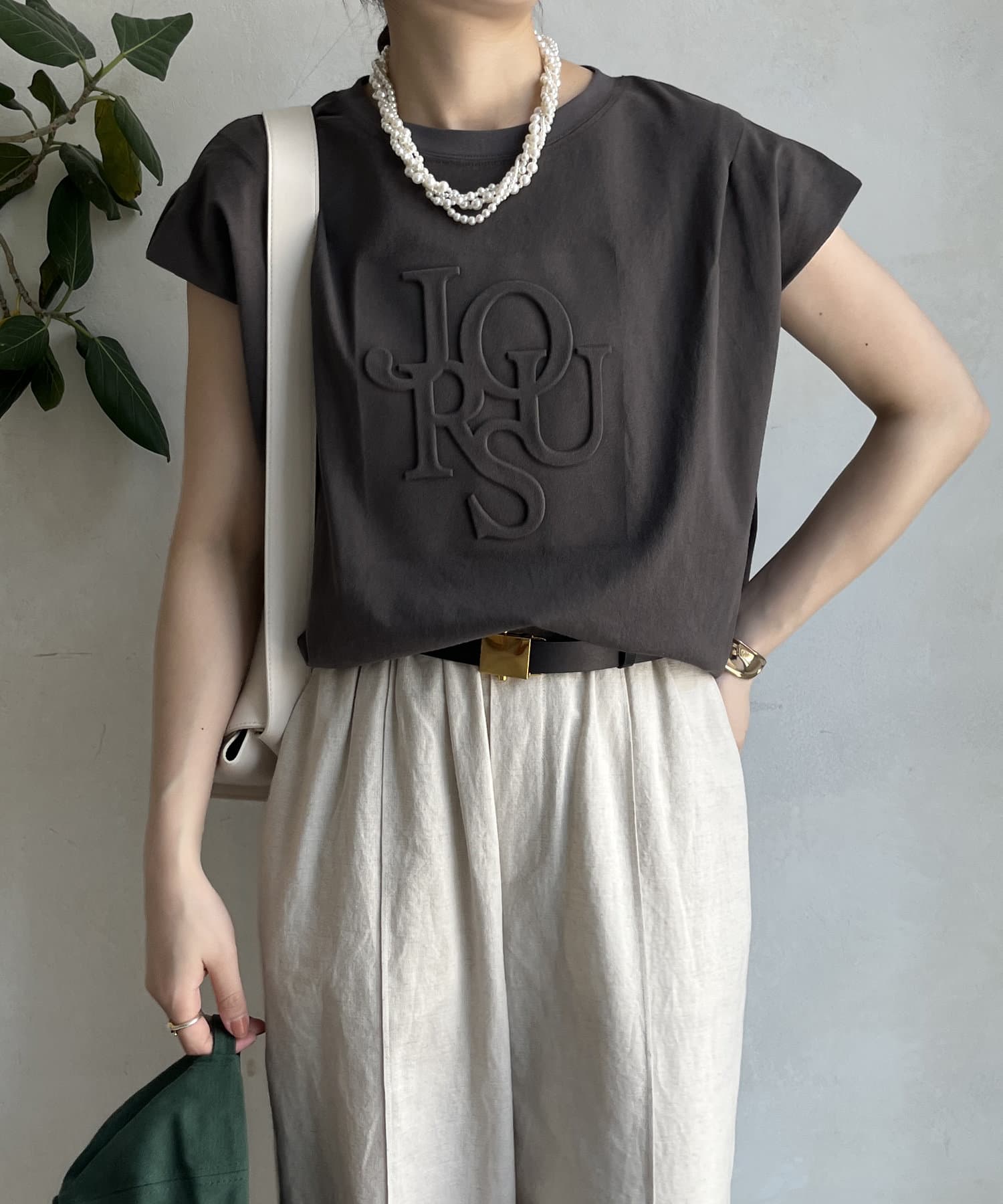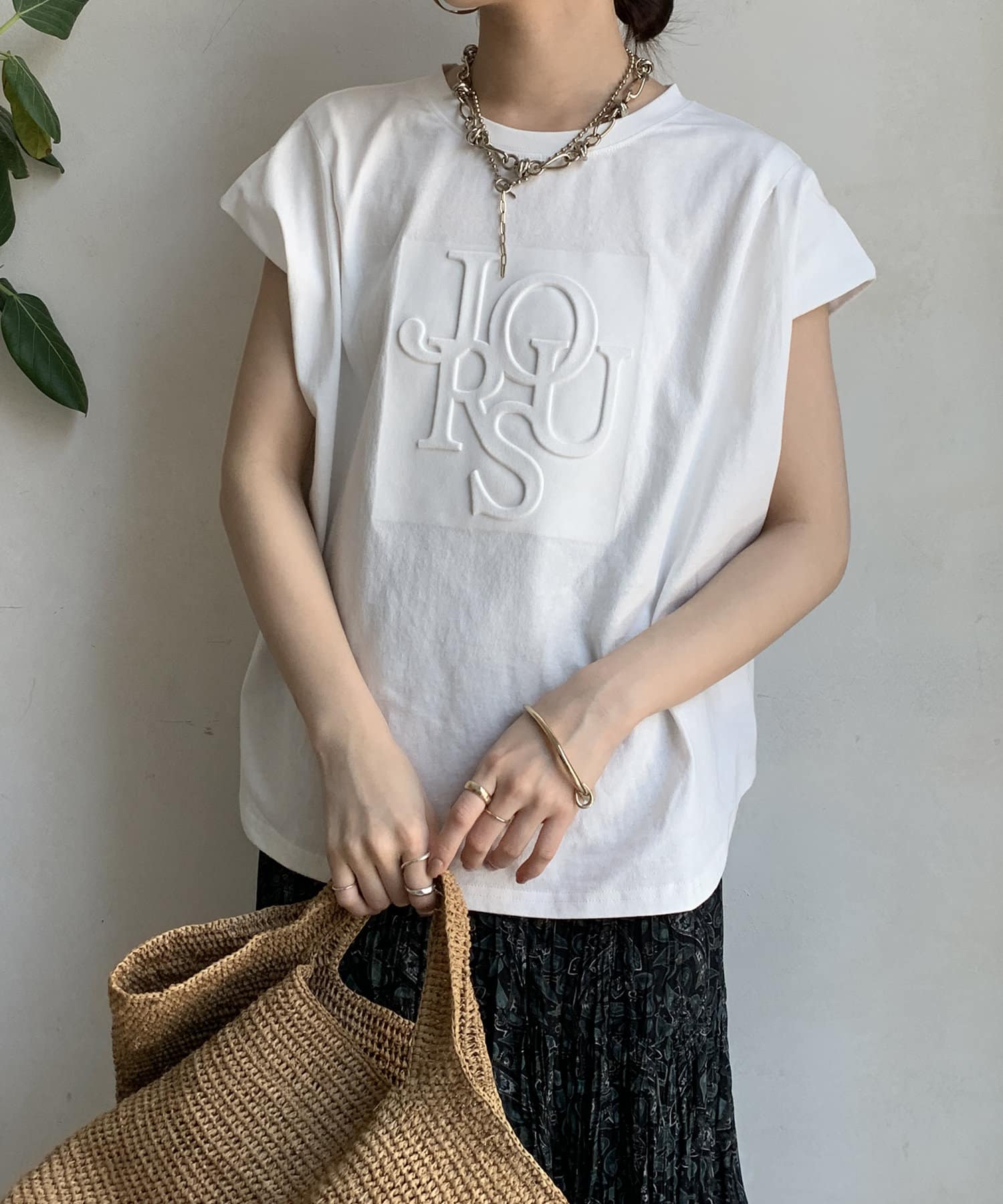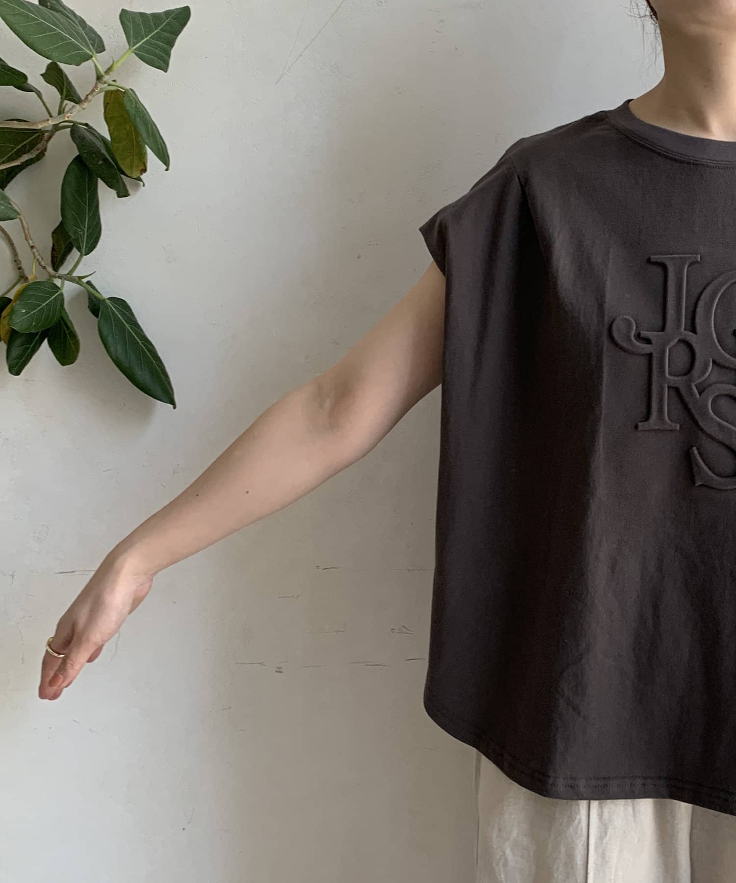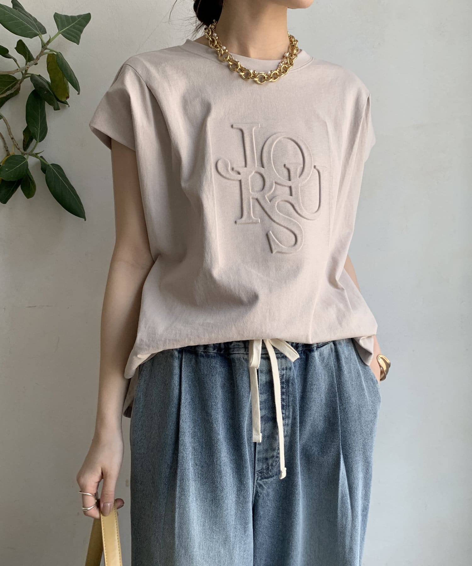 エンボスロゴがシンプルながらも存在感を放つデザイントップス