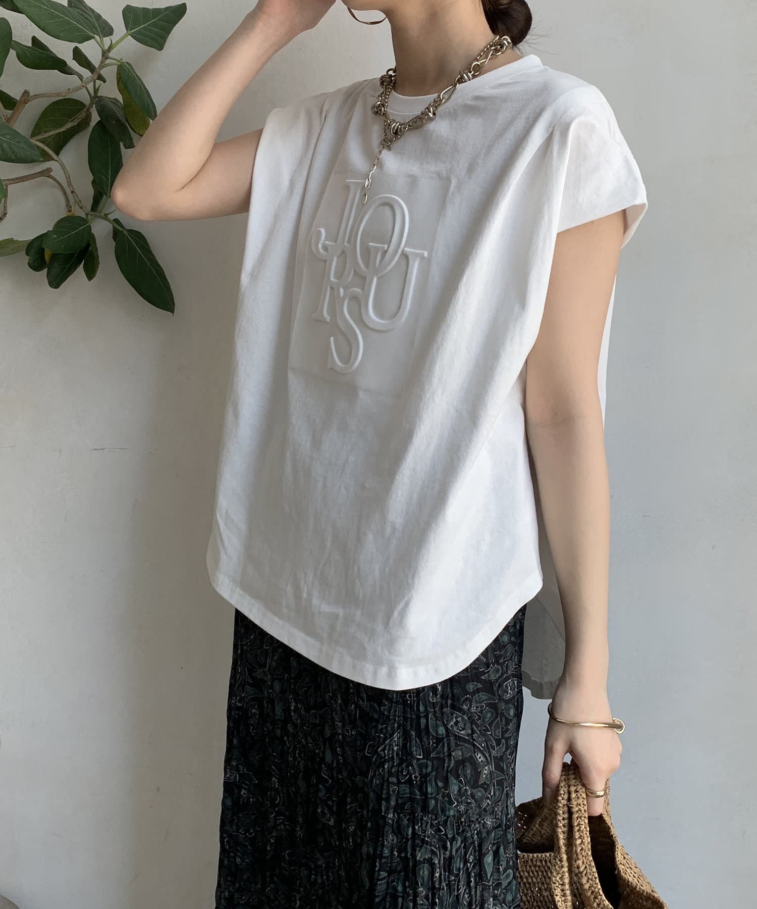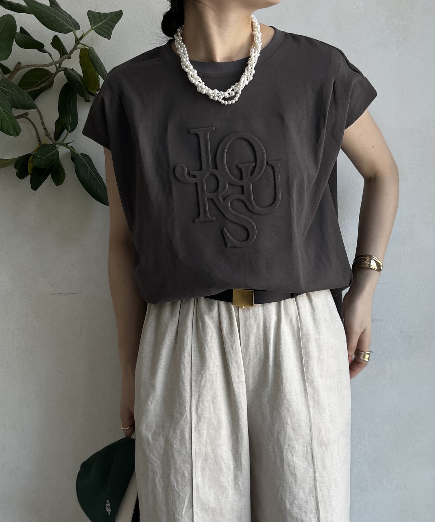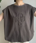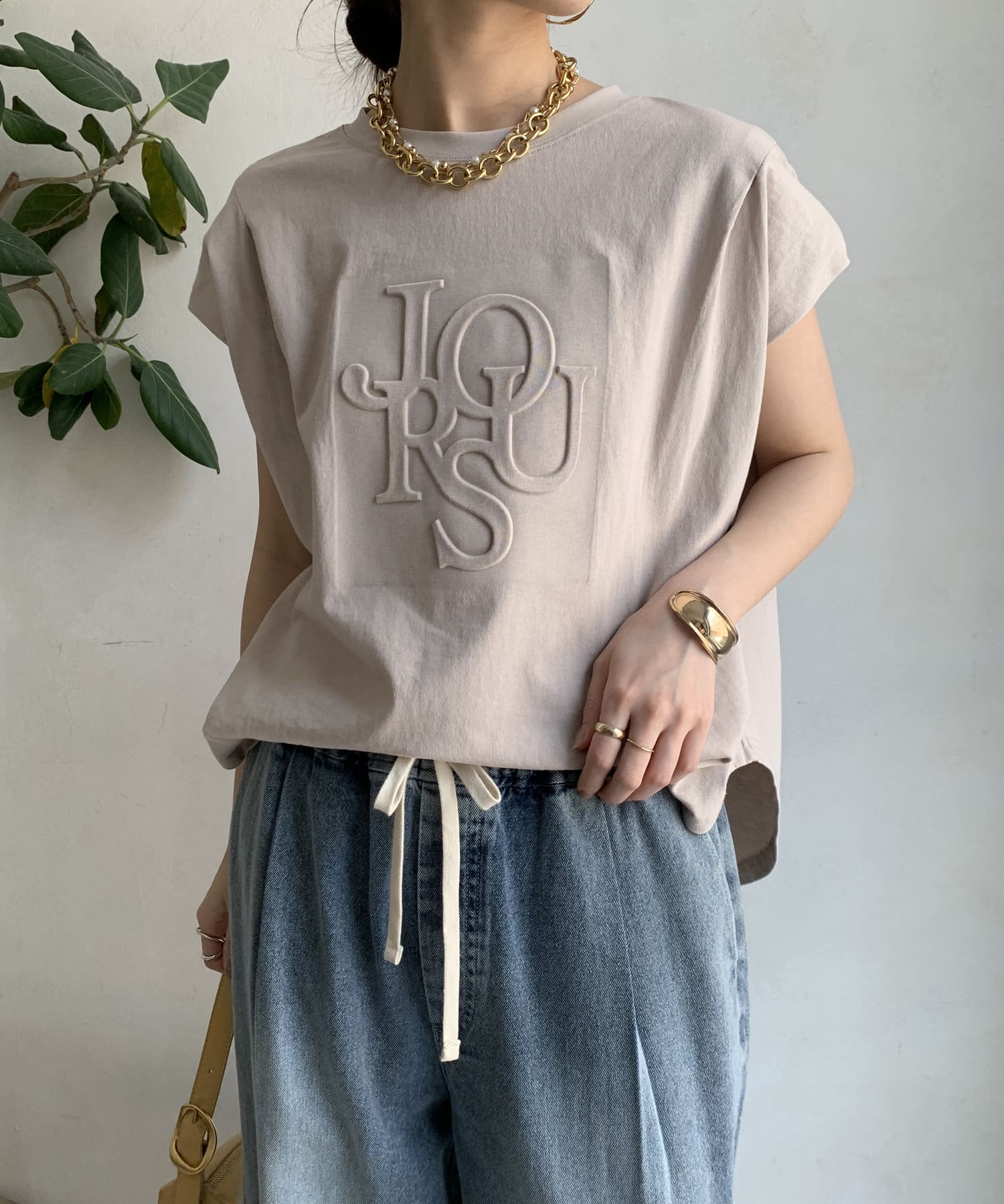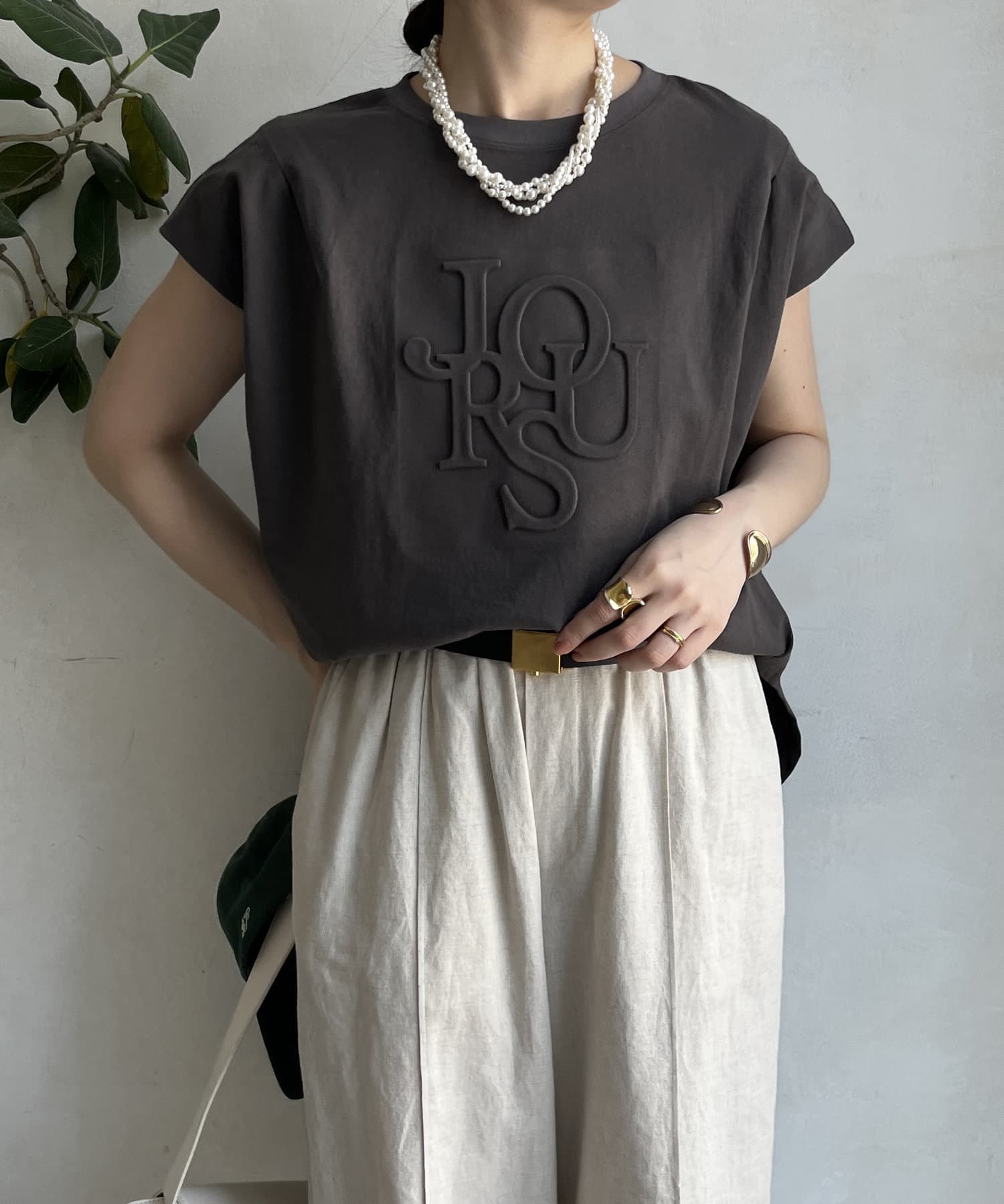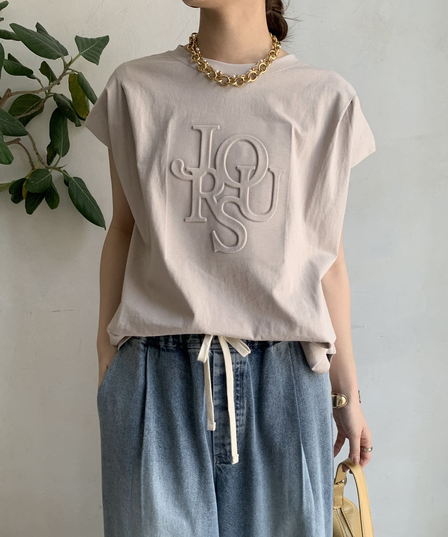 エンボスロゴがシンプルながらも存在感を放つデザイントップス