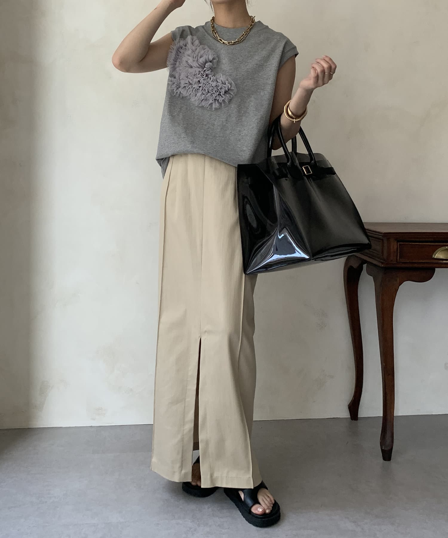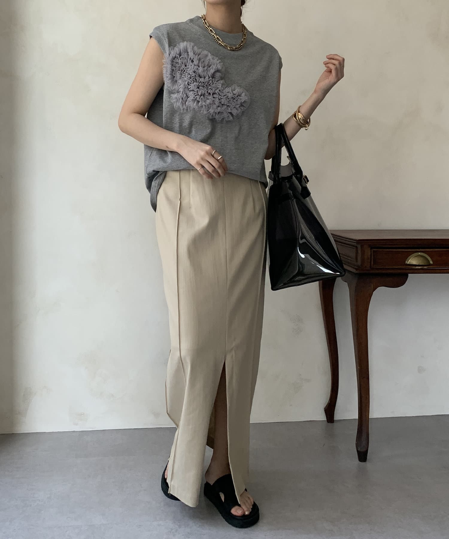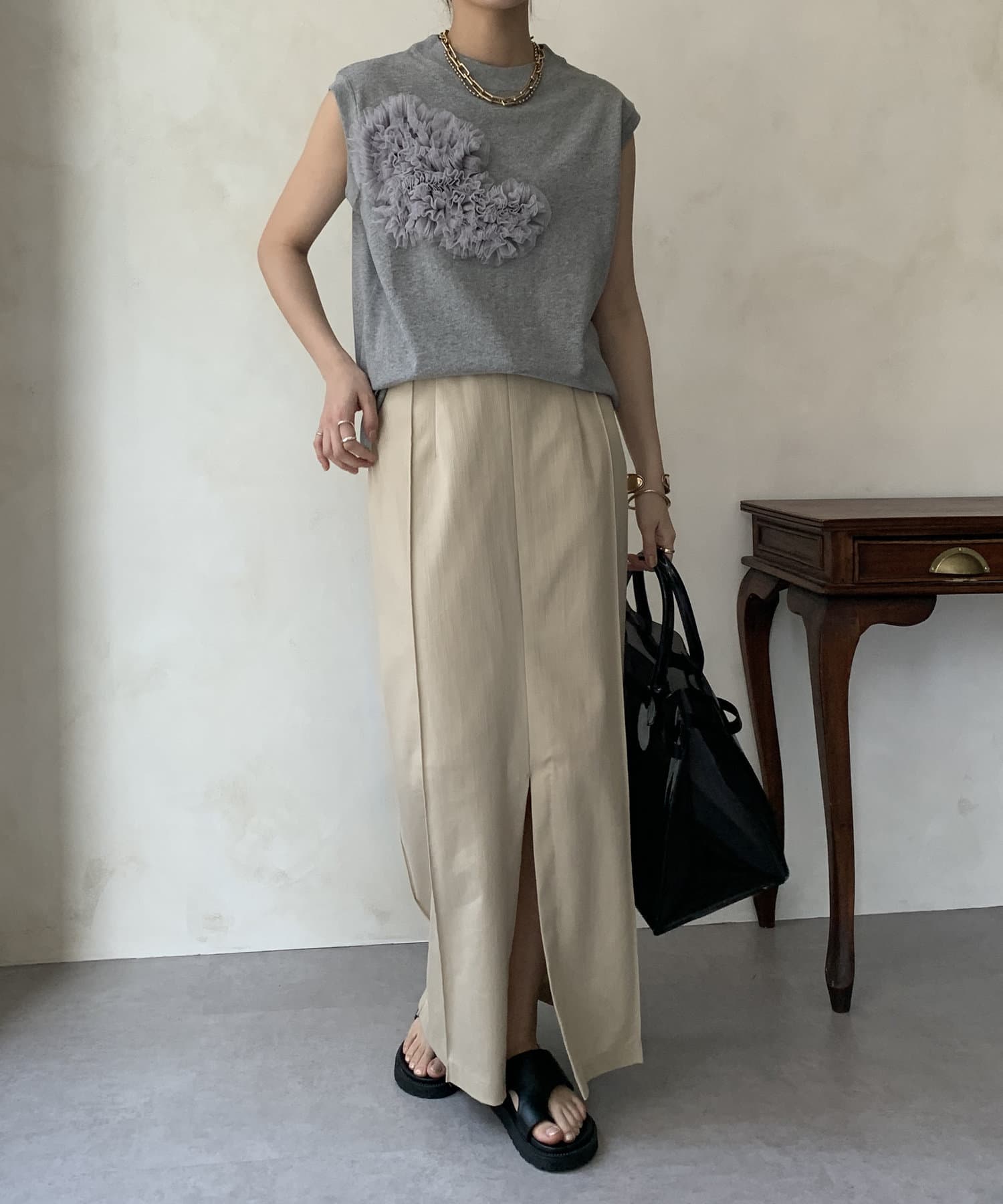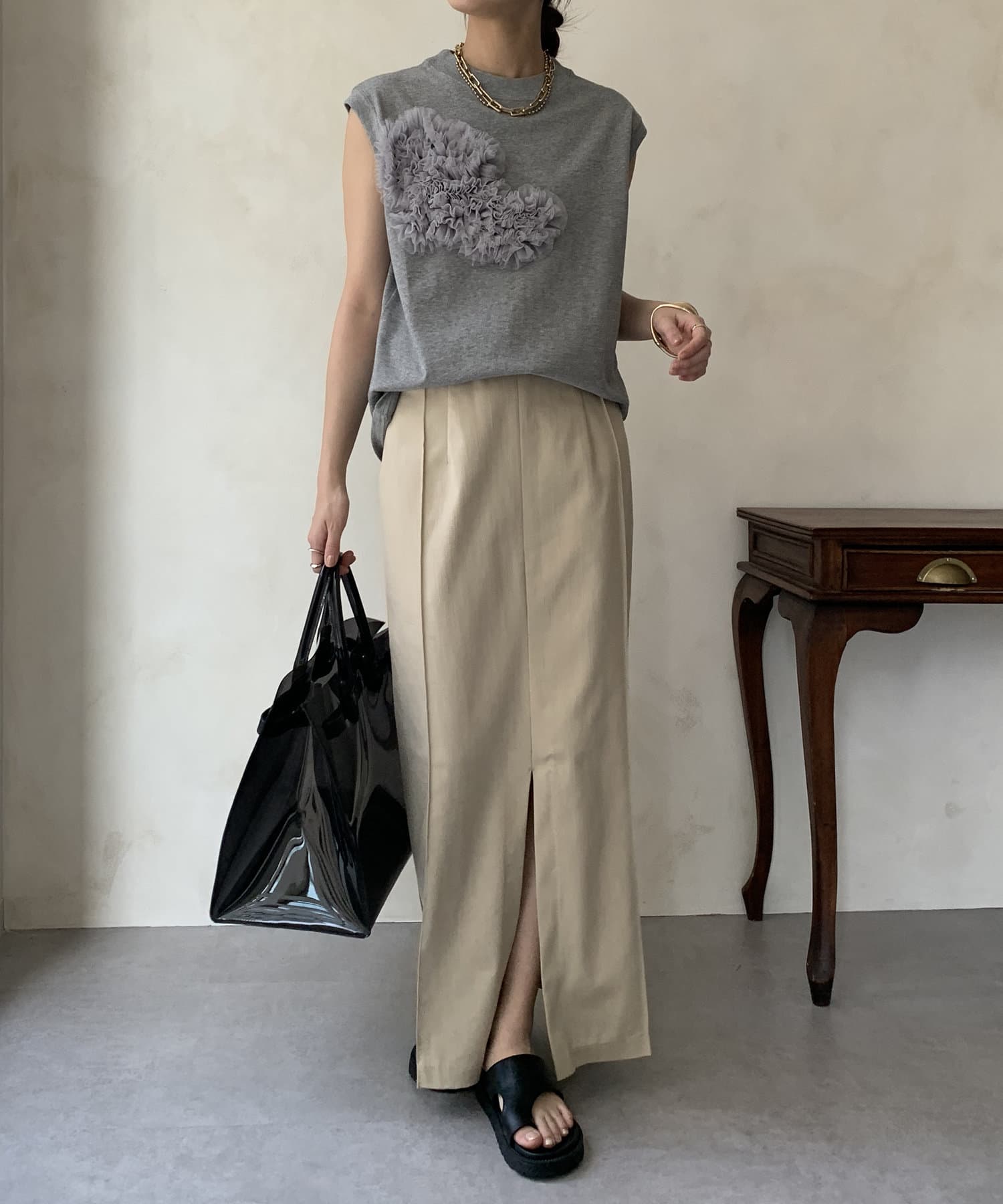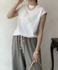 気になる二の腕をさりげなくカバーしつつ、肩周りを華奢に見せるカッティングのノースリーブです!