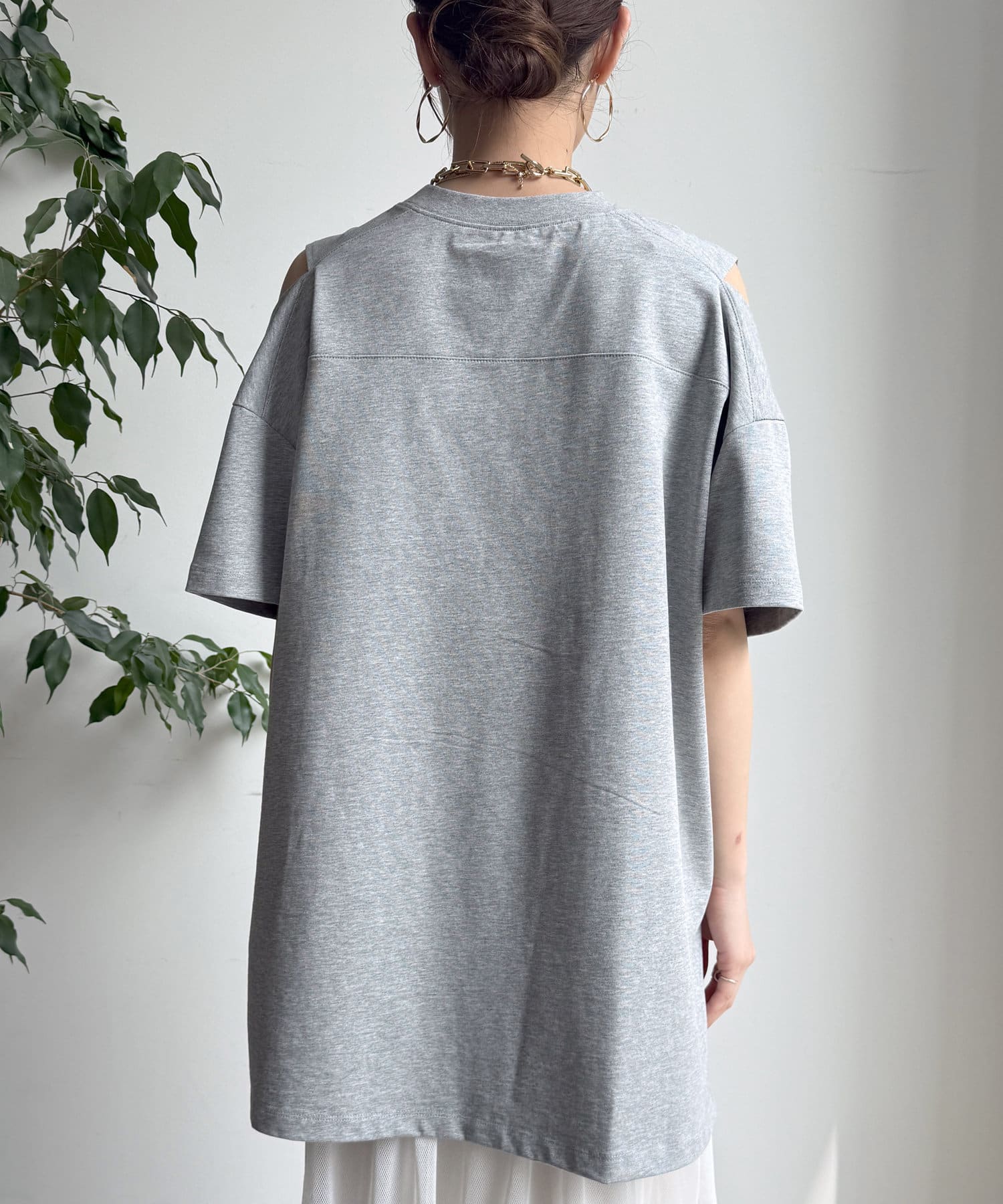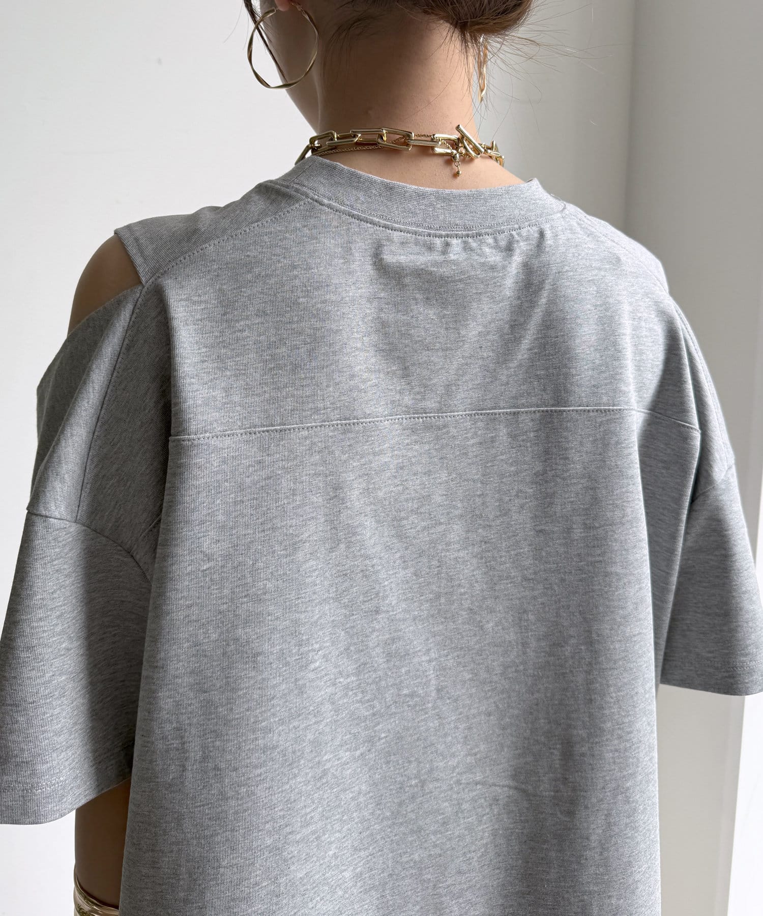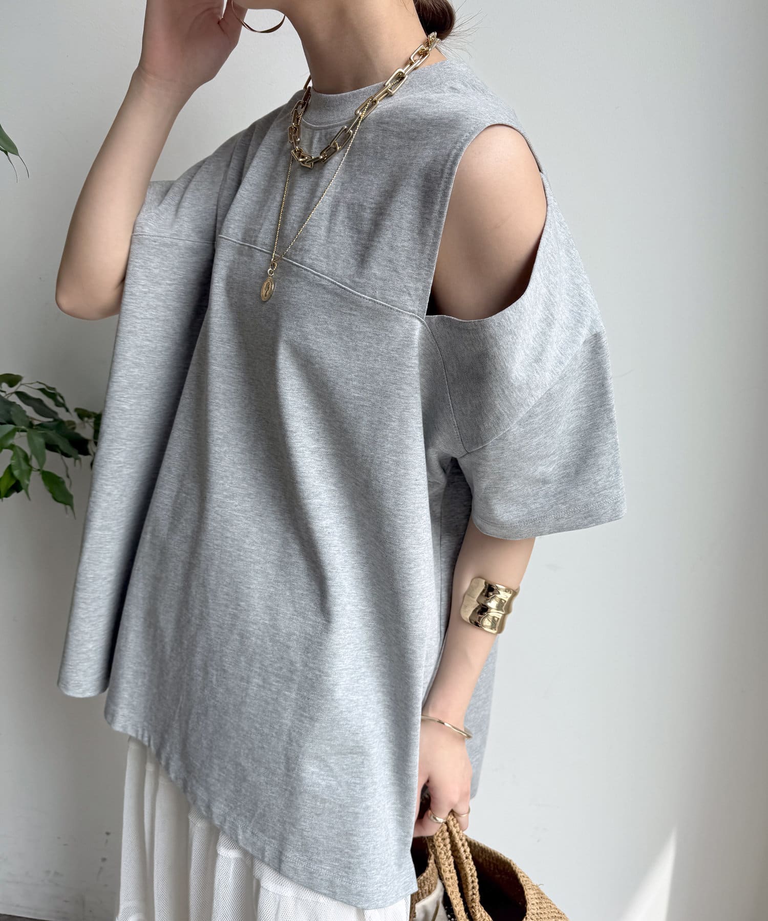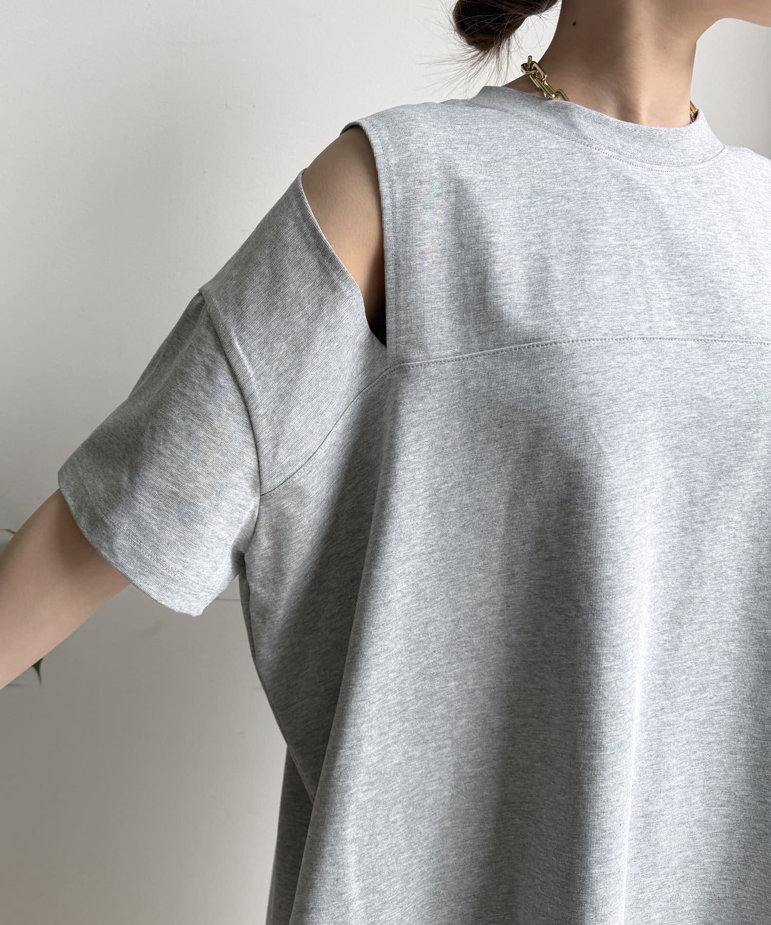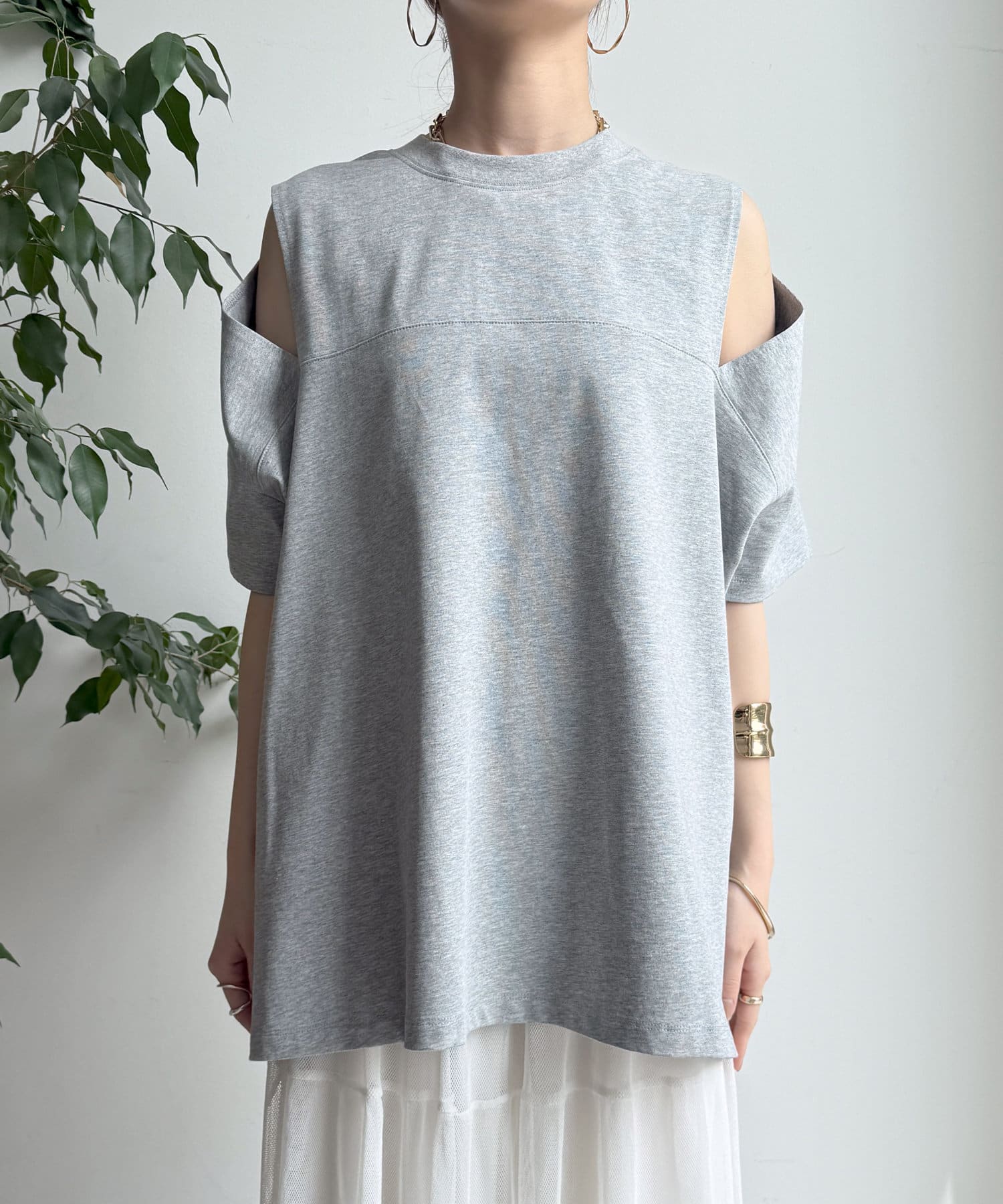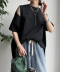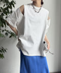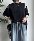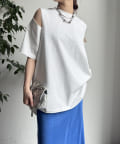 肩部分に施されたカッティングは、ヘルシーな肌見せを叶え、いつものトップススタイルに新鮮な驚きと抜け感をもたらします。