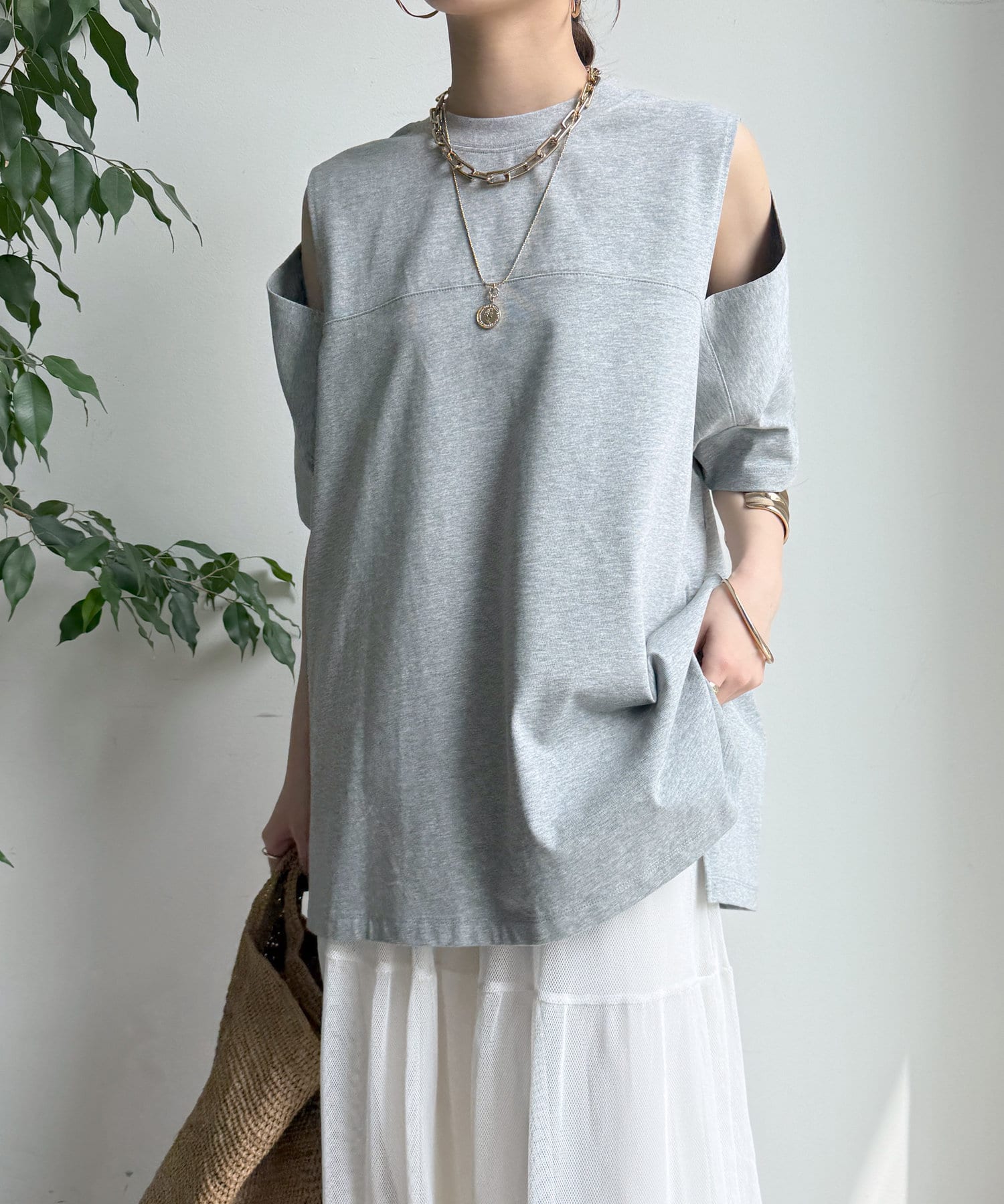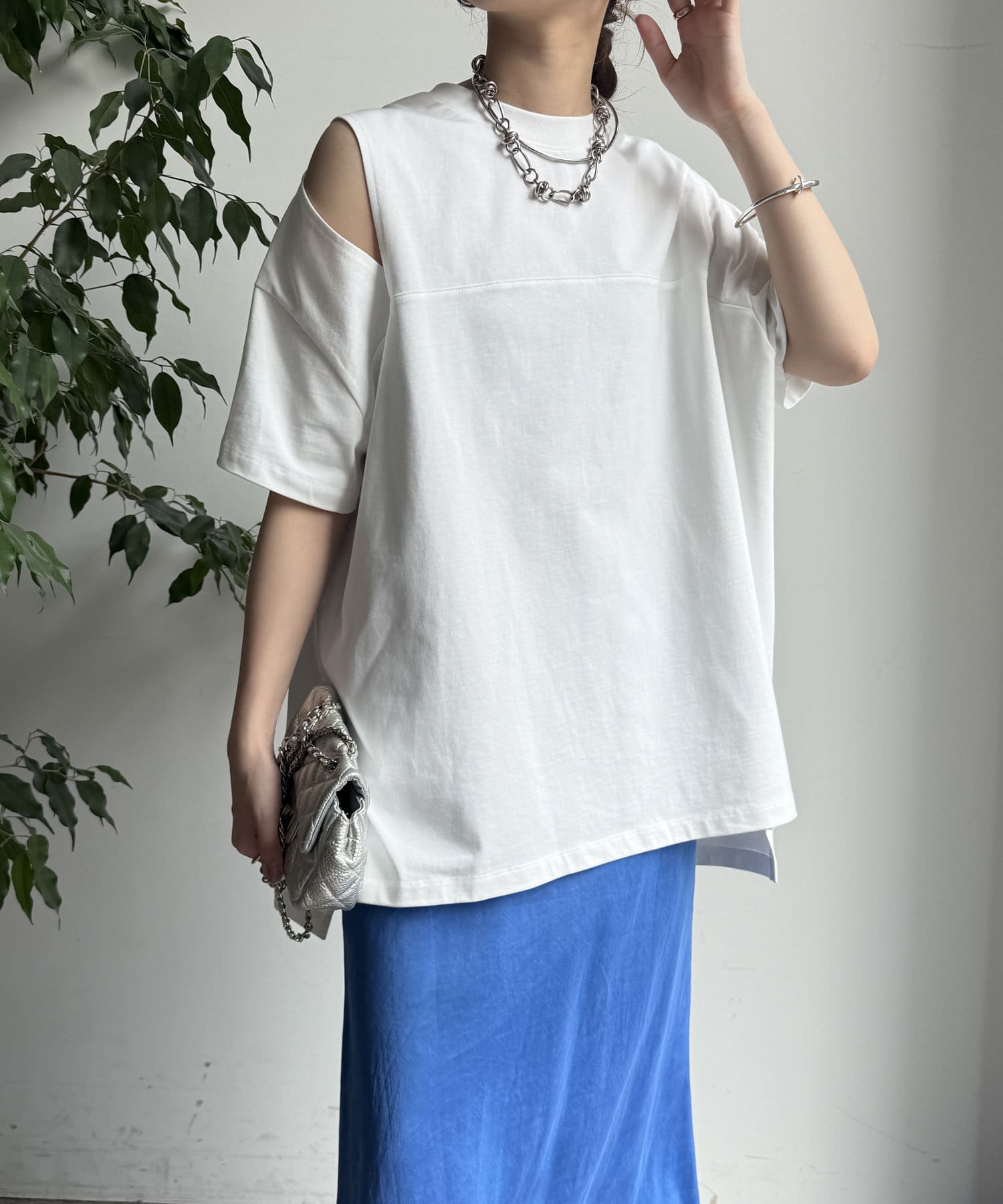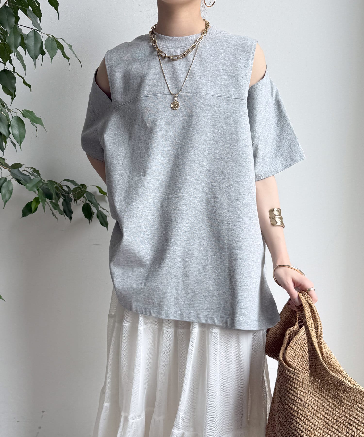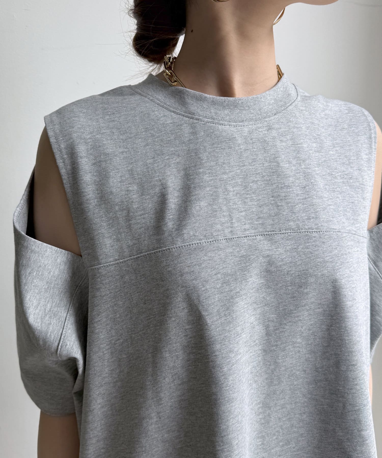 肩部分に施されたカッティングは、ヘルシーな肌見せを叶え、いつものトップススタイルに新鮮な驚きと抜け感をもたらします。