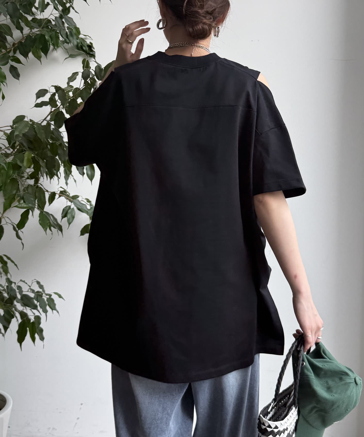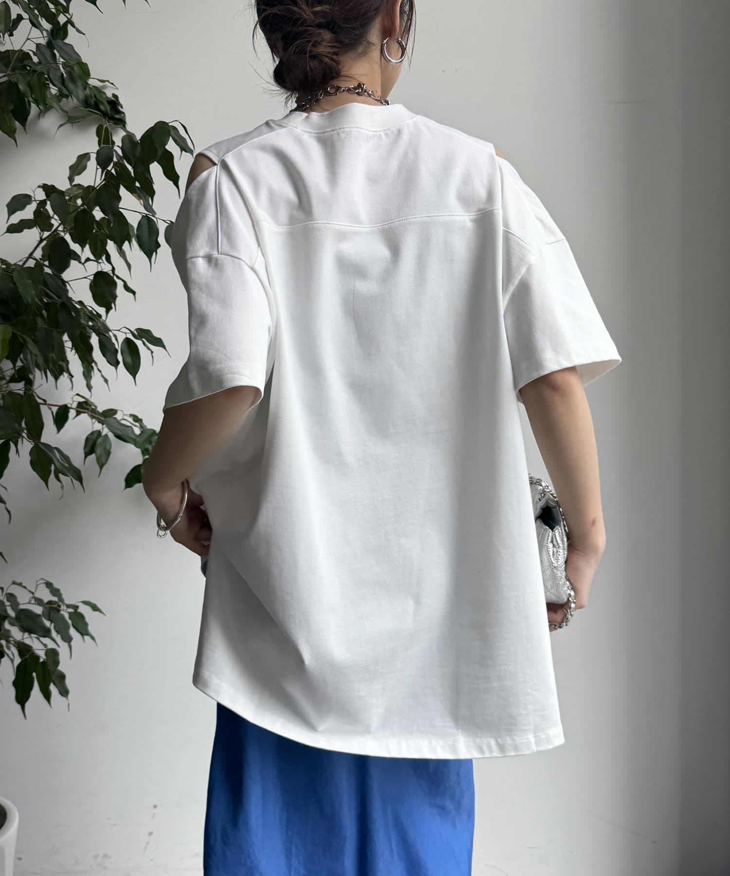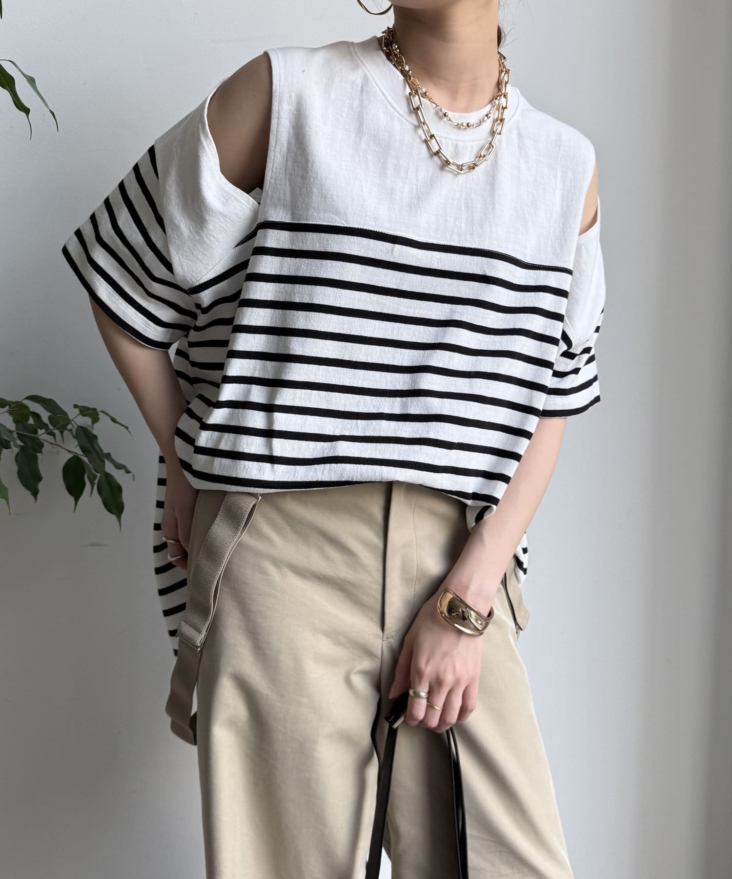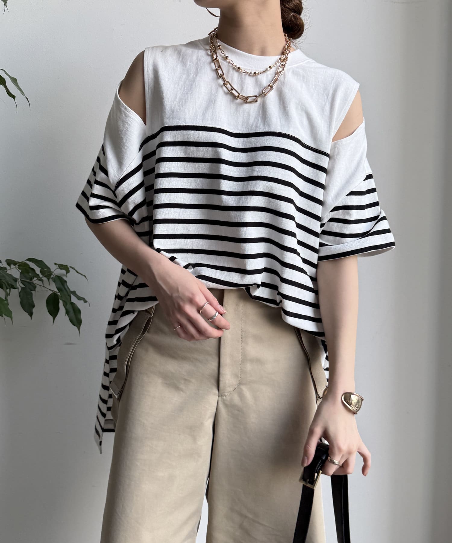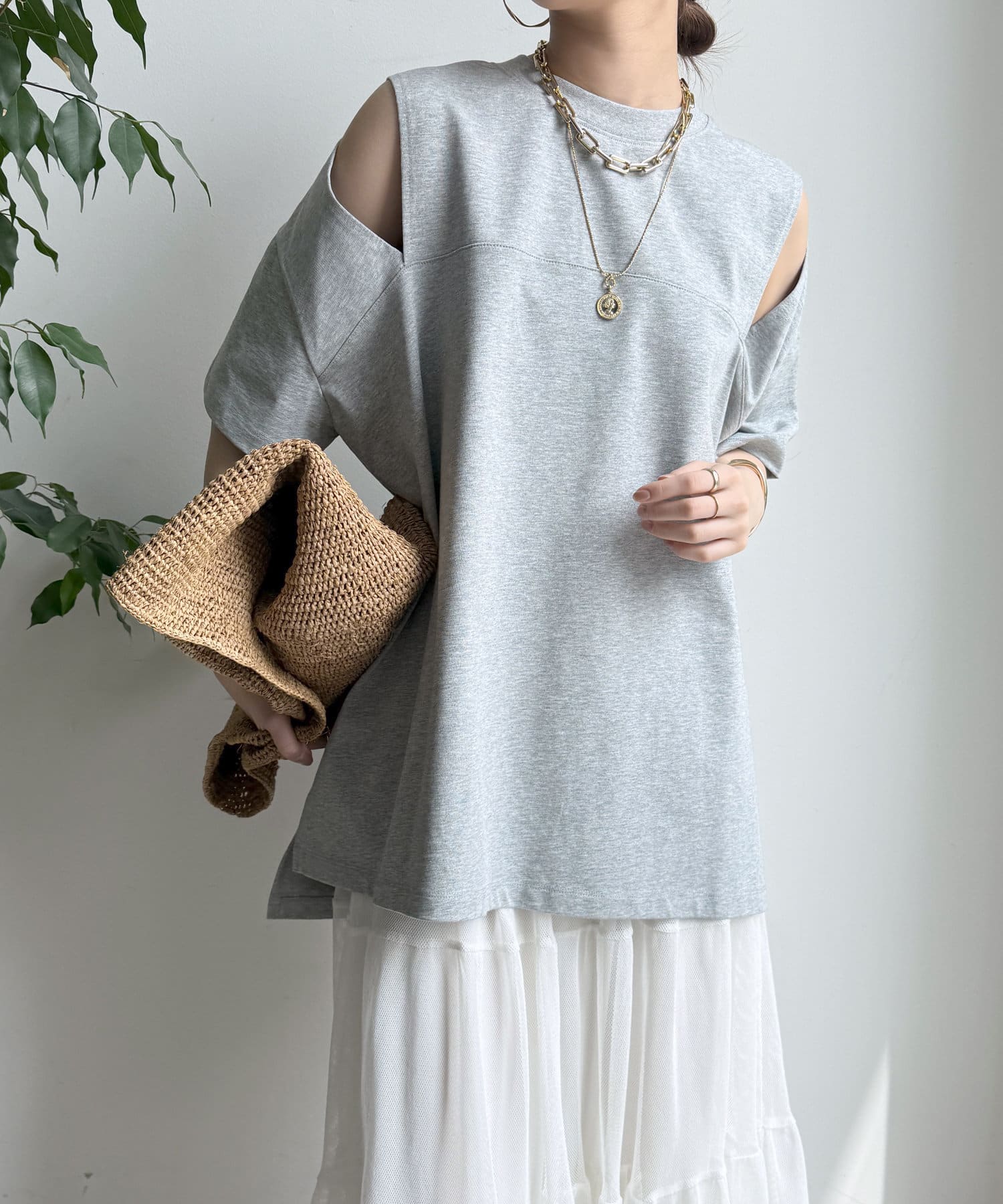 肩部分に施されたカッティングは、ヘルシーな肌見せを叶え、いつものトップススタイルに新鮮な驚きと抜け感をもたらします。