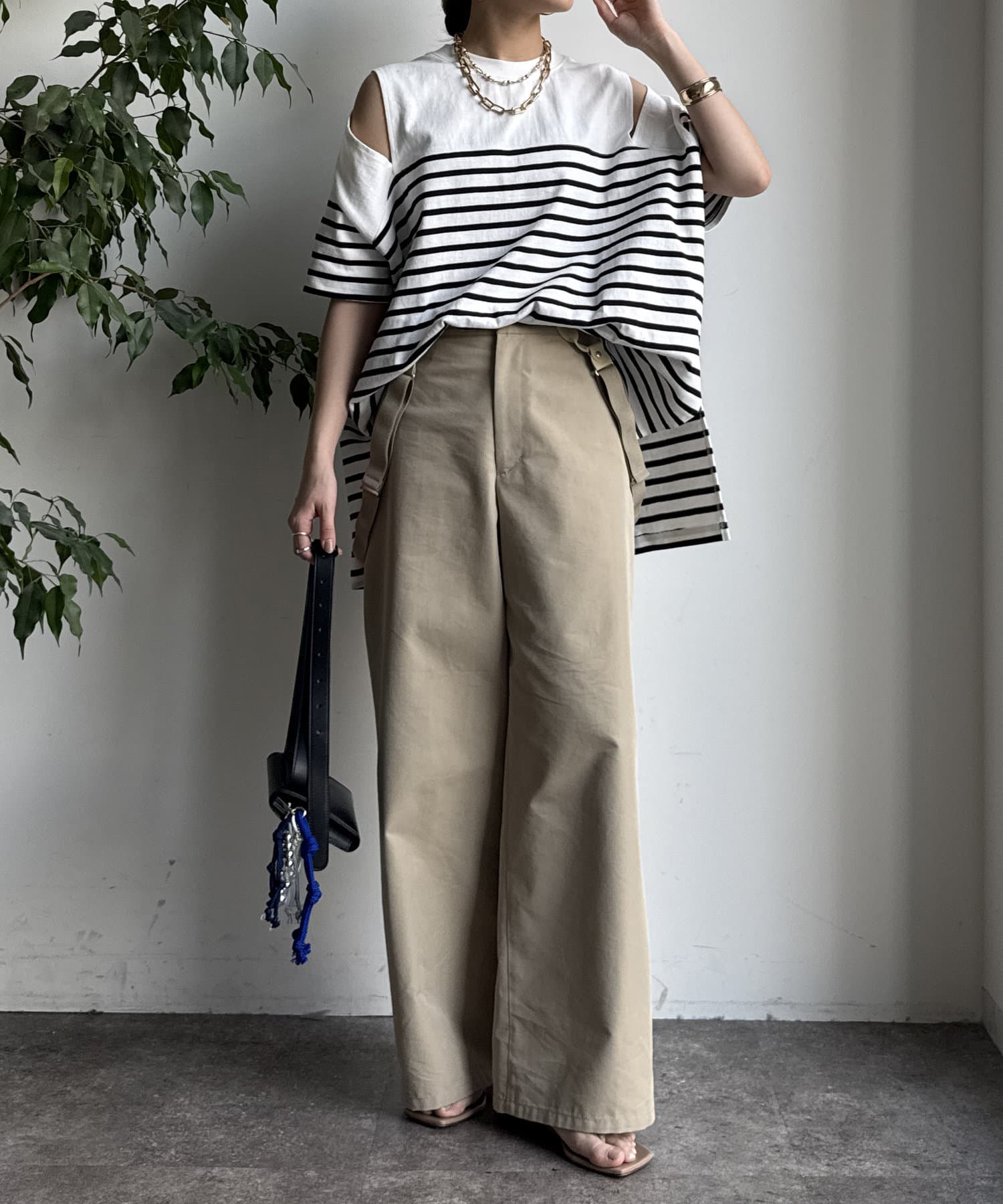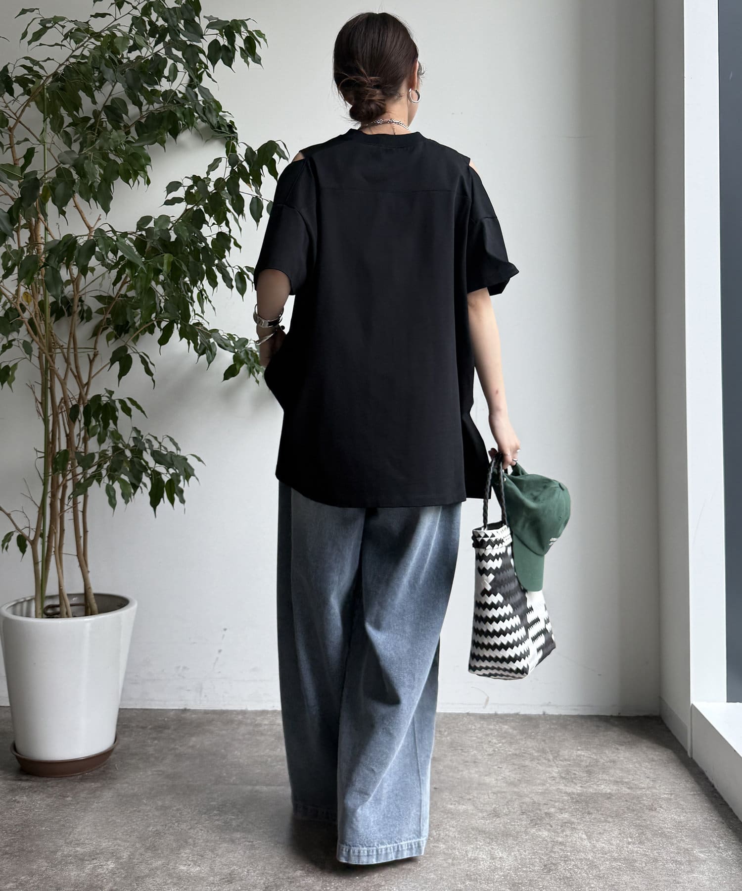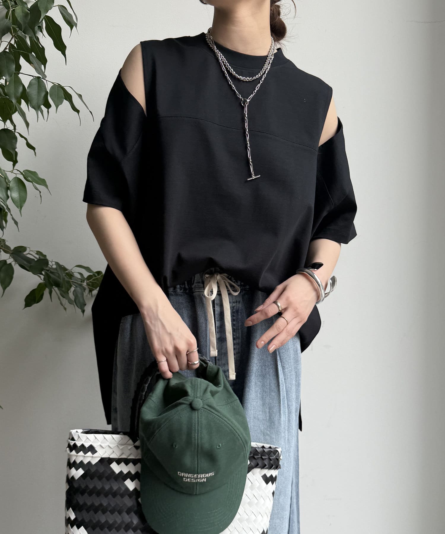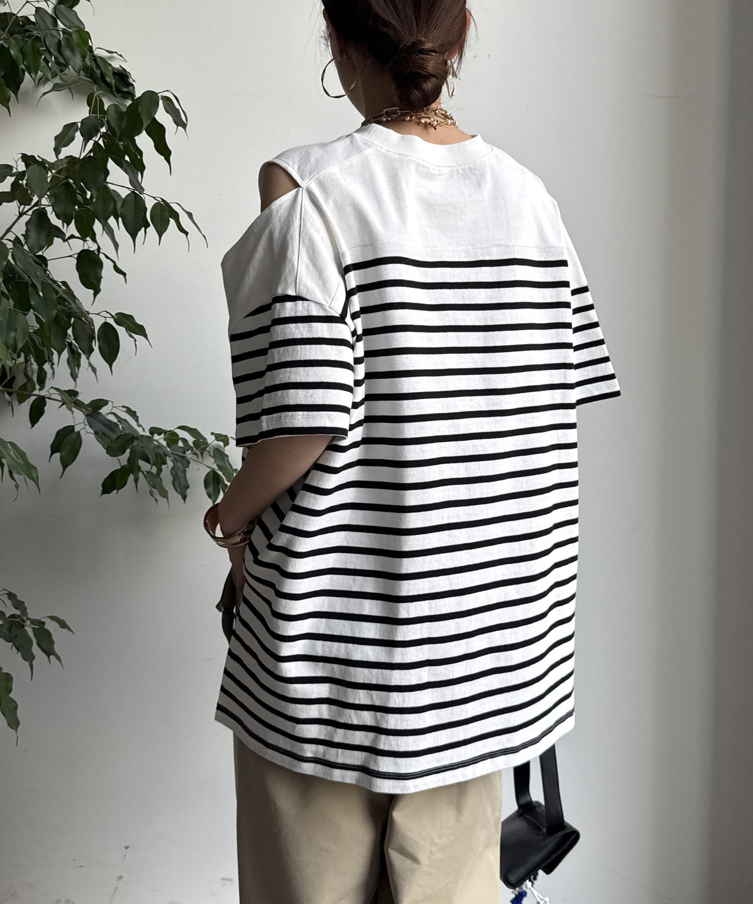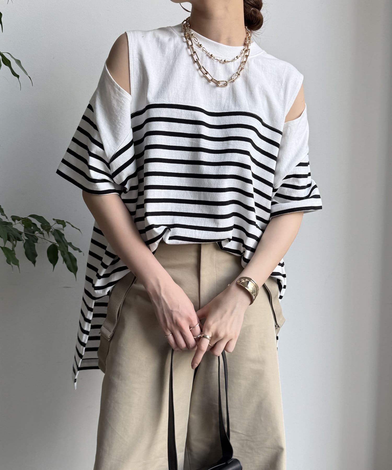 肩部分に施されたカッティングは、ヘルシーな肌見せを叶え、いつものトップススタイルに新鮮な驚きと抜け感をもたらします。