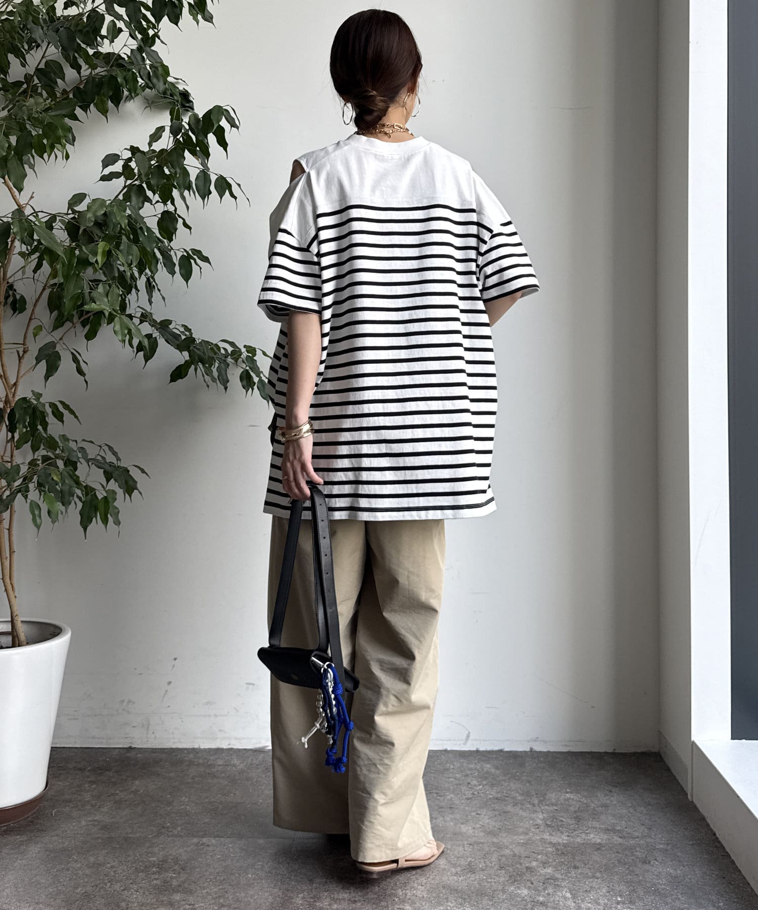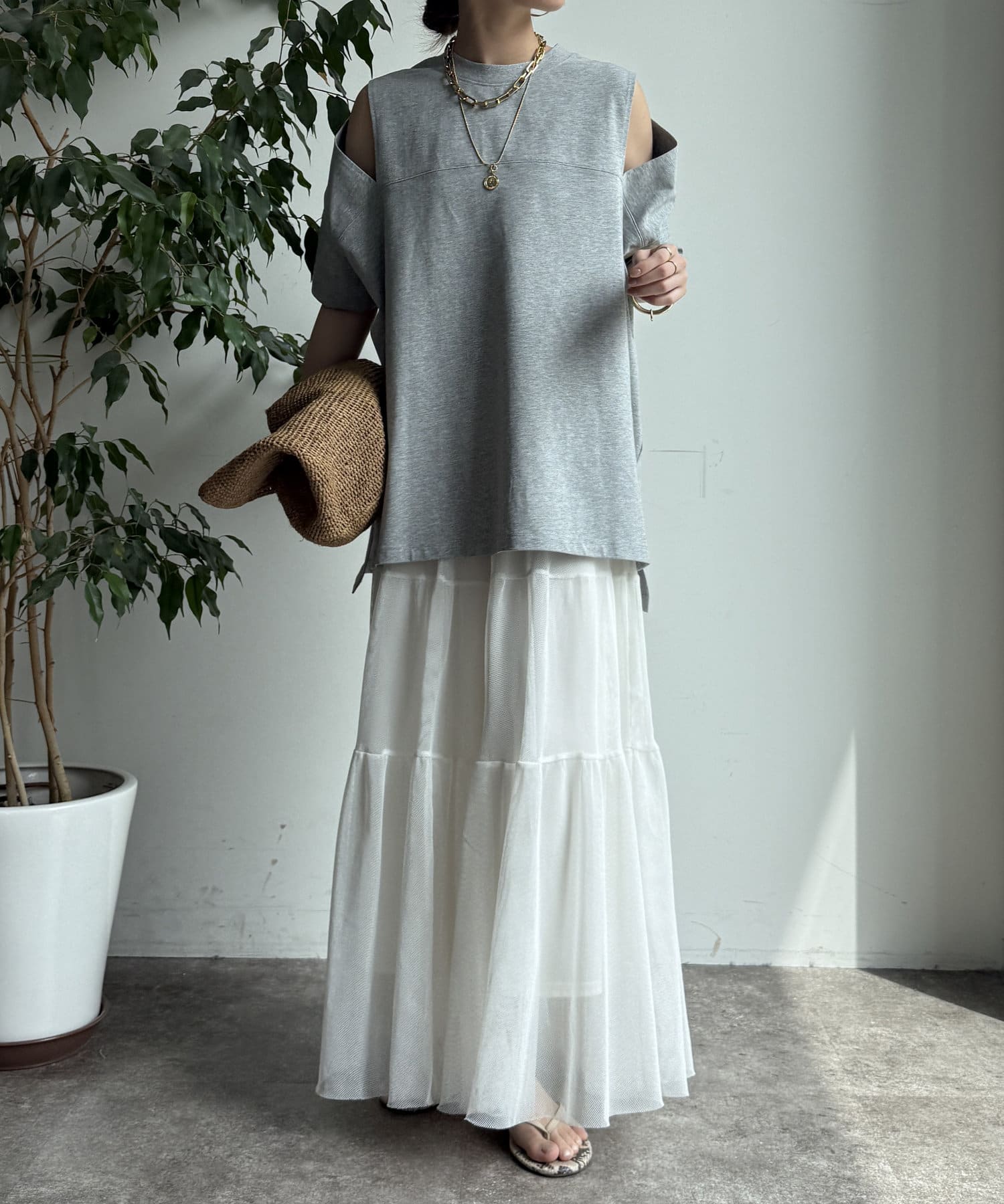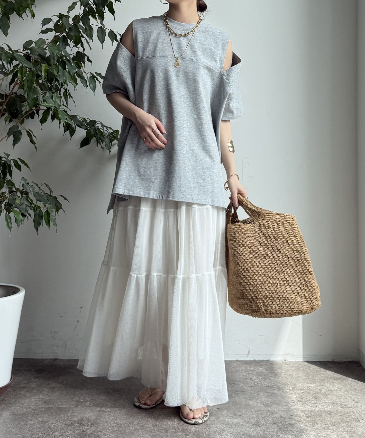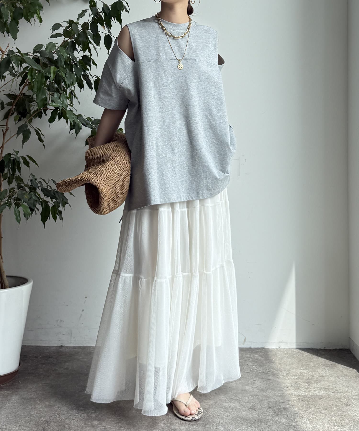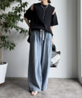 肩部分に施されたカッティングは、ヘルシーな肌見せを叶え、いつものトップススタイルに新鮮な驚きと抜け感をもたらします。