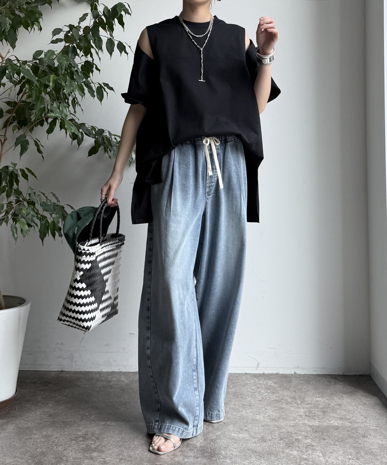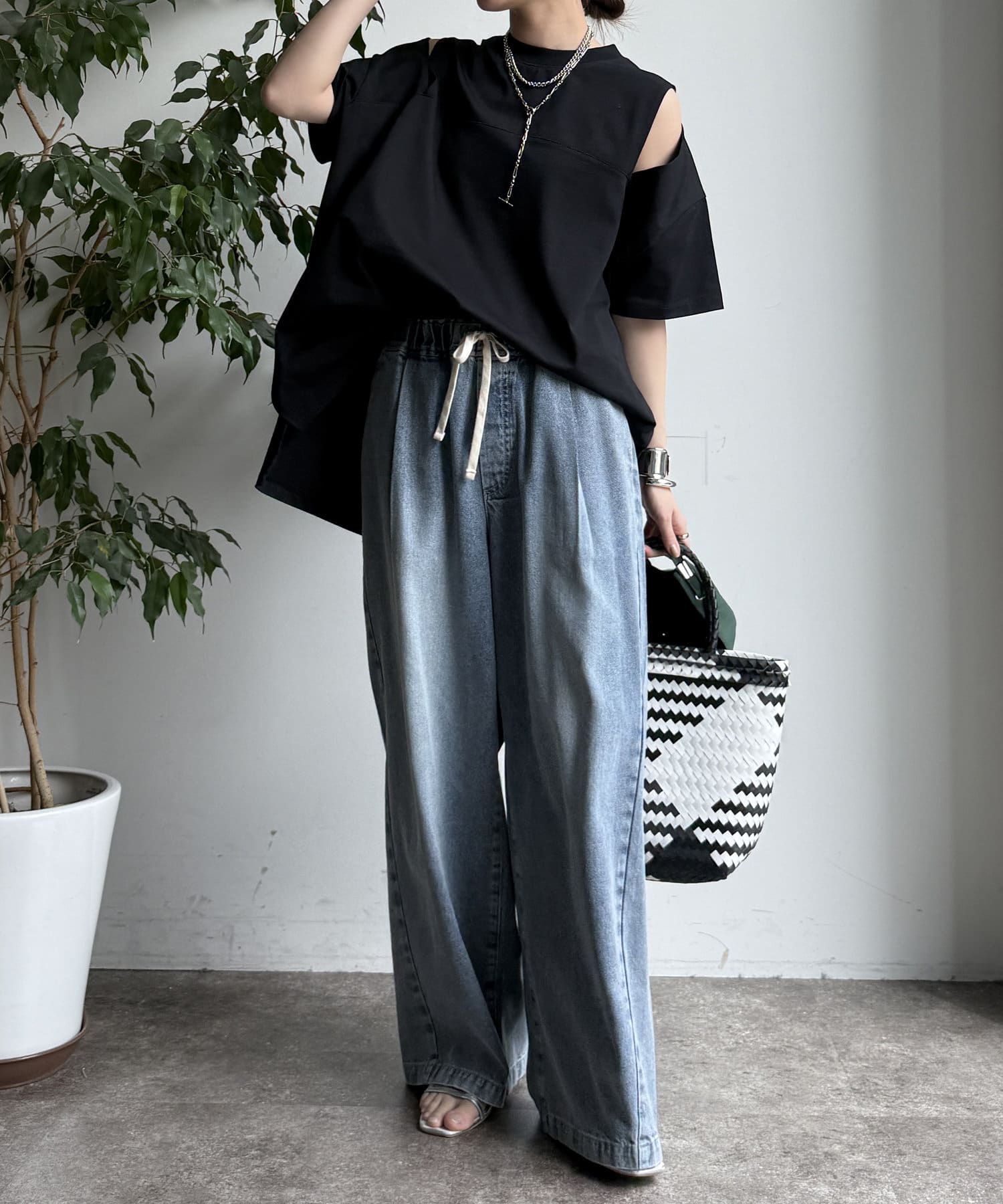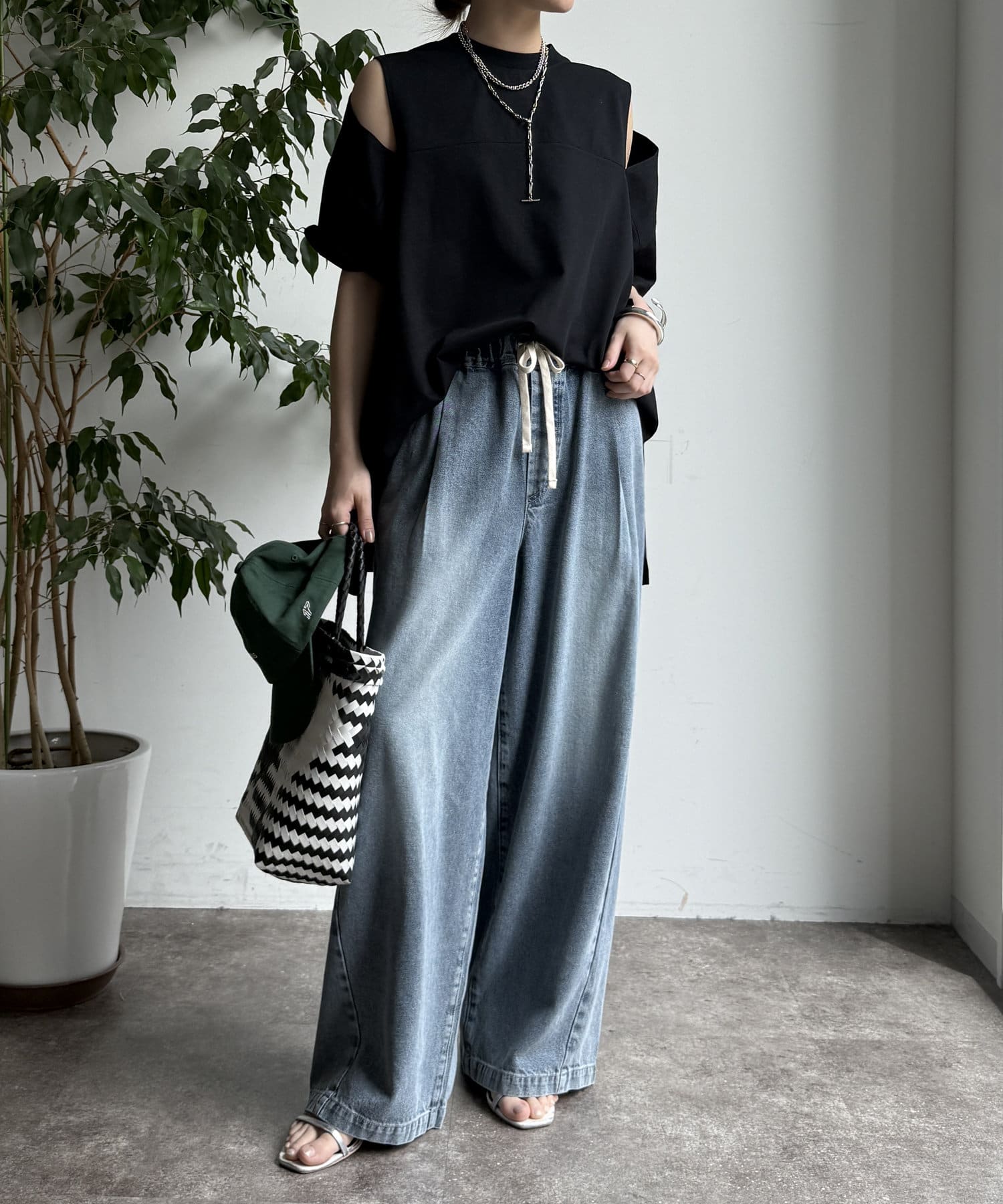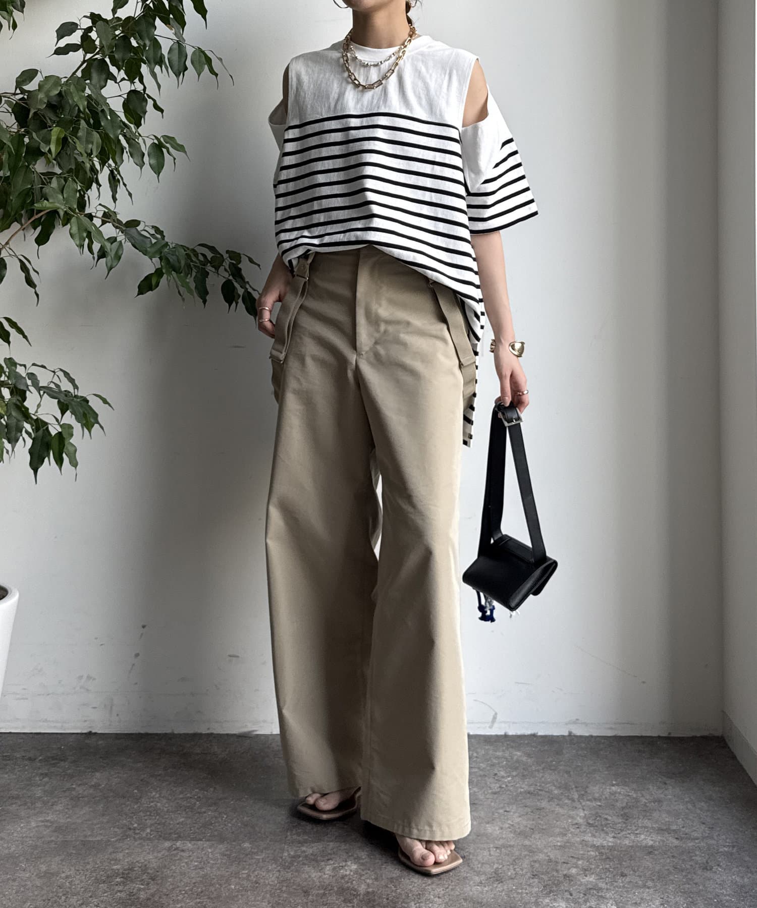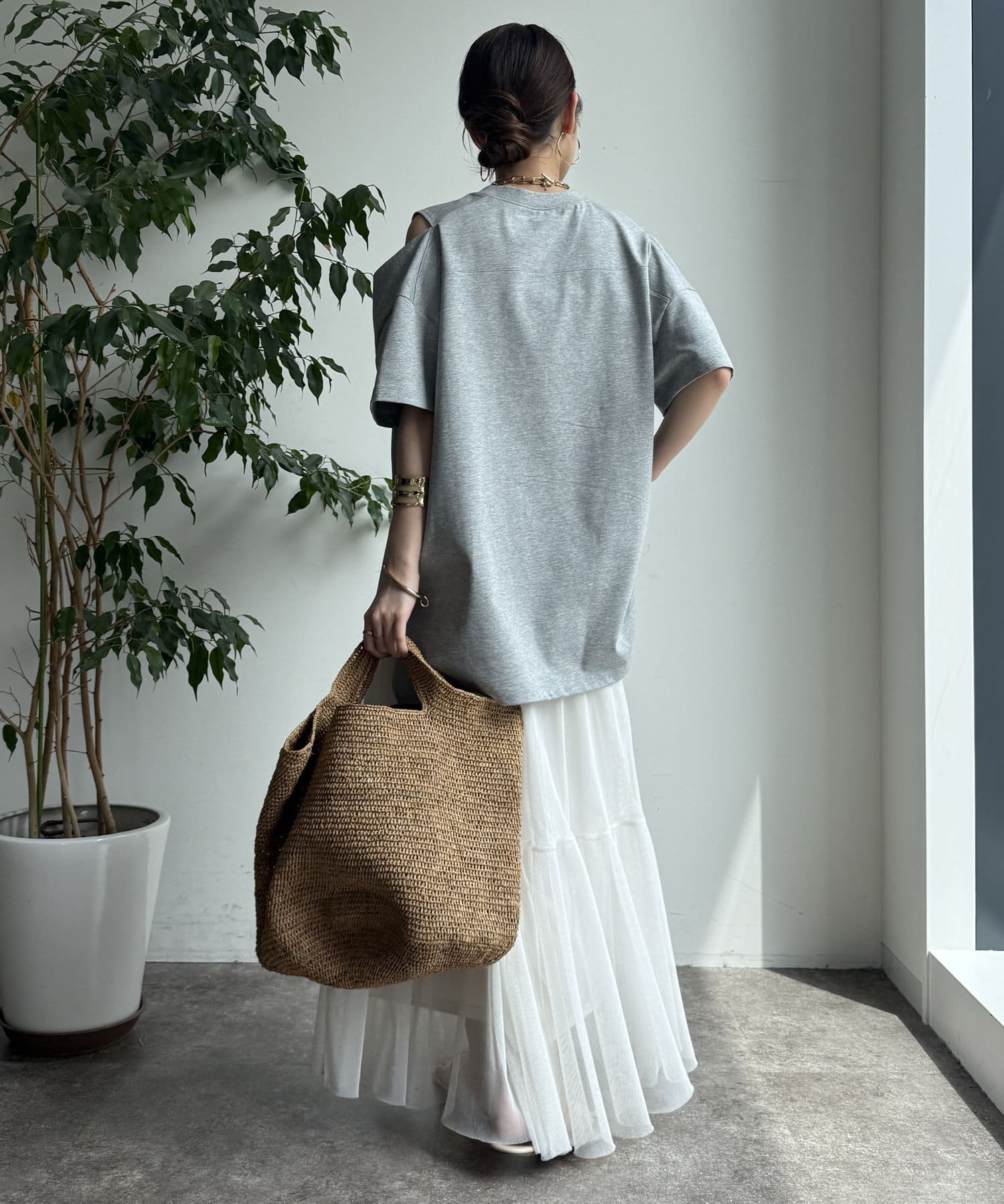 肩部分に施されたカッティングは、ヘルシーな肌見せを叶え、いつものトップススタイルに新鮮な驚きと抜け感をもたらします。