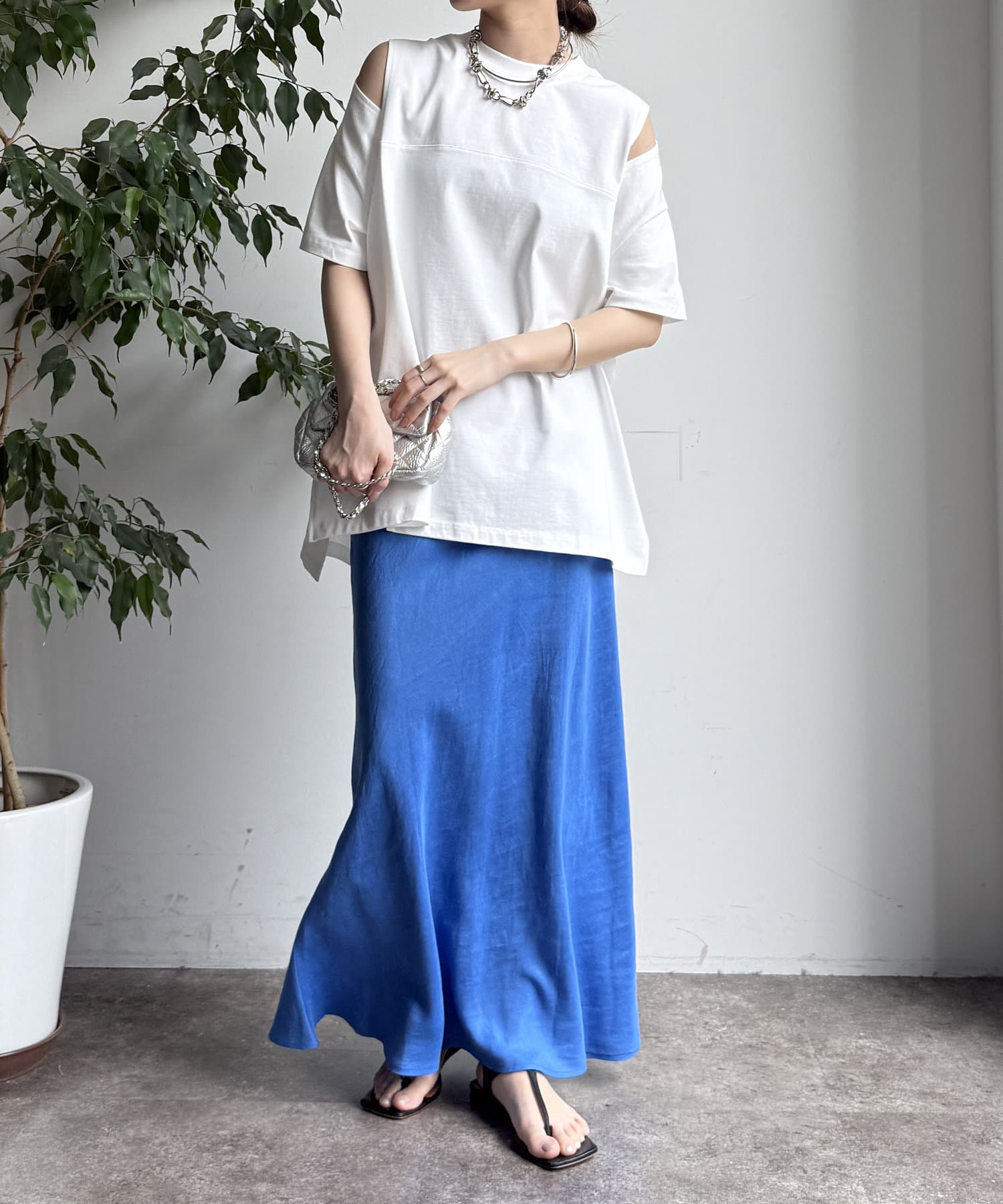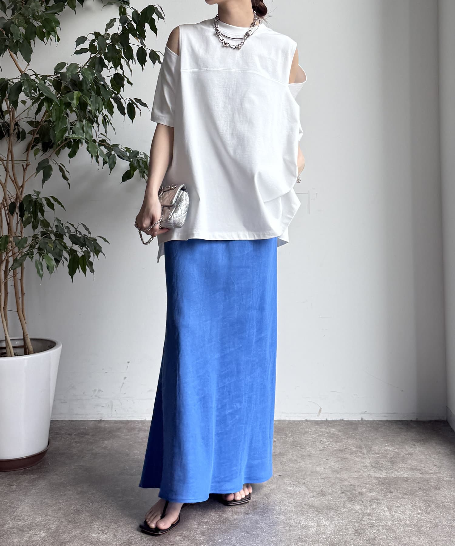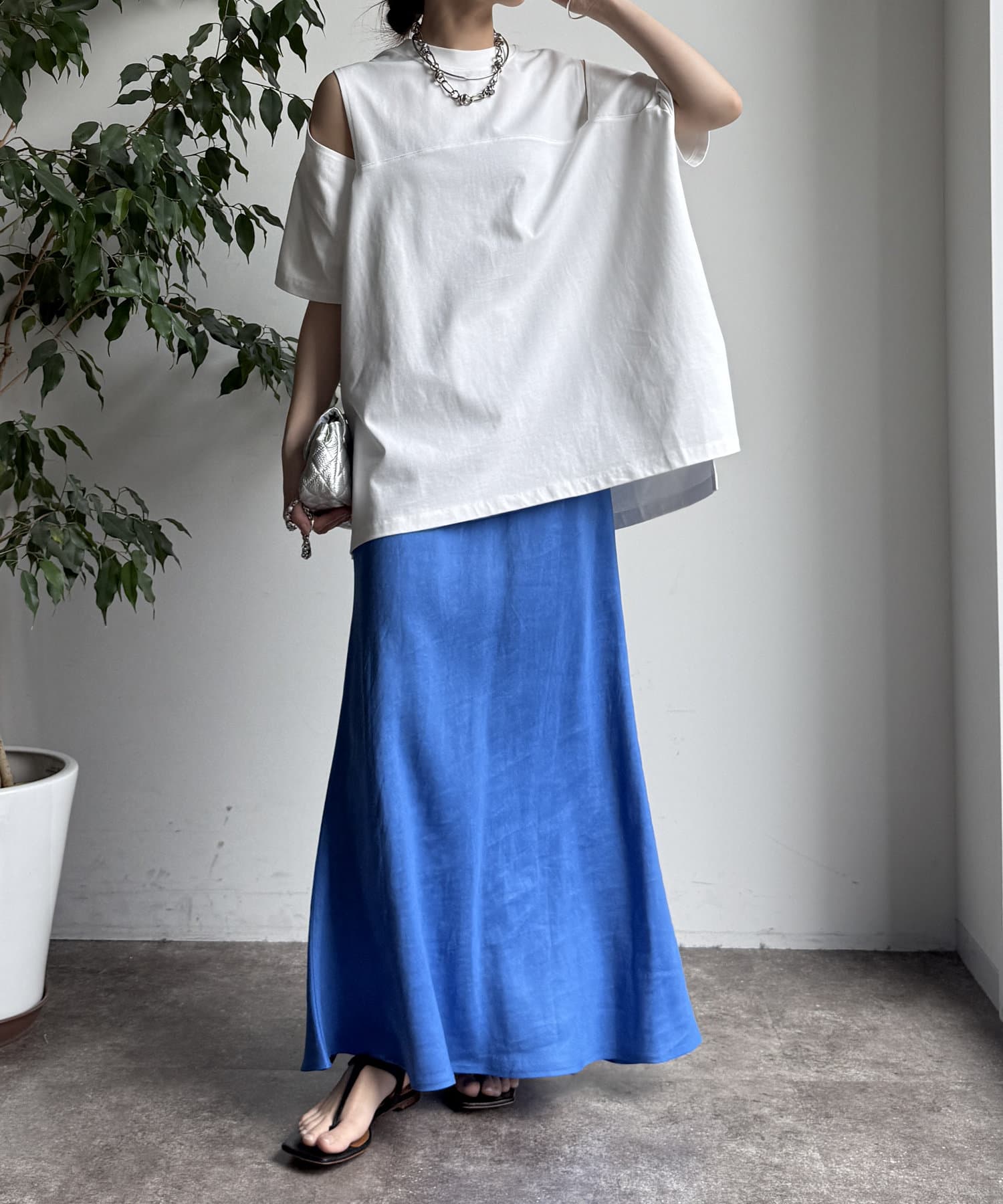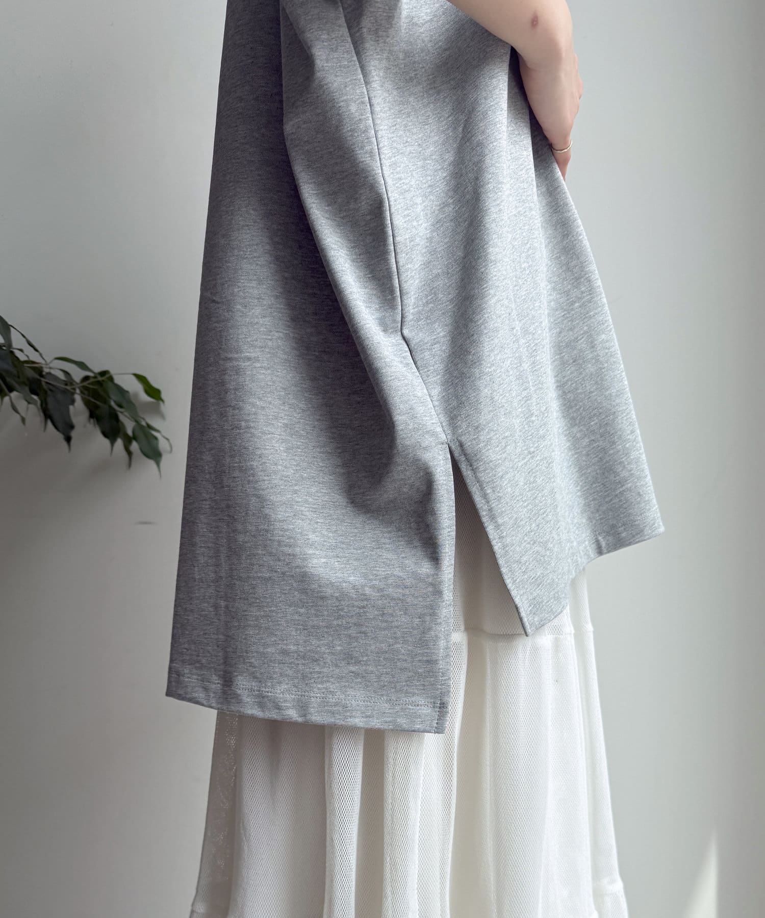 前後差のある裾のデザインは、横からのシルエットにも動きをプラス。