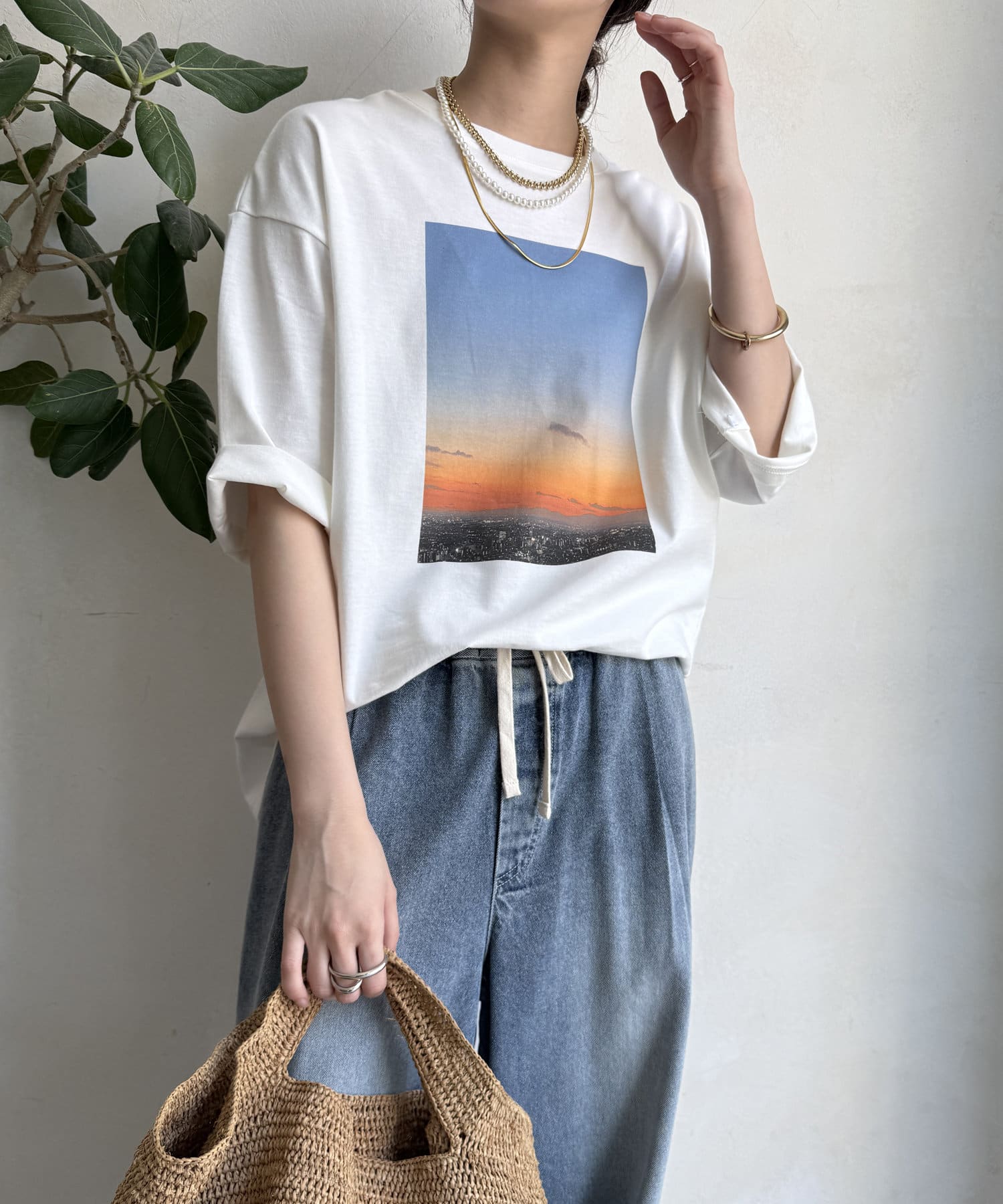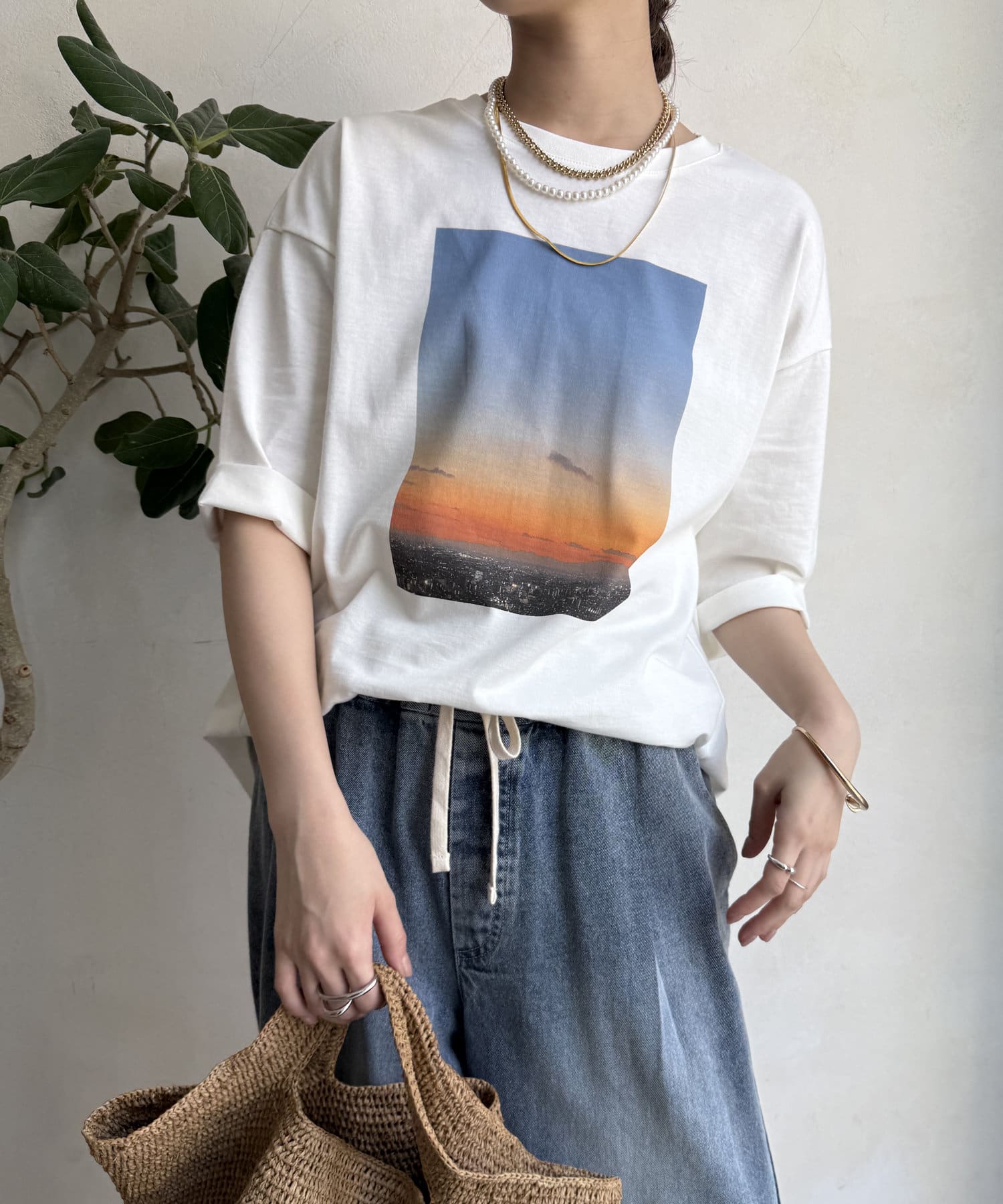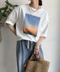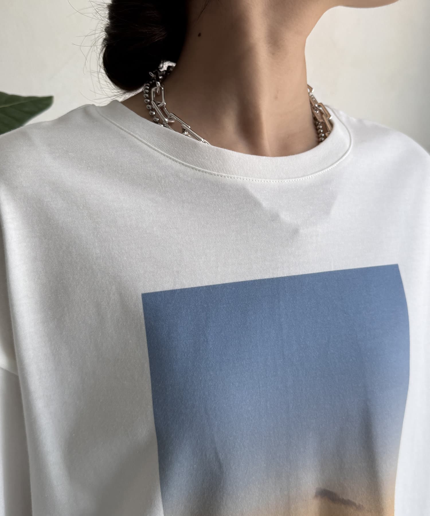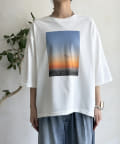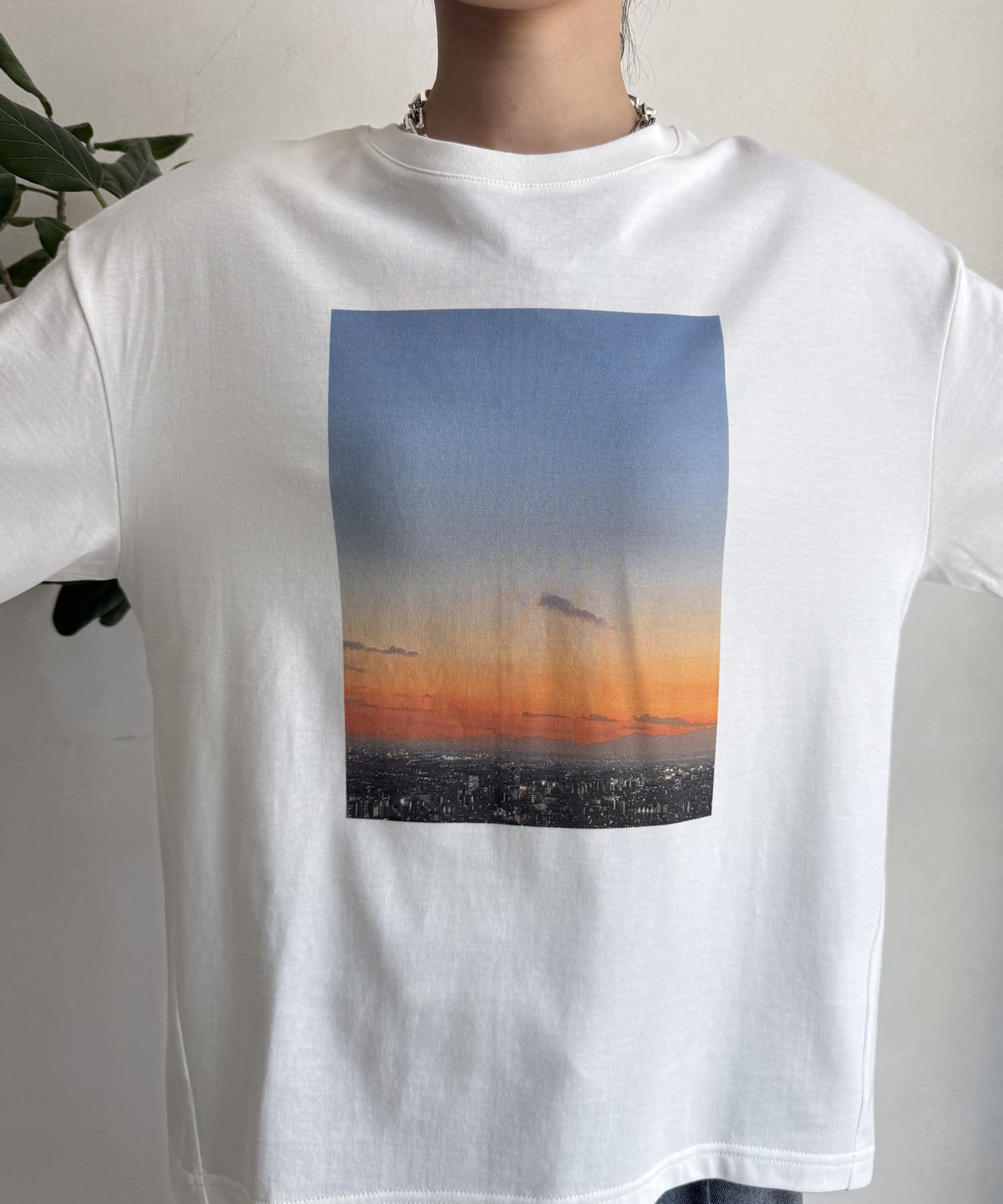 空のグラデーションが美しい、印象的な転写プリントTシャツ。