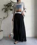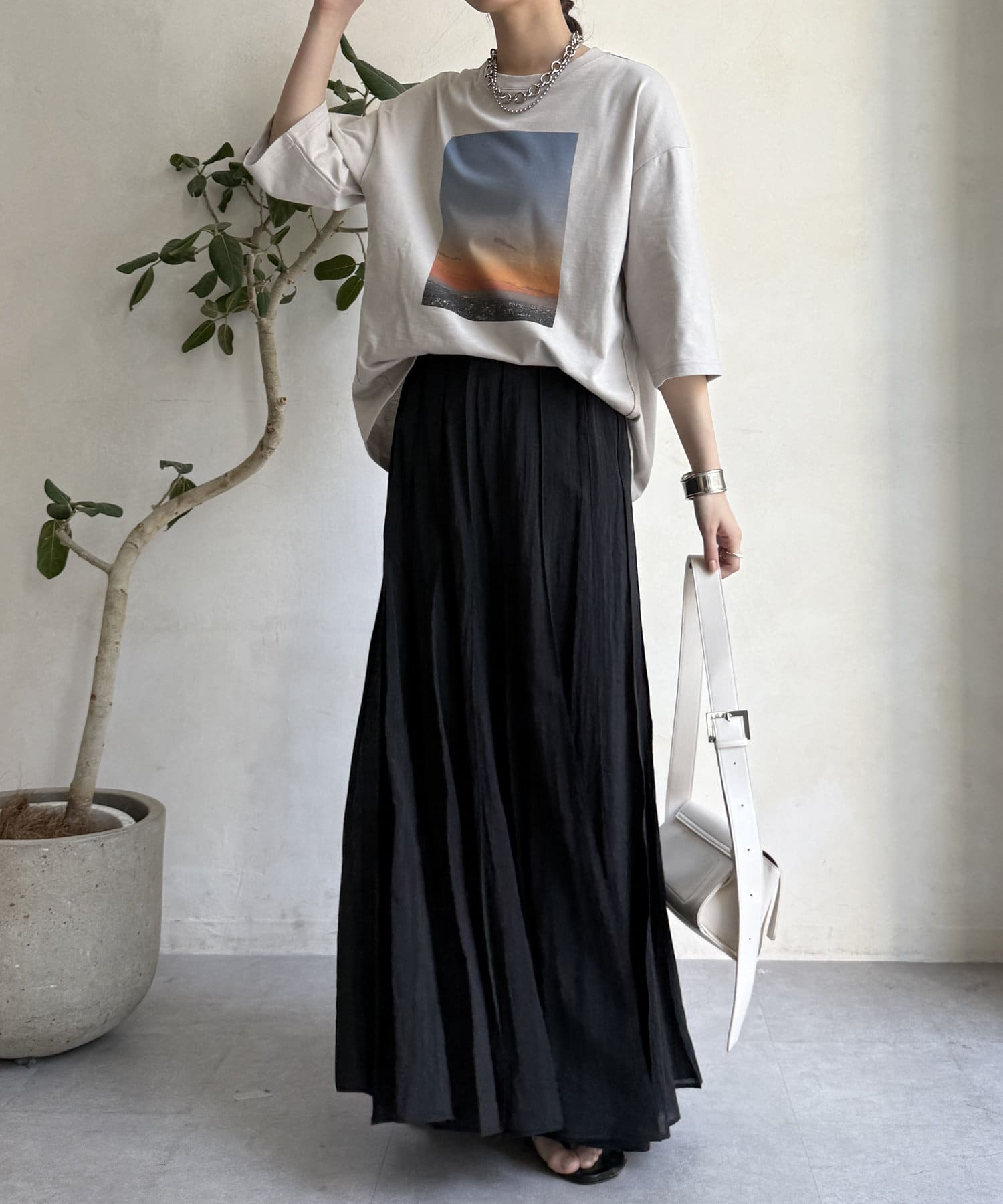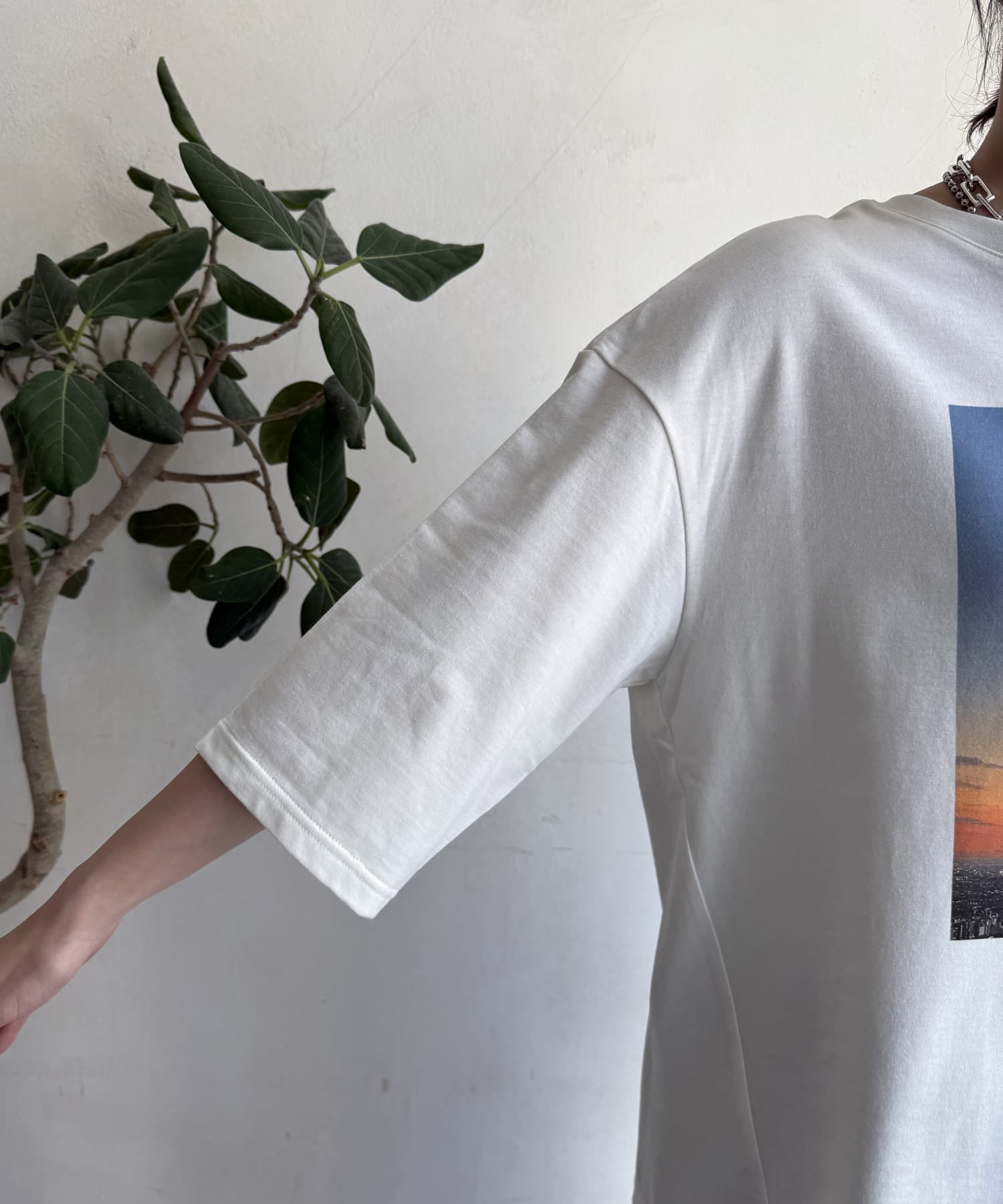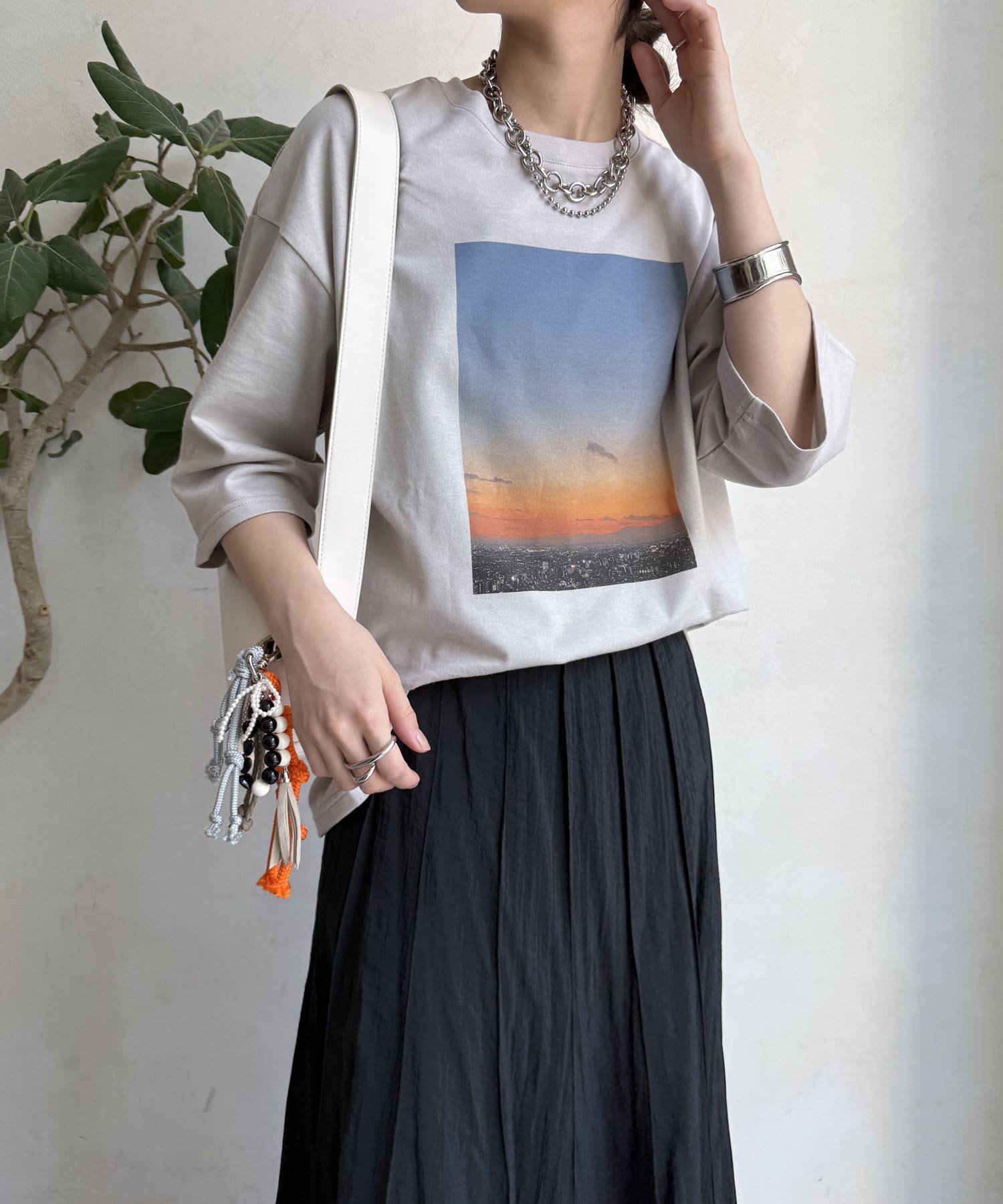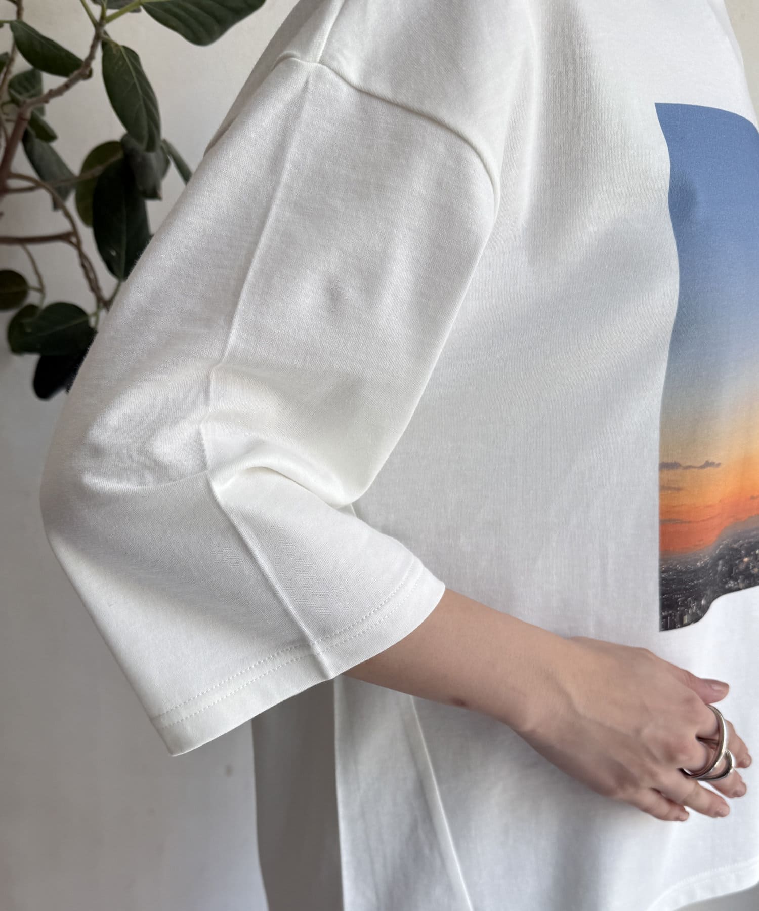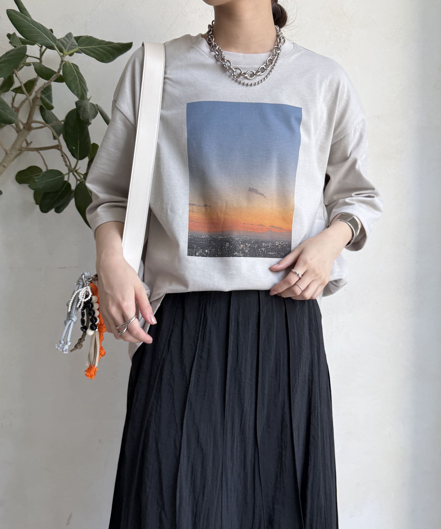 空のグラデーションが美しい、印象的な転写プリントTシャツ。