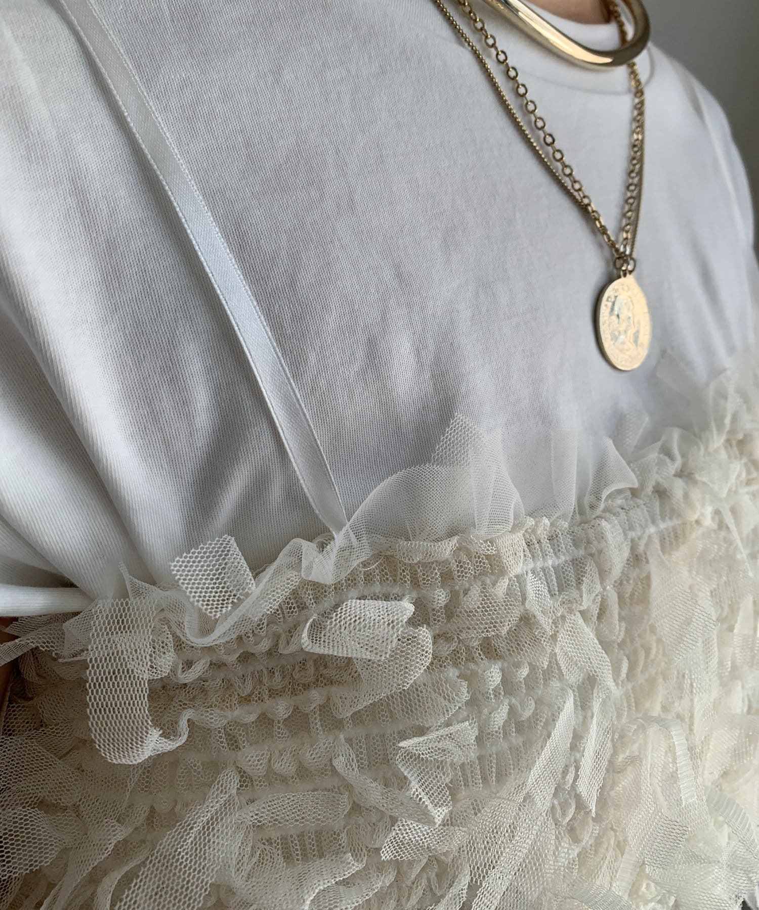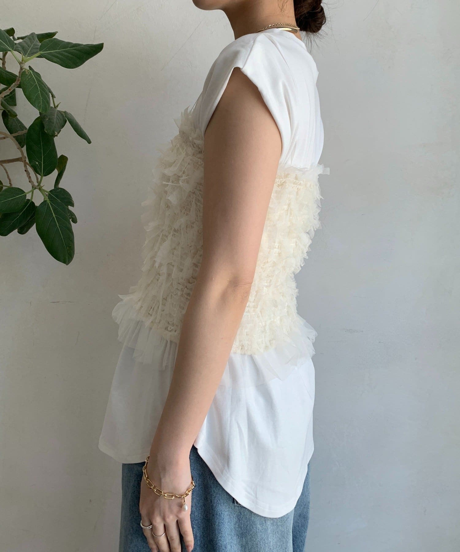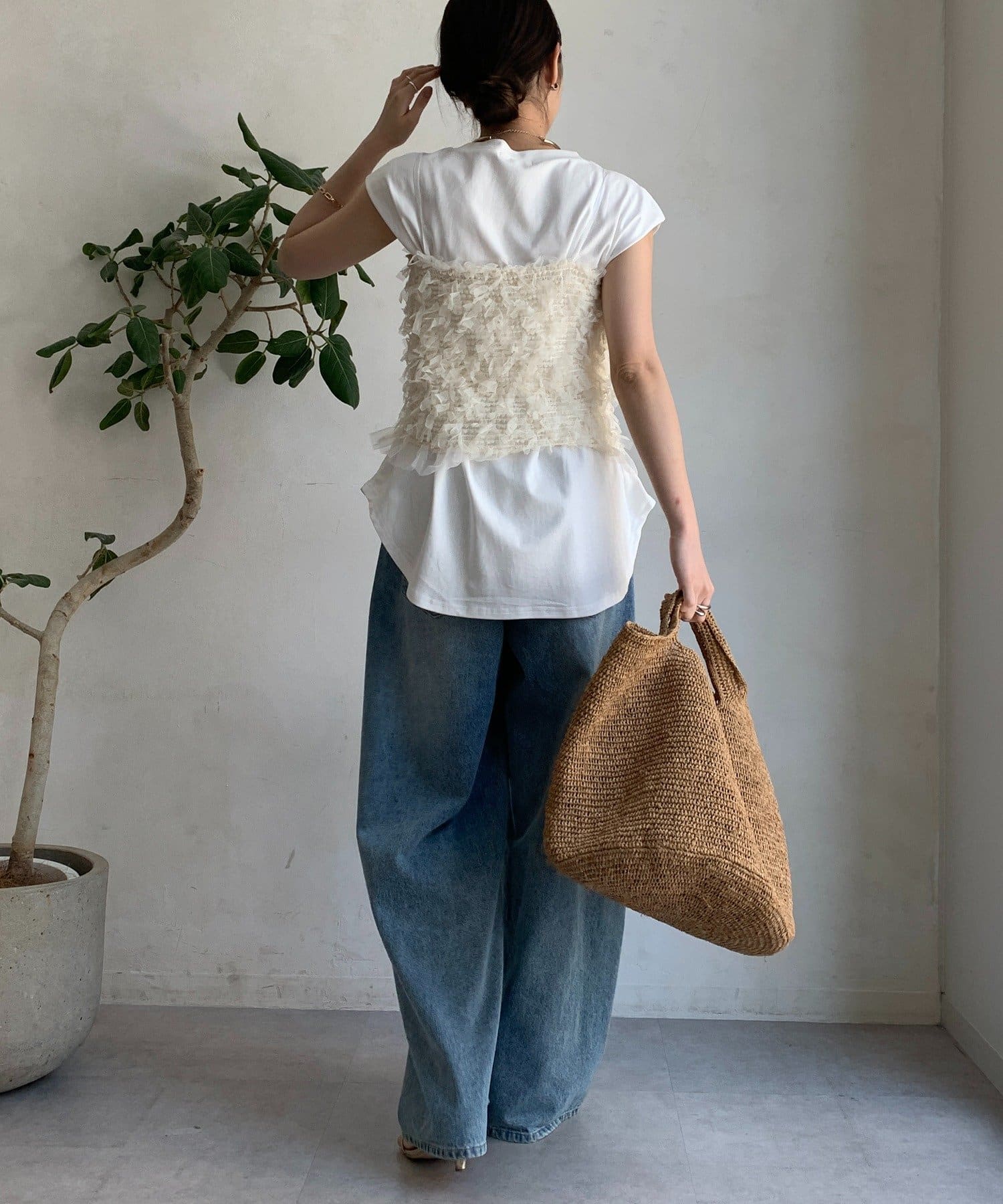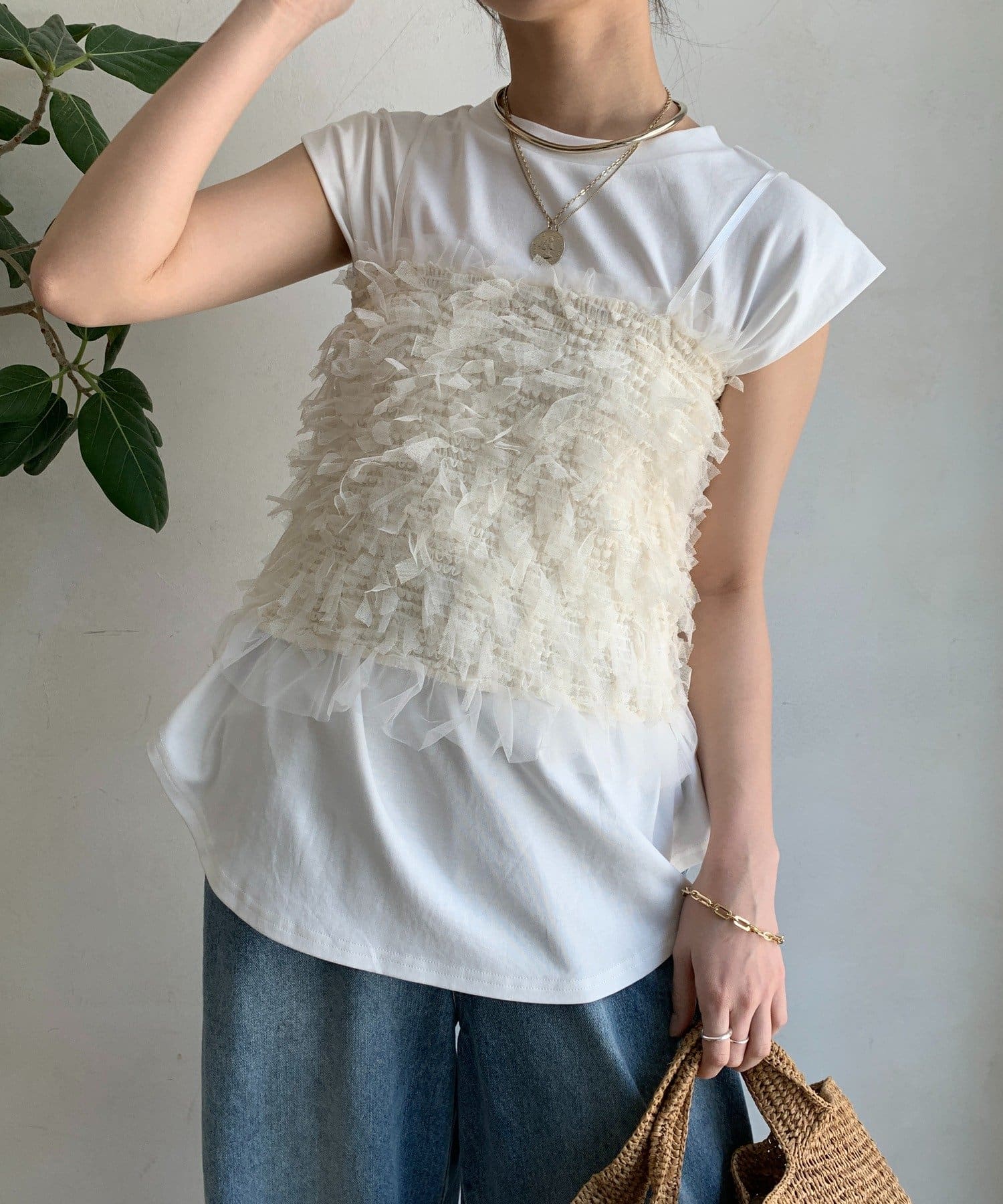 普段使いしやすいTシャツに、繊細なフリルをあしらったビスチェを重ねるだけで