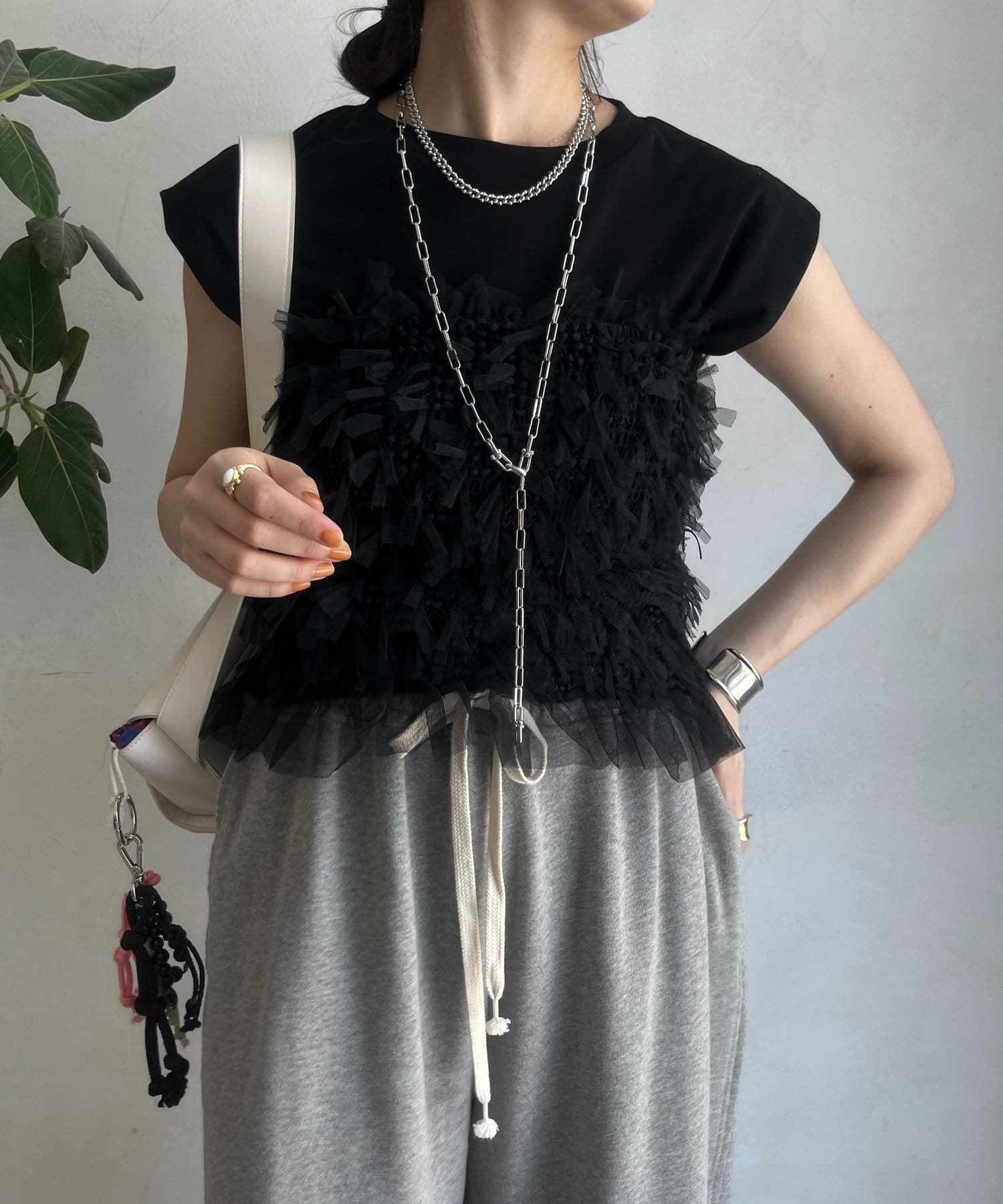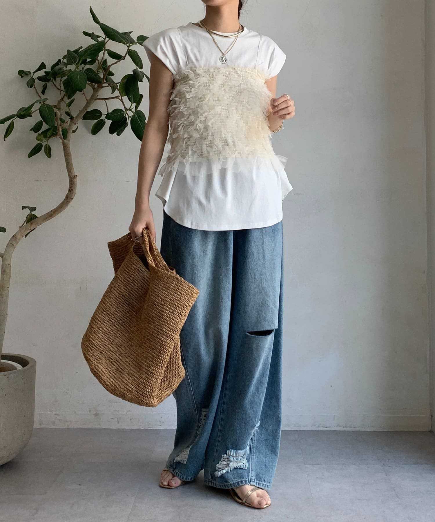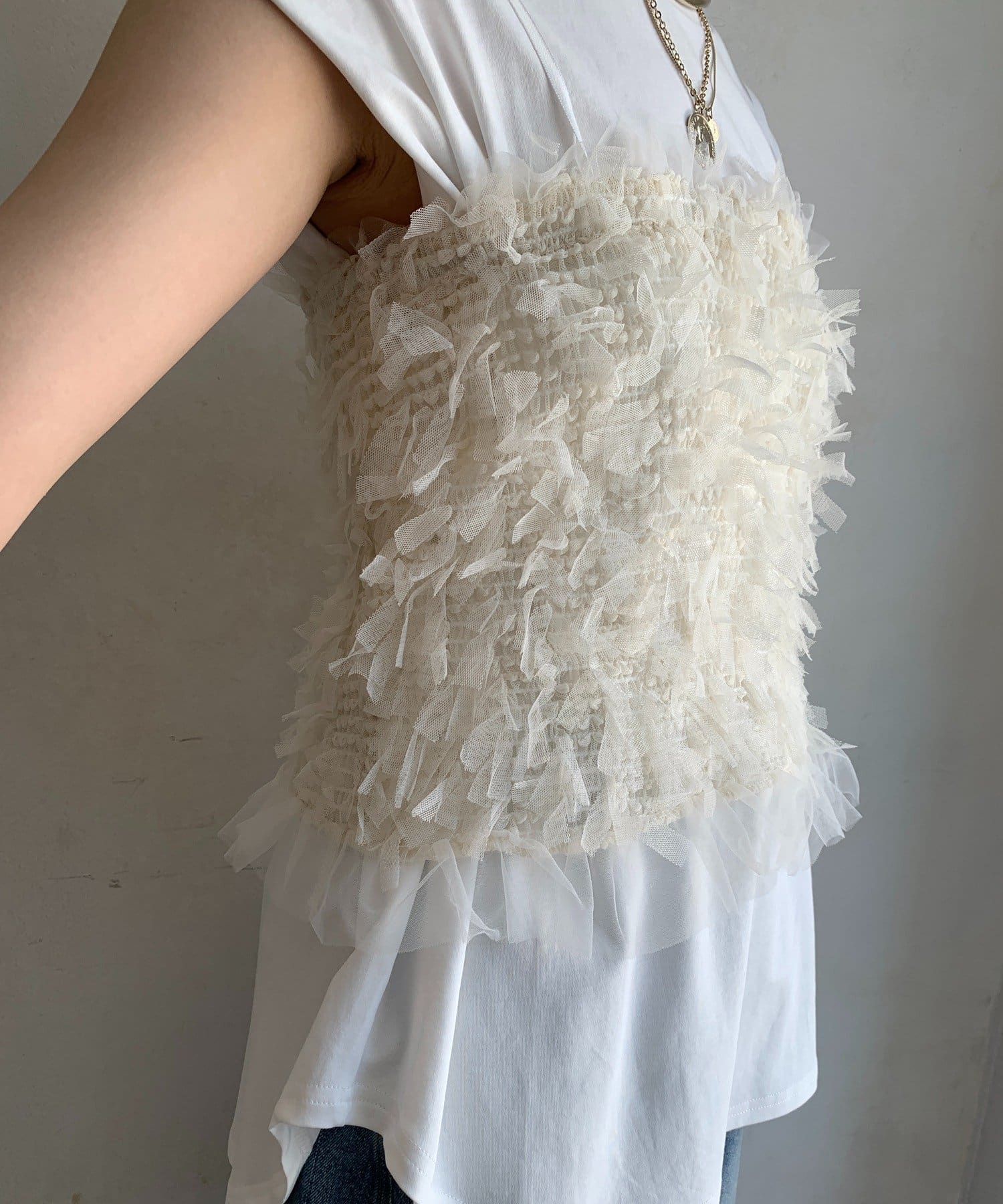 普段使いしやすいTシャツに、繊細なフリルをあしらったビスチェを重ねるだけで
