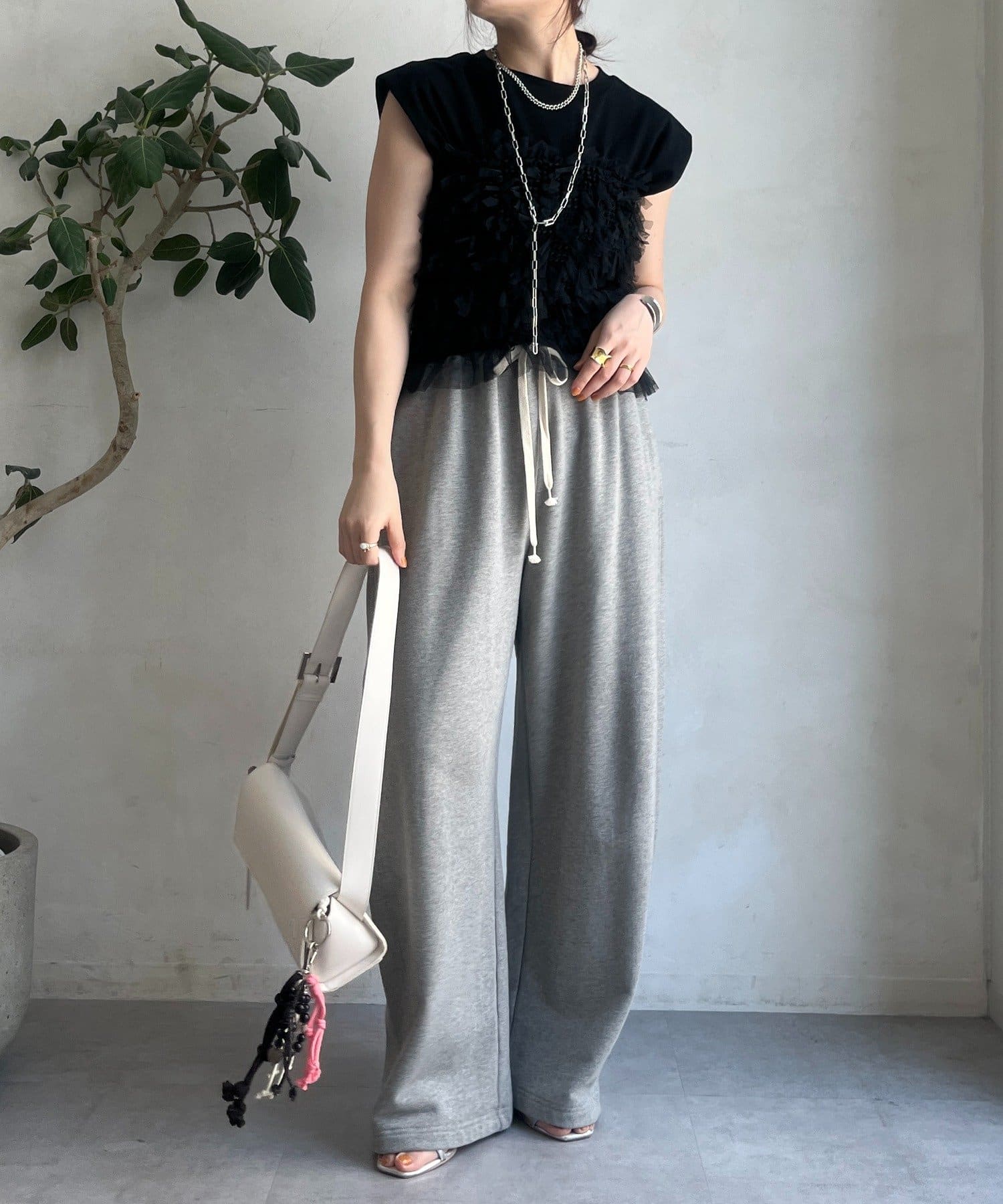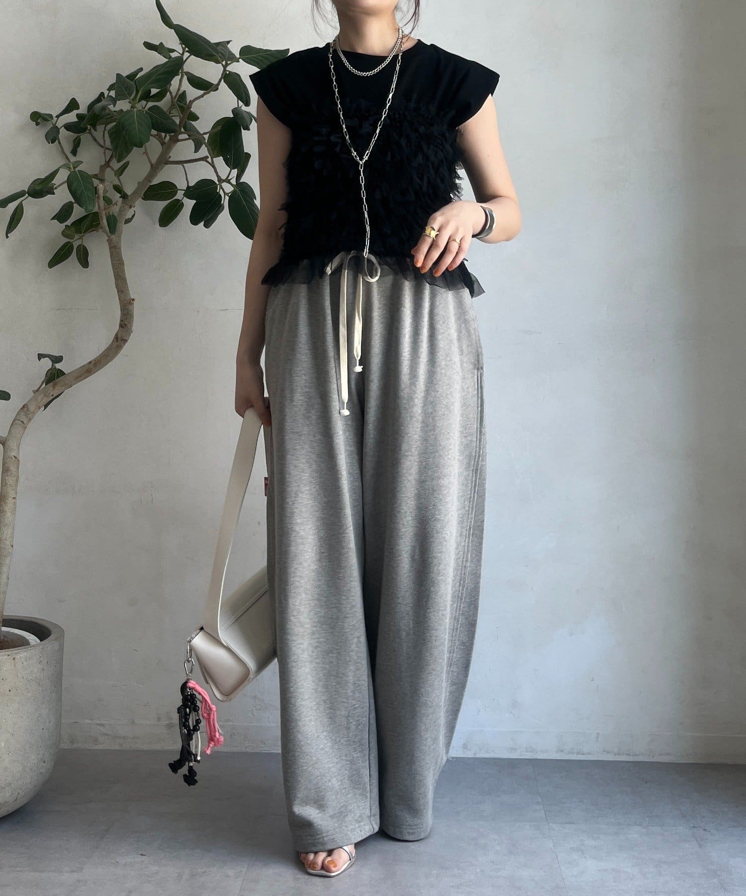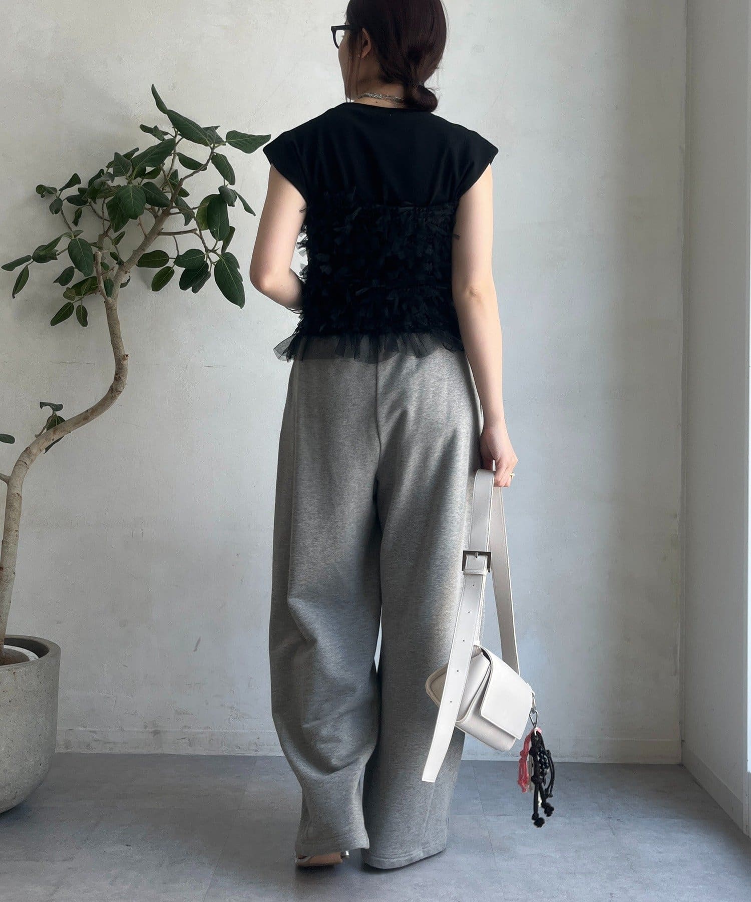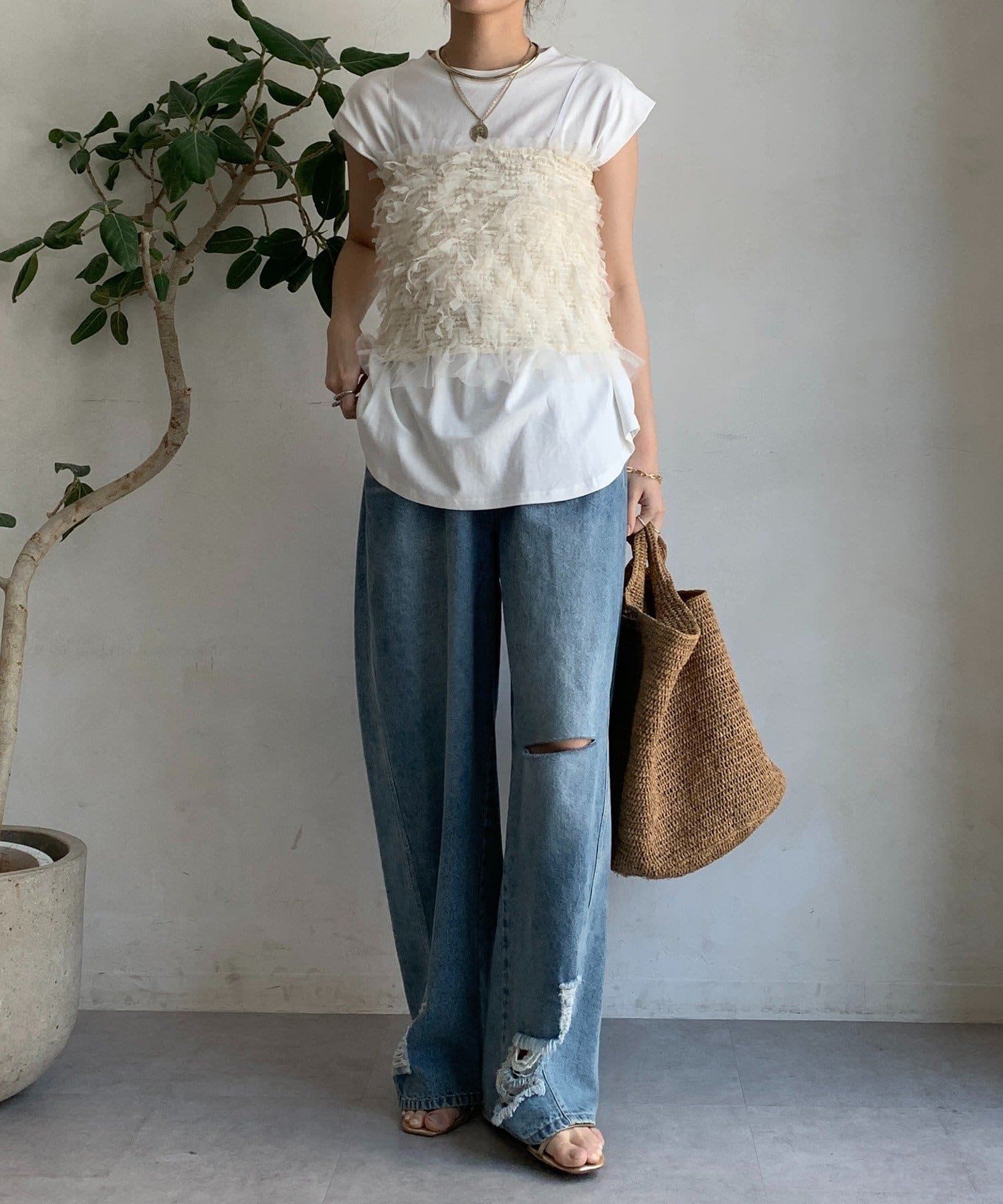 普段使いしやすいTシャツに、繊細なフリルをあしらったビスチェを重ねるだけで