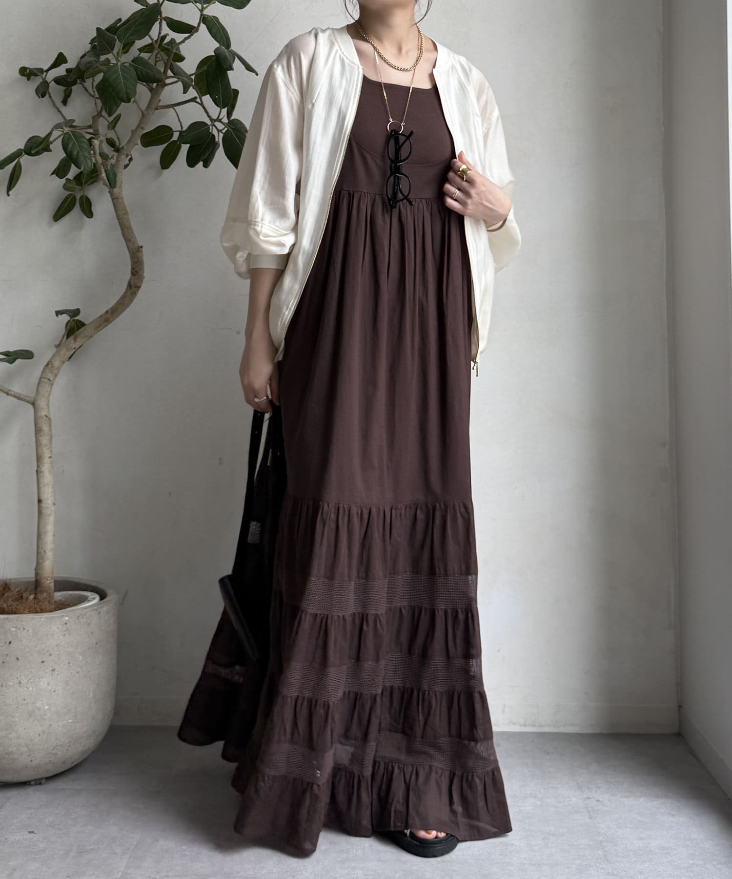 タンクトップやキャミソールに羽織れば、ヘルシーな肌見せスタイルが楽しめます。