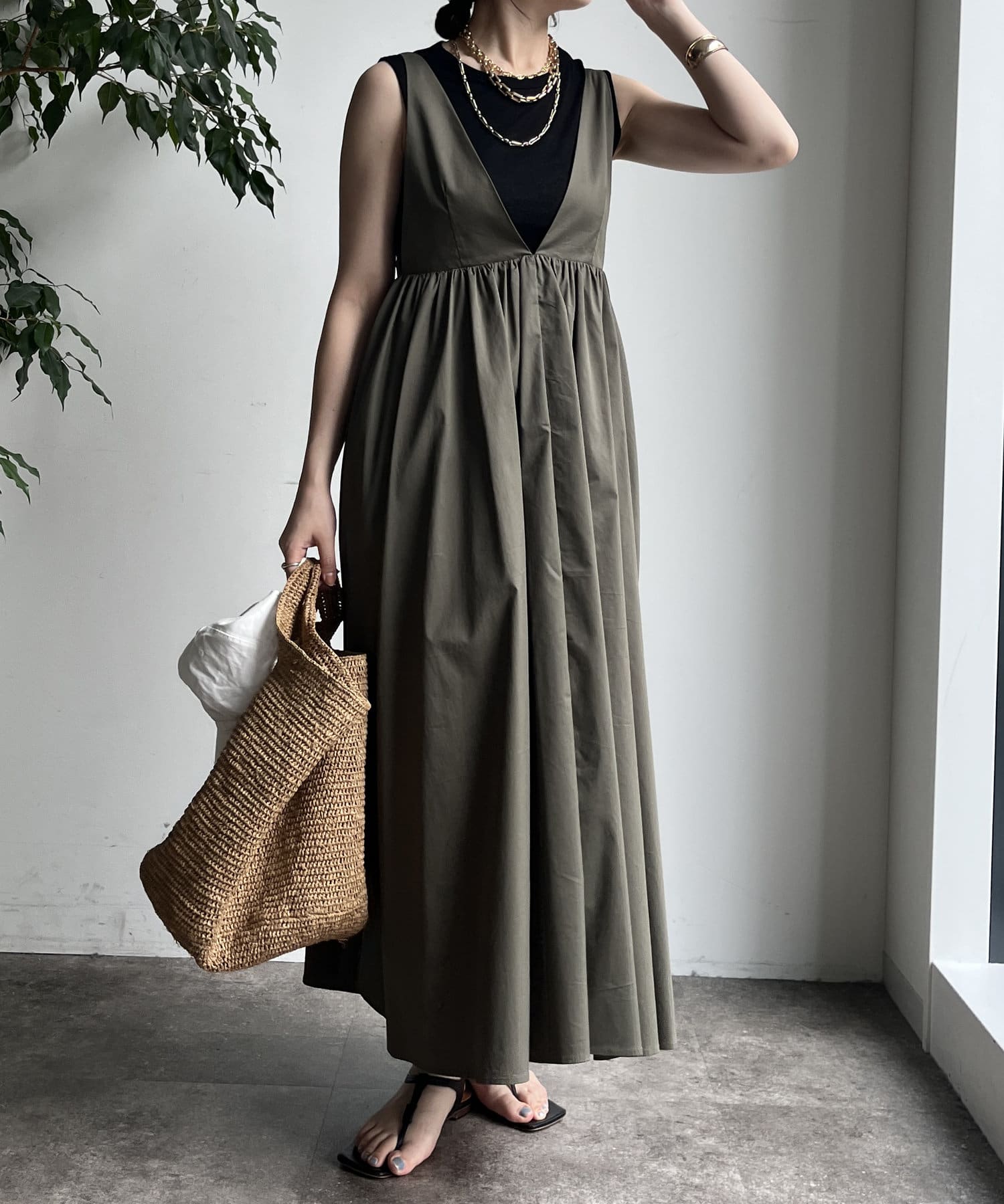 深めのVネックと、ふんわりと広がるボリュームシルエットが魅力のワンピース。