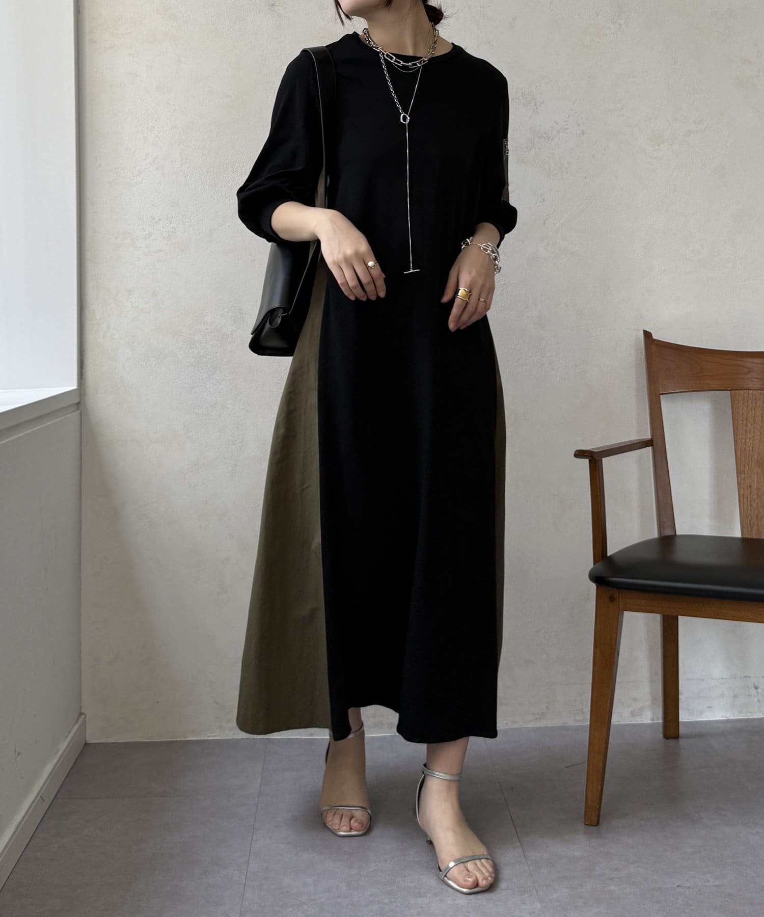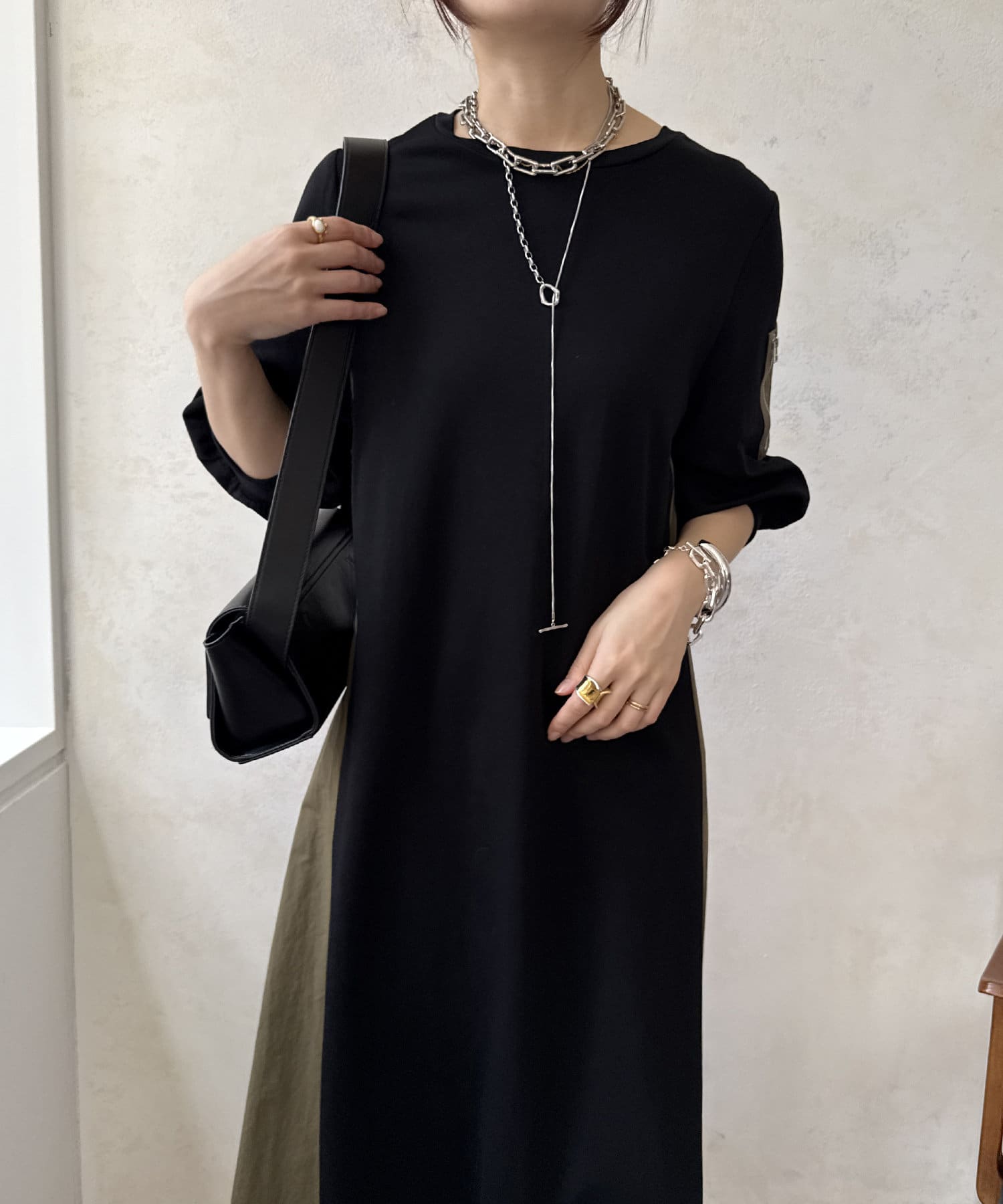 都会的な洗練さとミリタリーテイストを融合させた、着回し力抜群の異素材切替ワンピース!