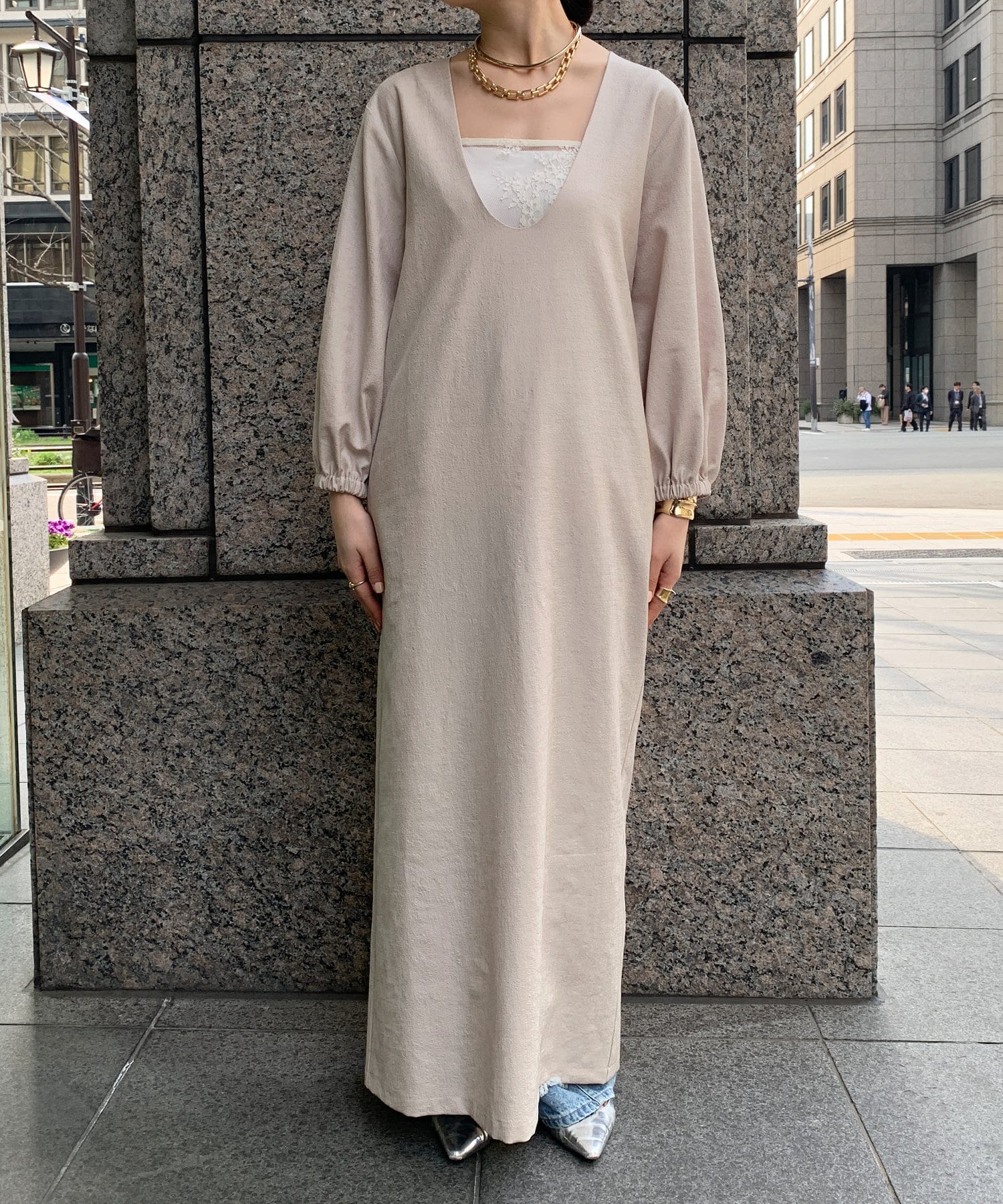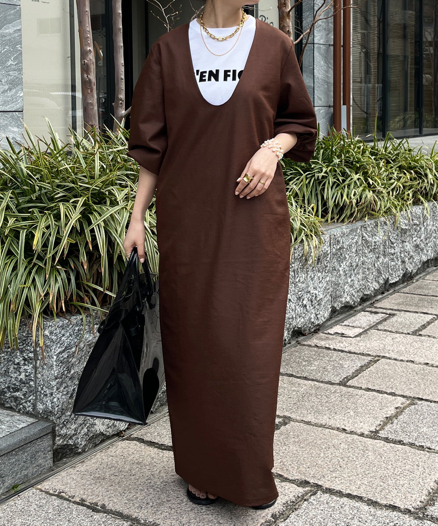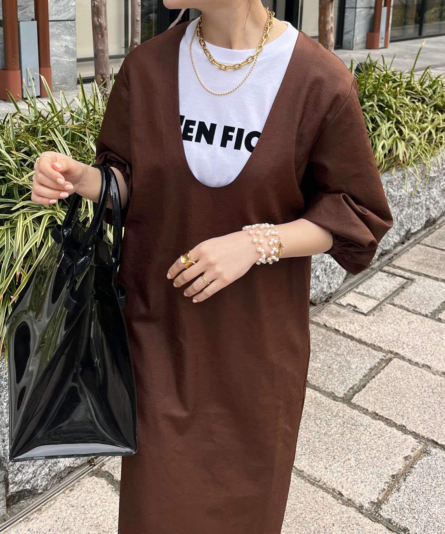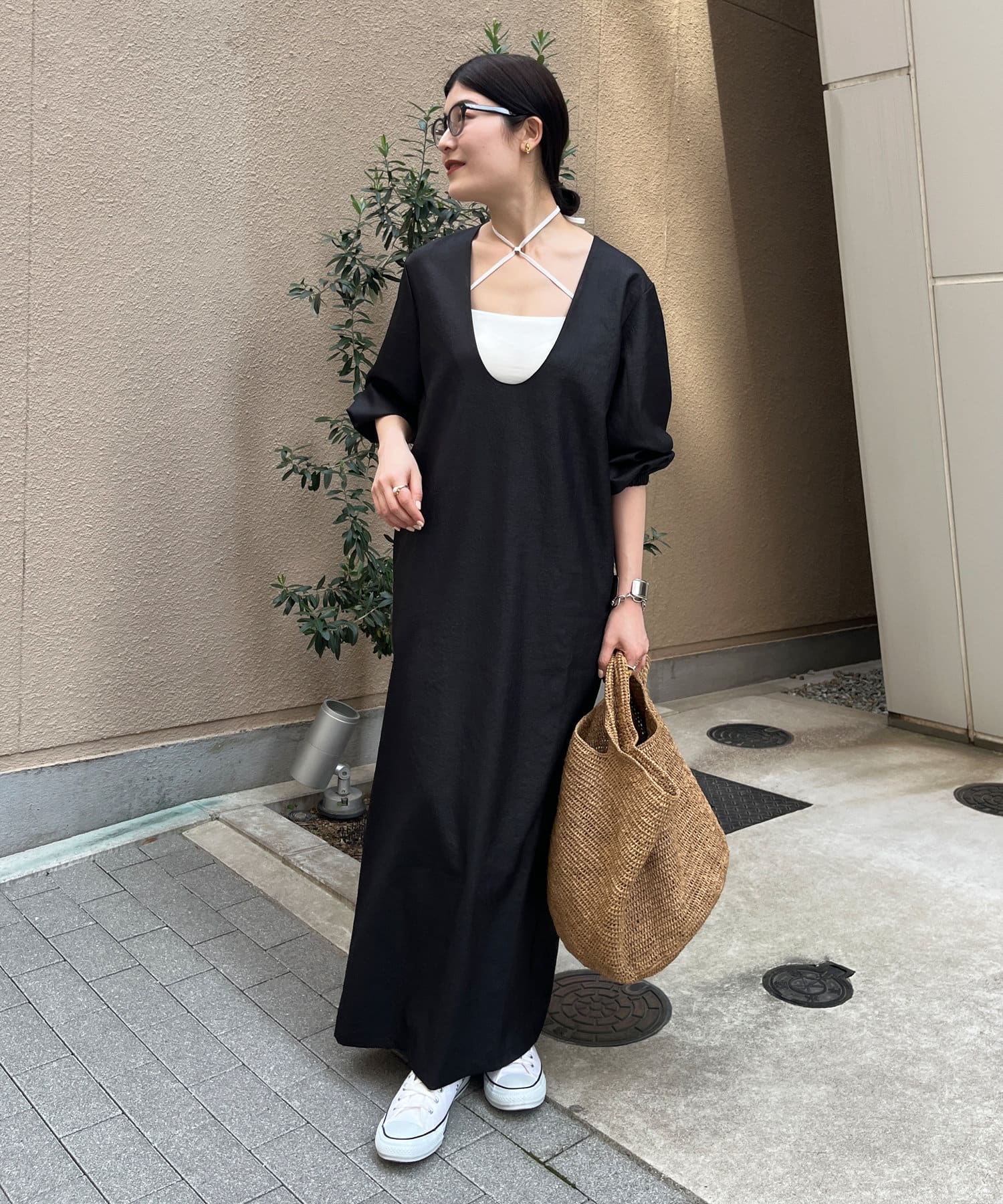 深めのUネックデザインのため、合わせるインナー次第で雰囲気を変えられます◎