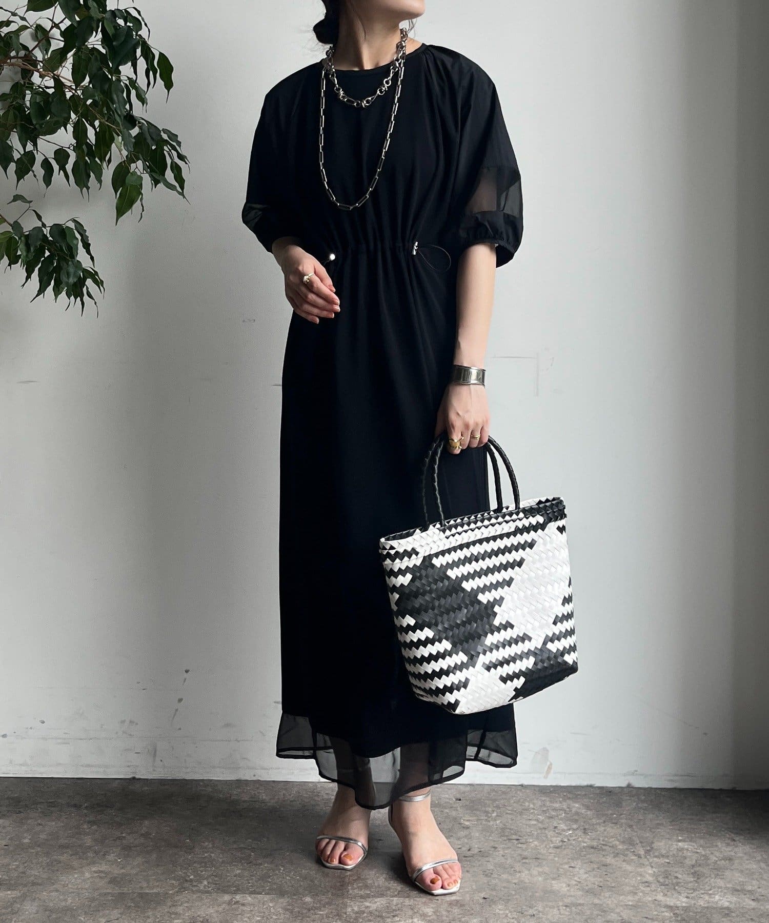 異なる素材を組み合わせることで、シンプルながらも印象的なスタイルを叶えてくれる