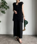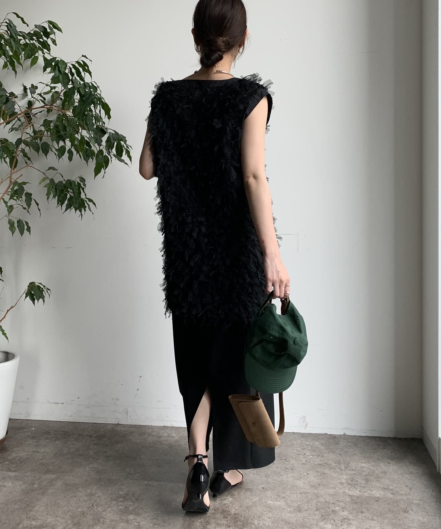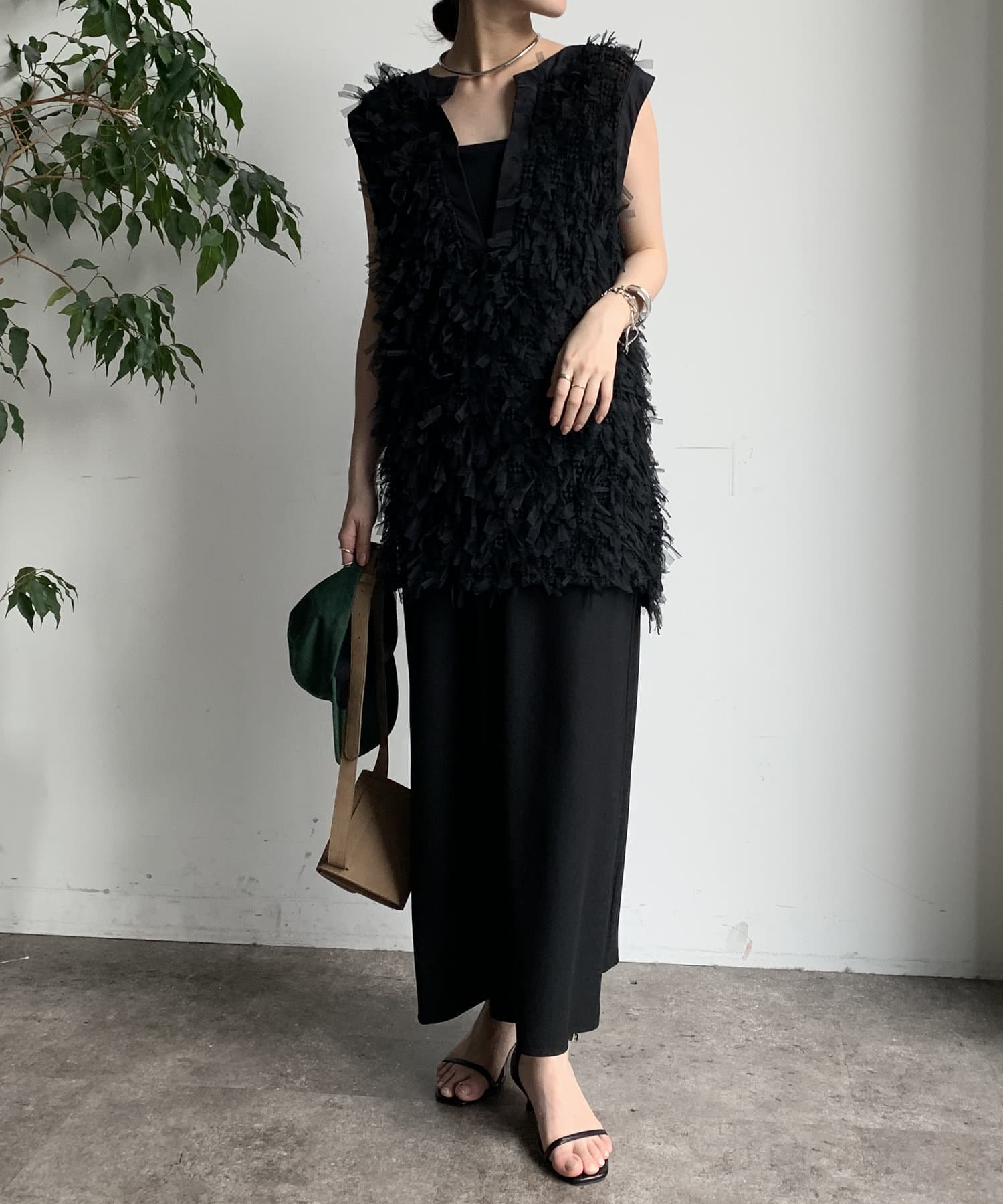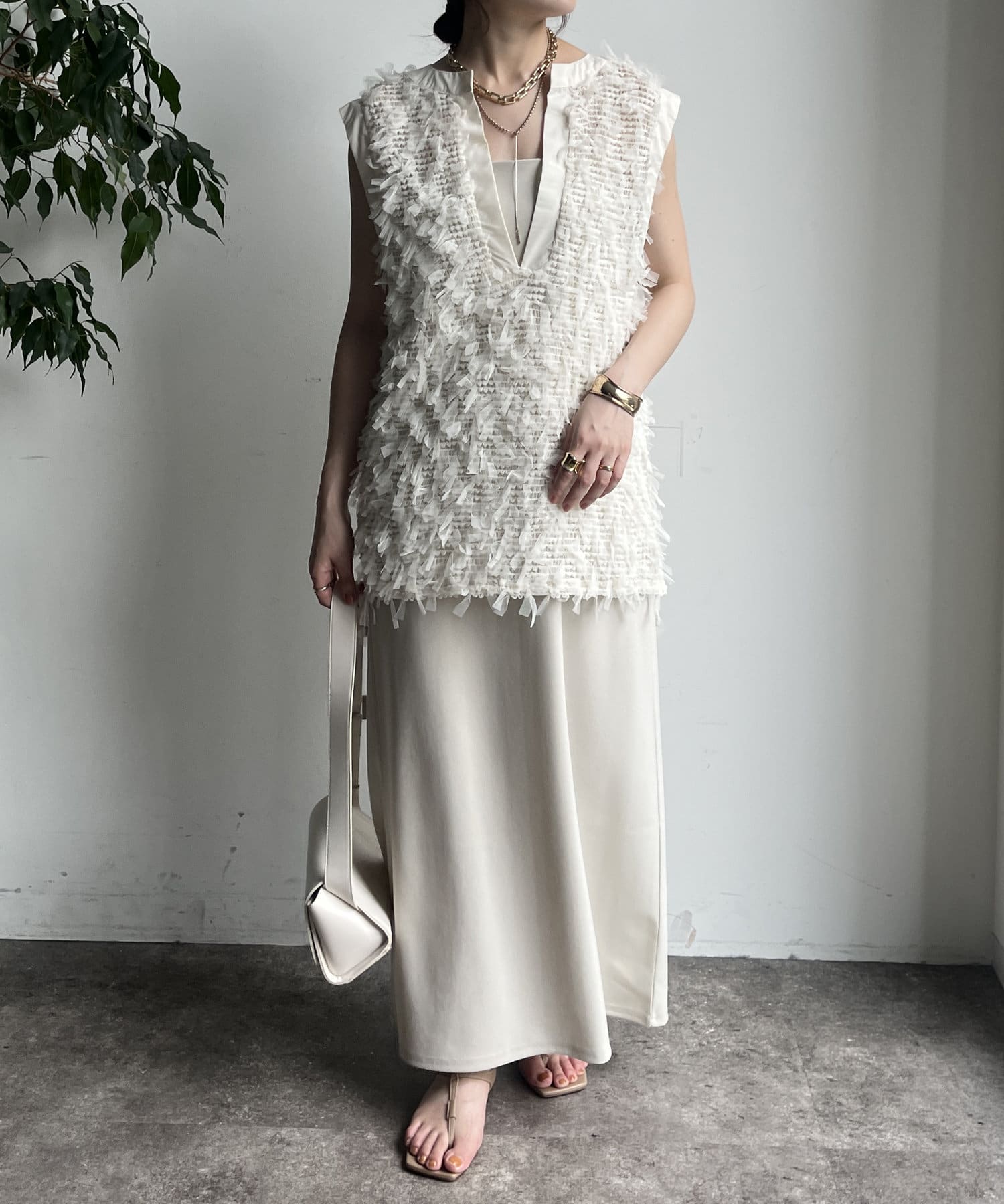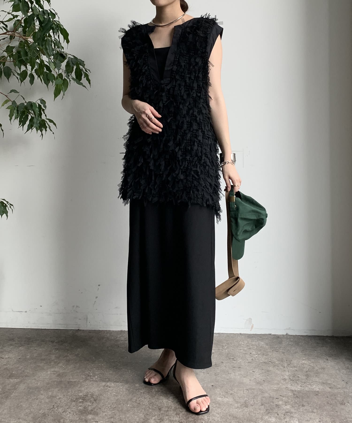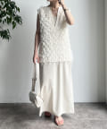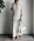 シンプルなワンピースに、デザイン性の高いベストを重ねることで