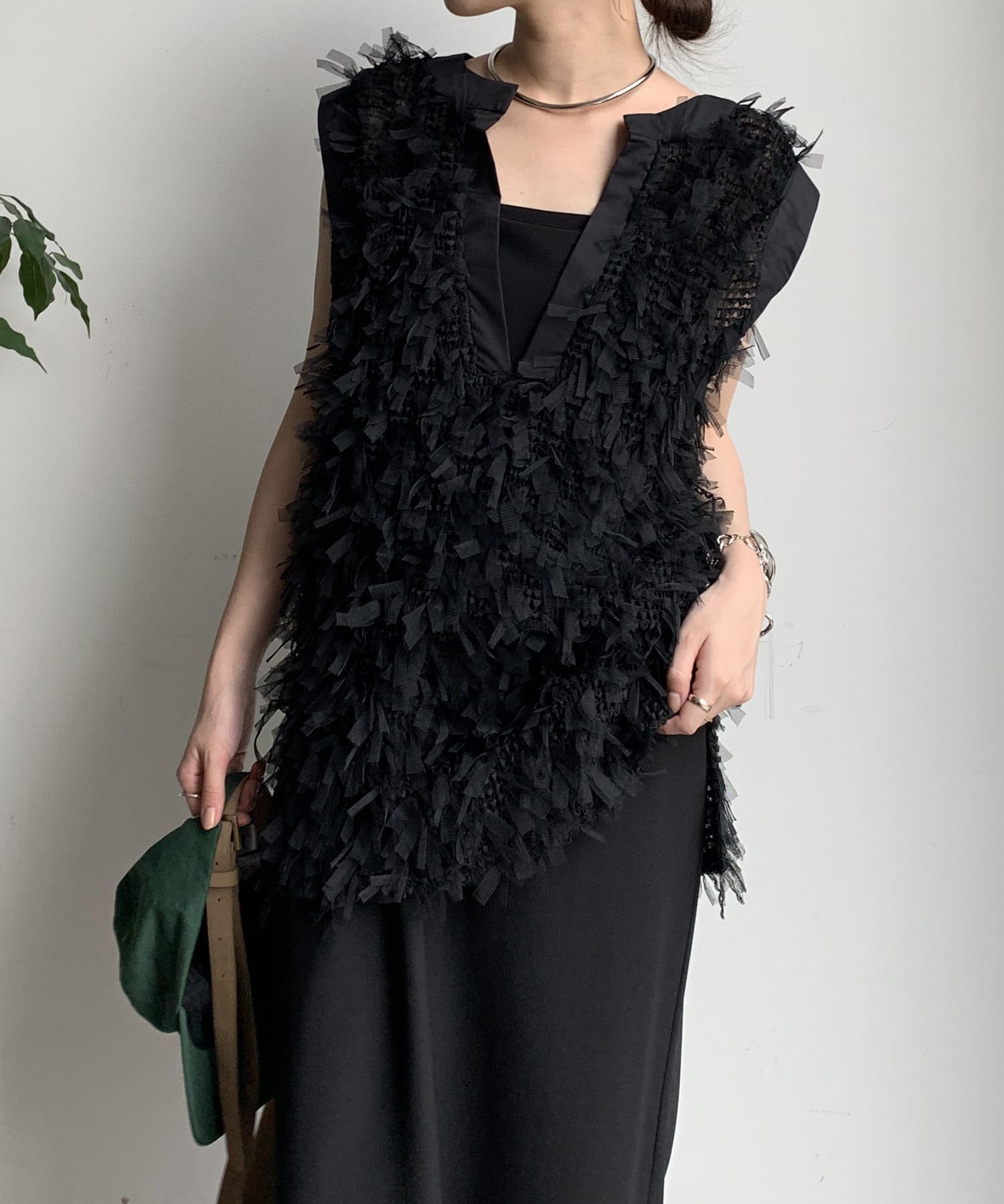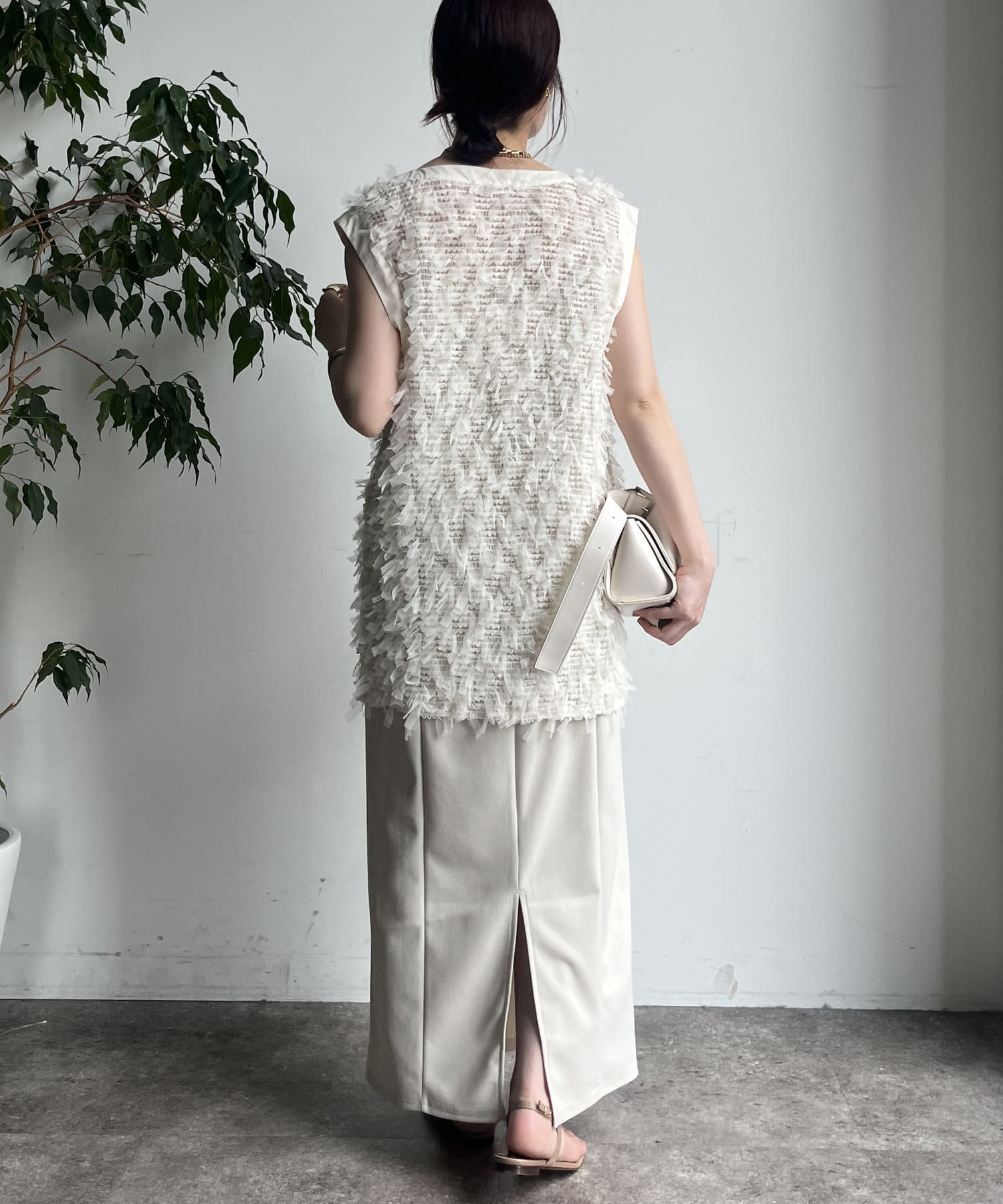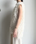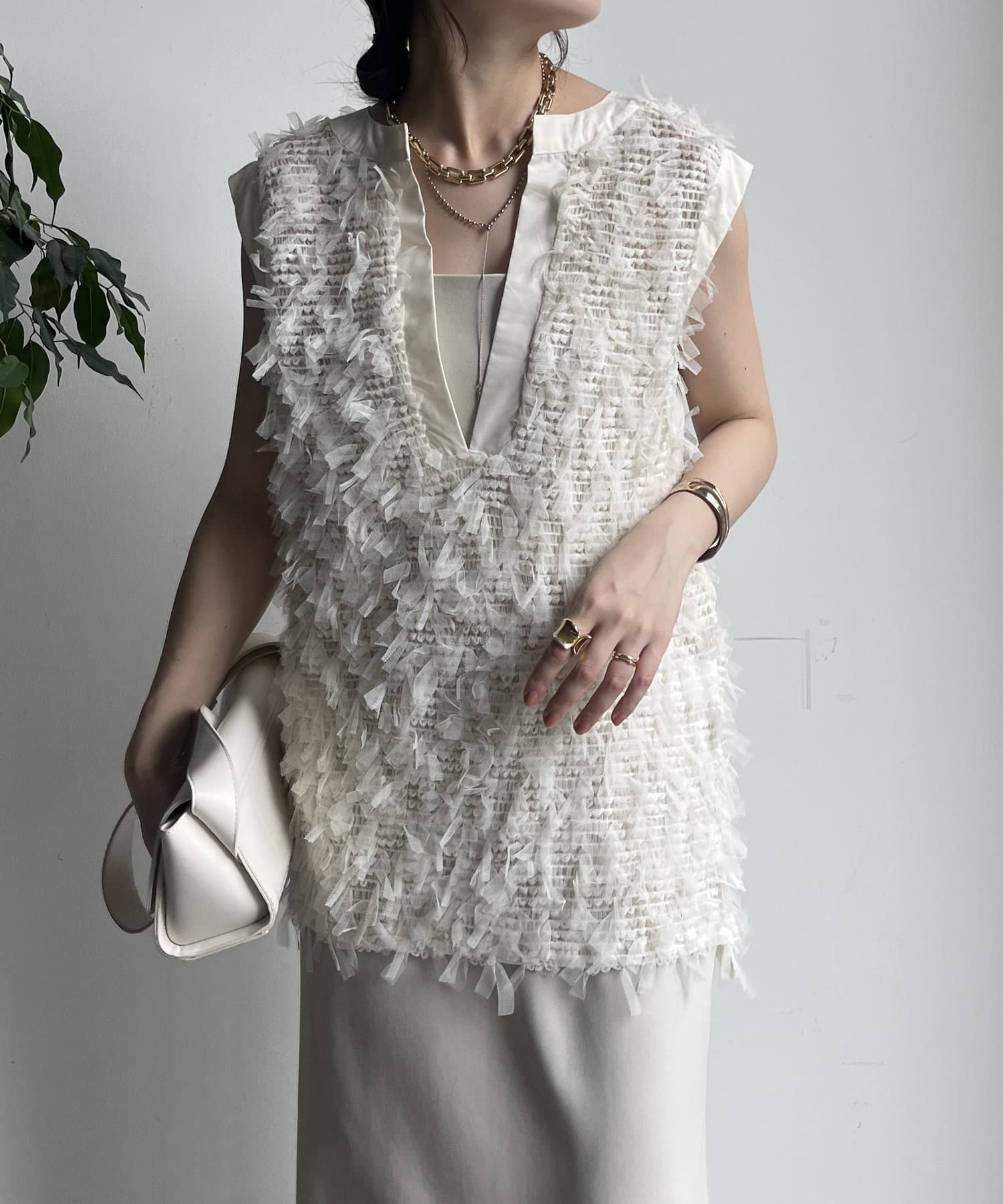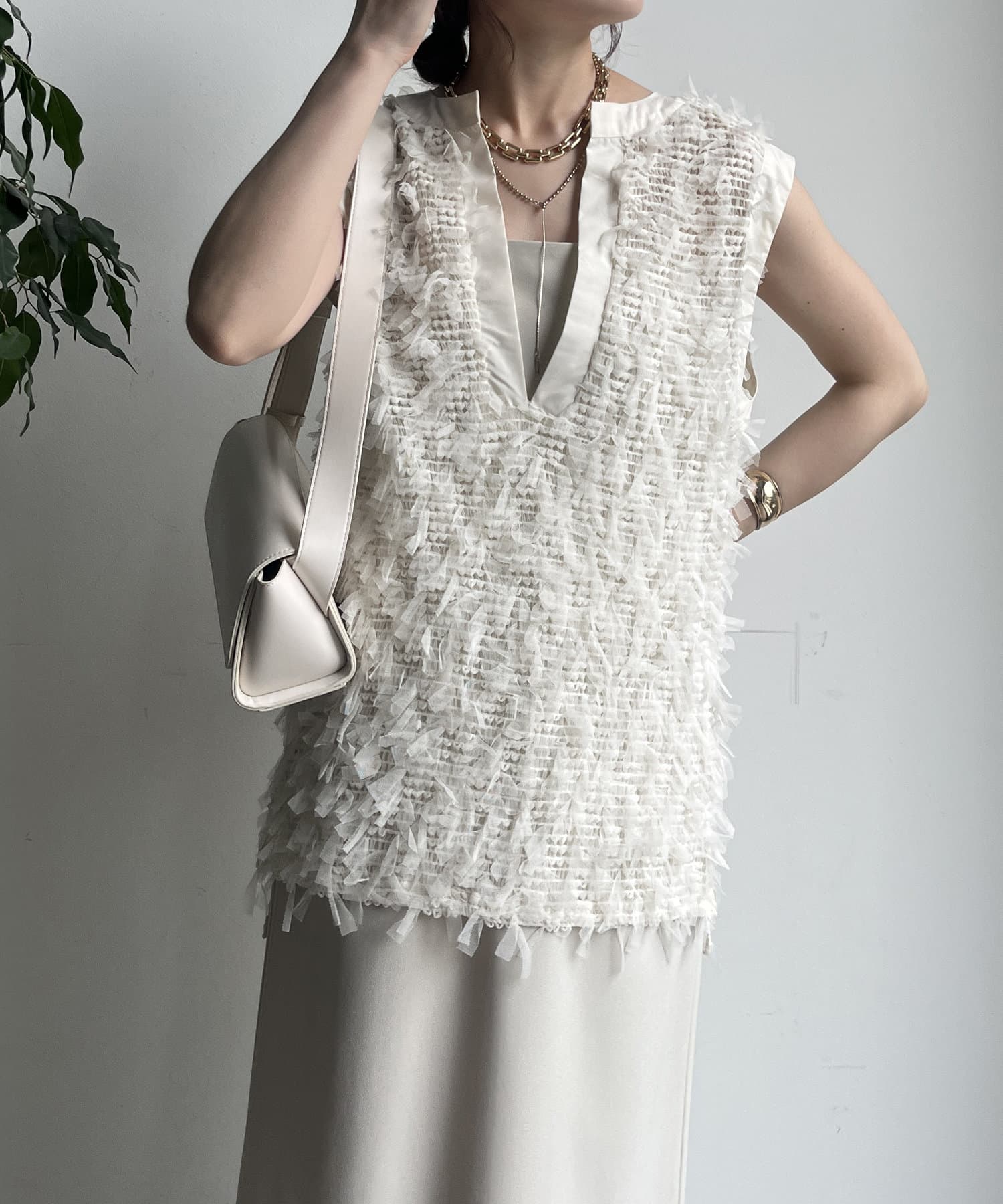 シンプルなワンピースに、デザイン性の高いベストを重ねることで