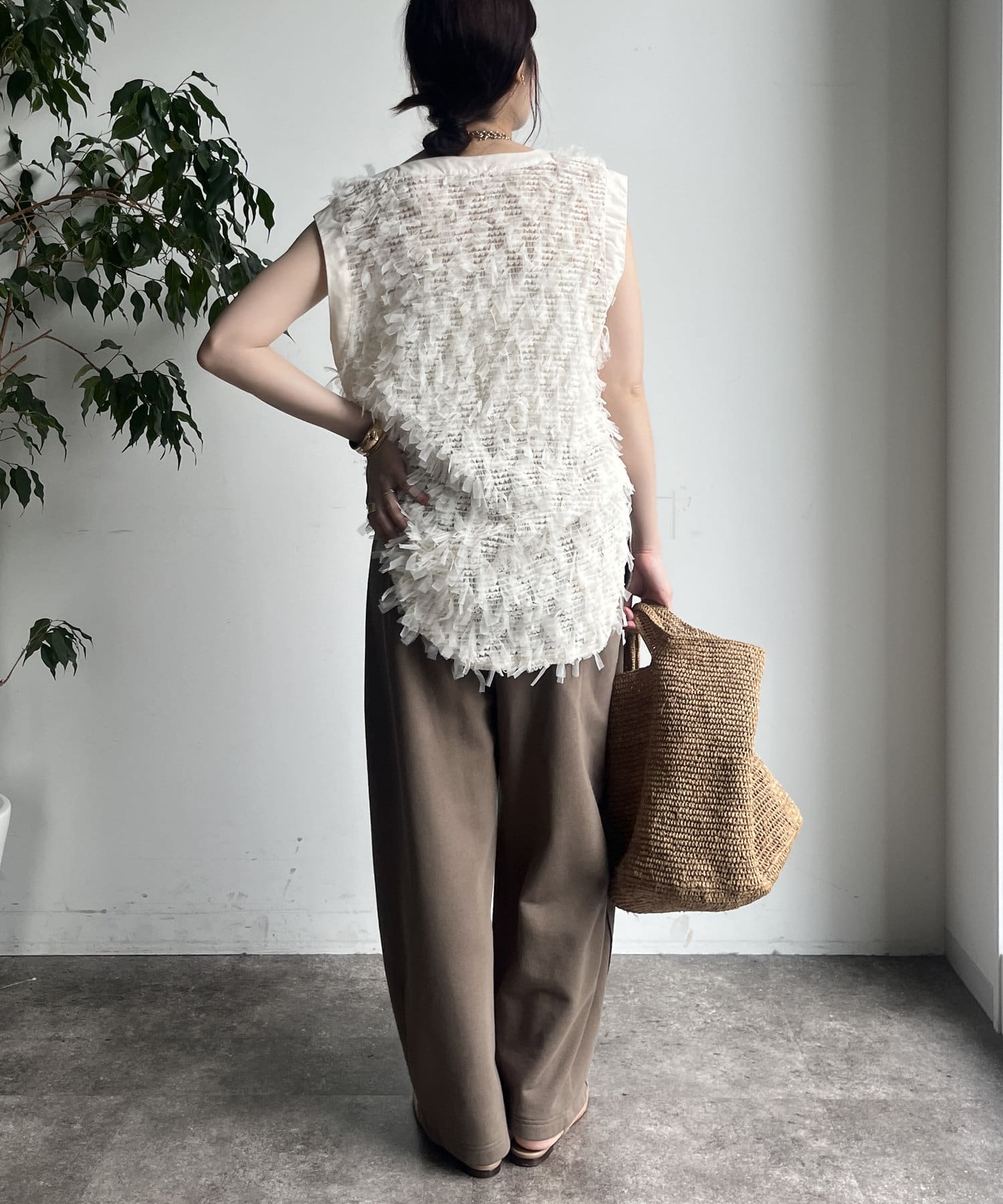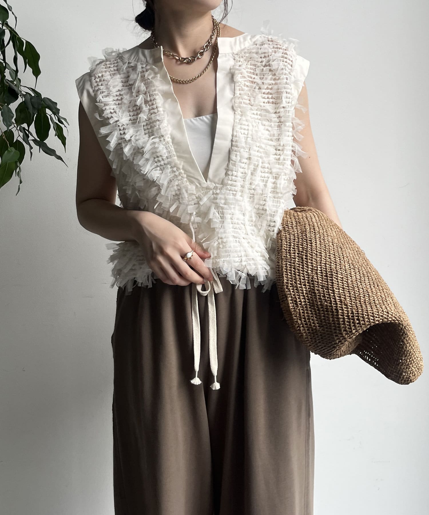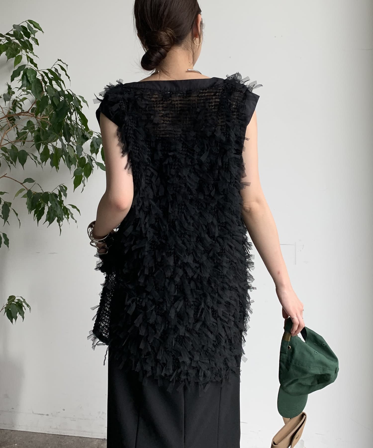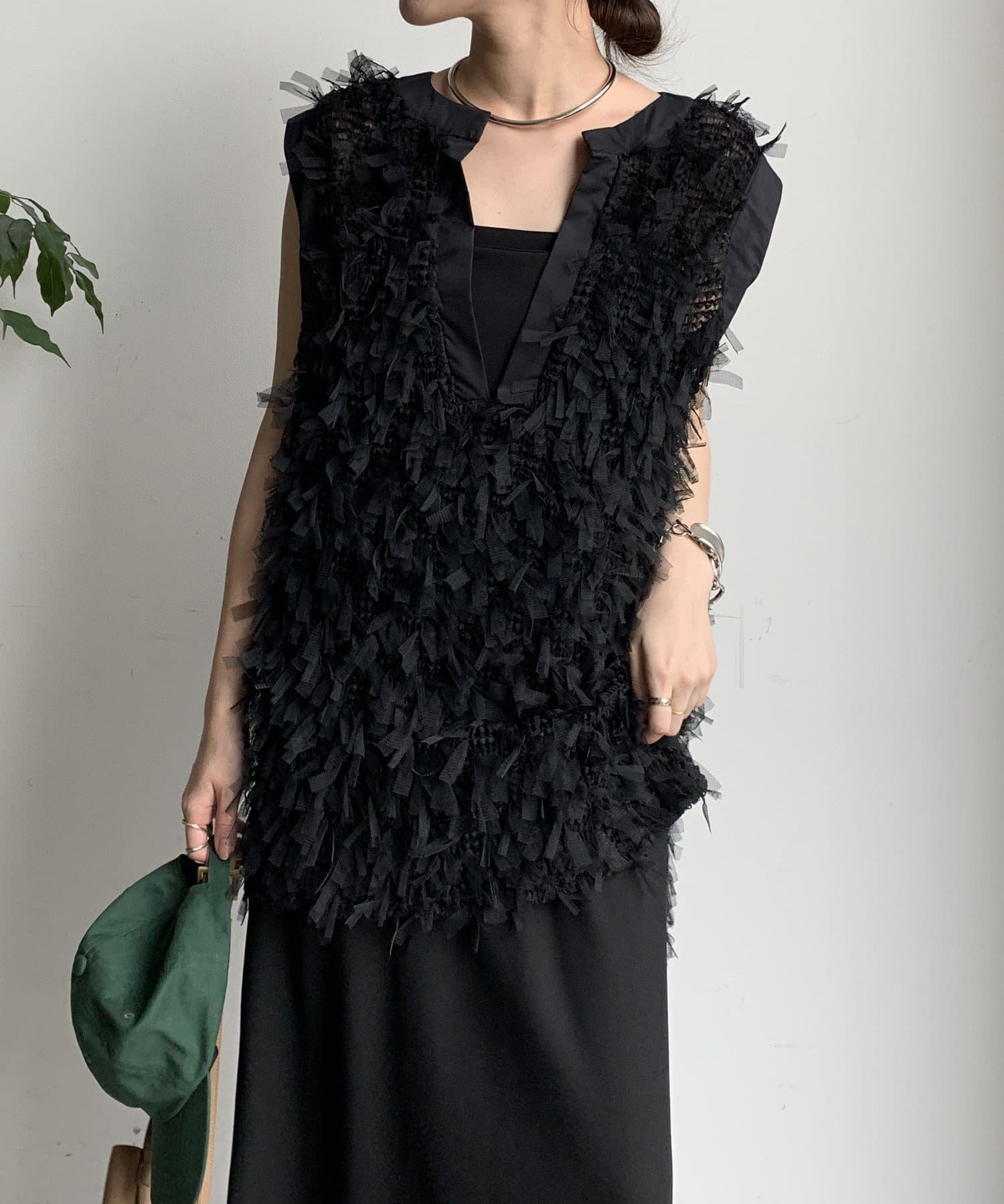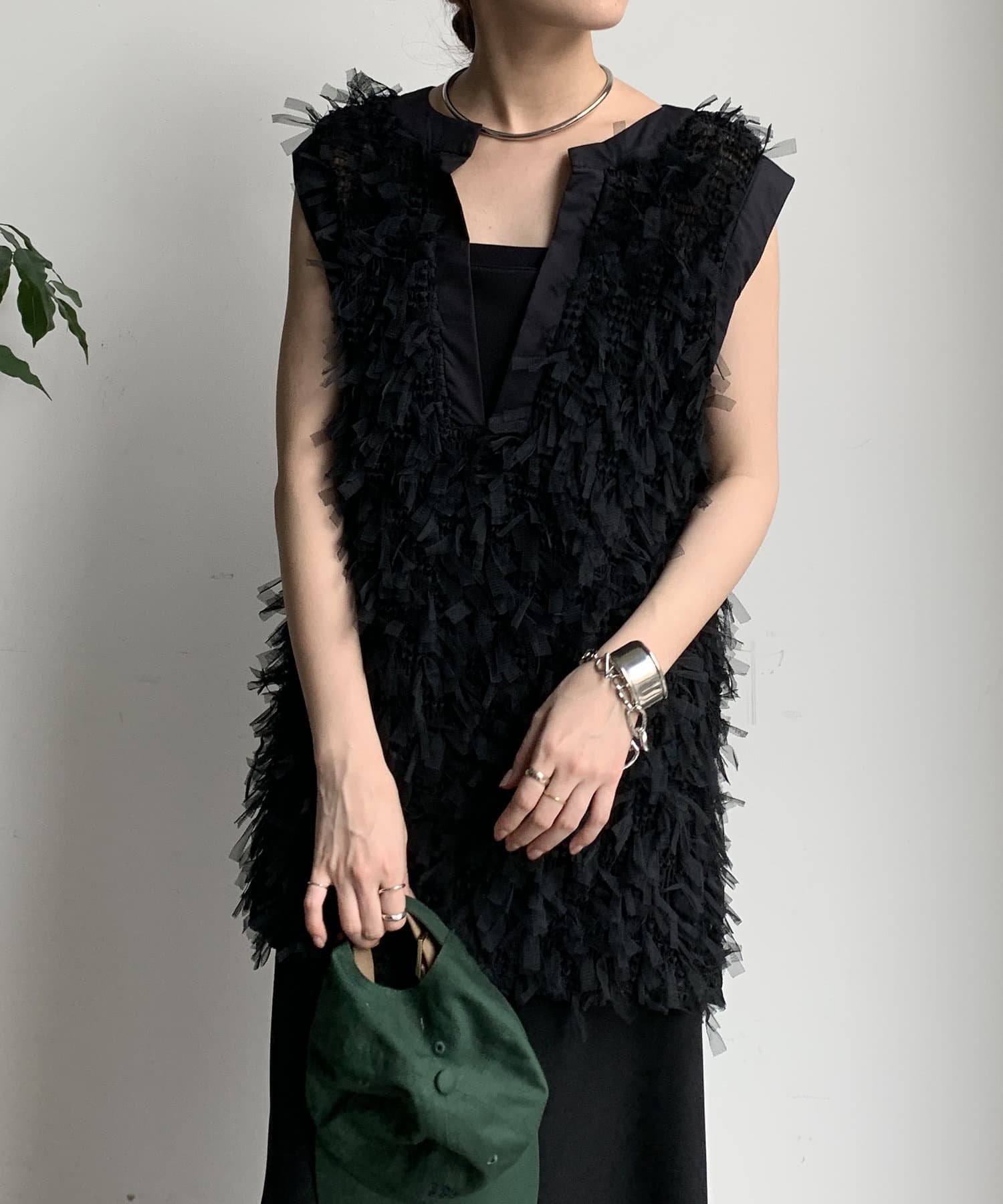 シンプルなワンピースに、デザイン性の高いベストを重ねることで