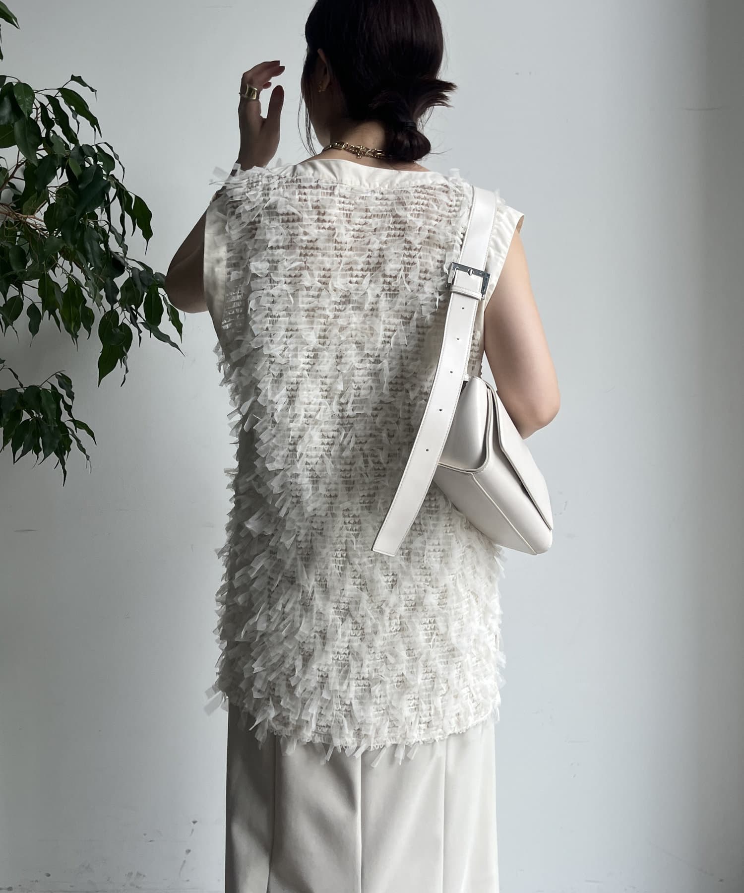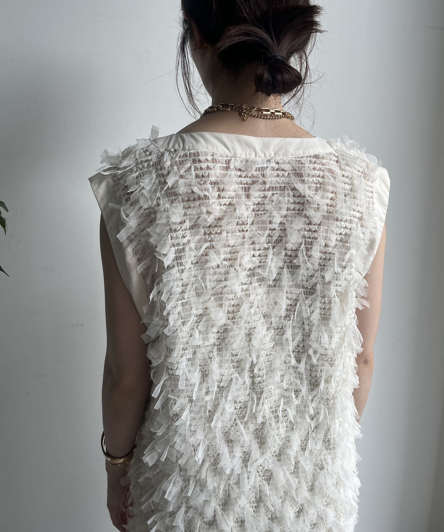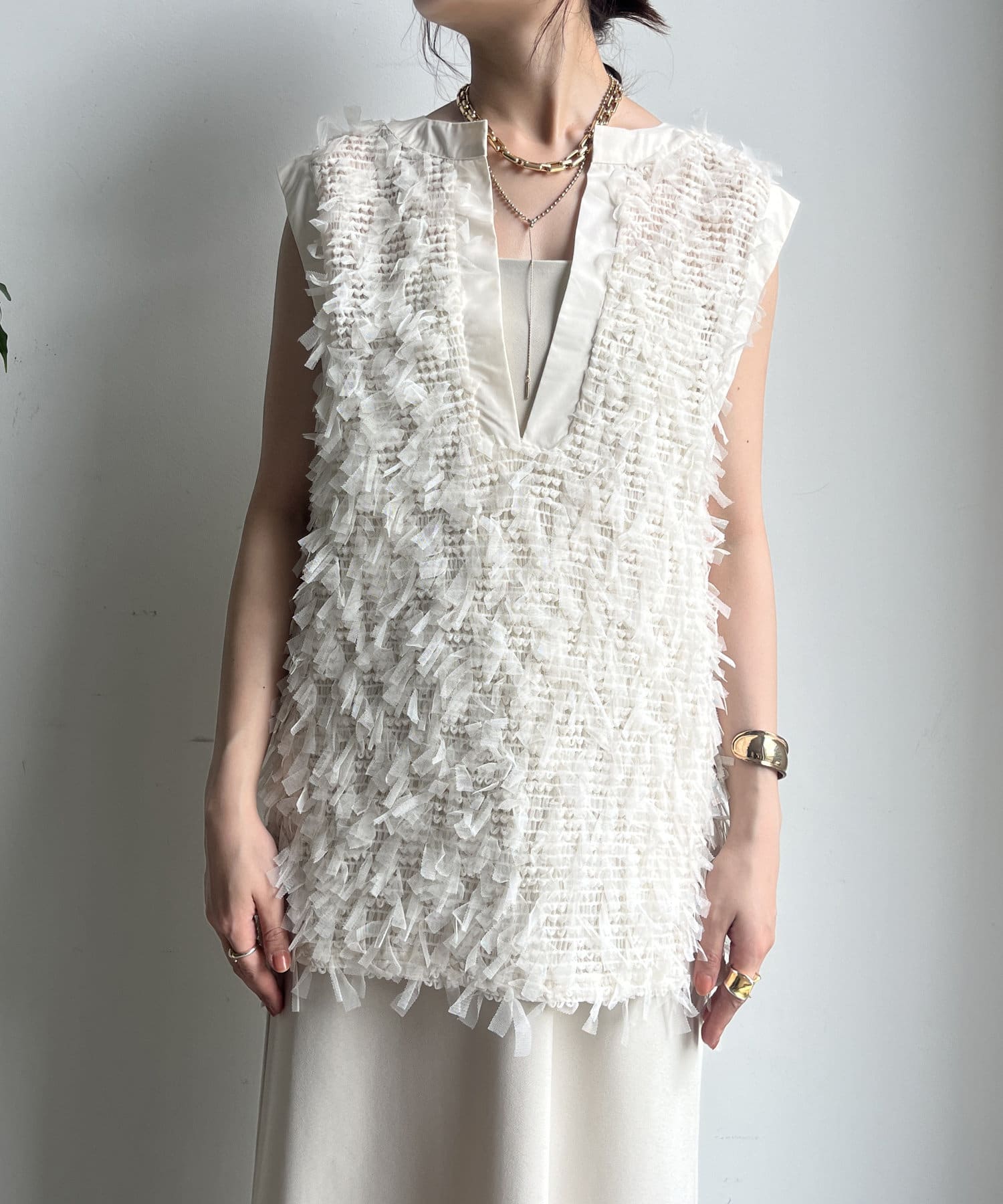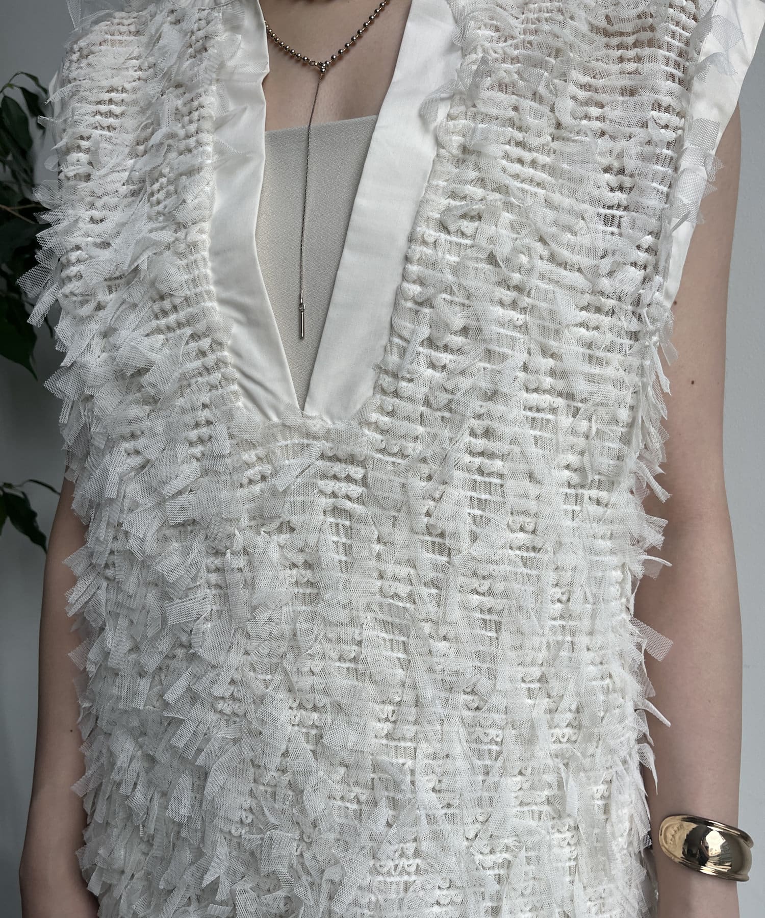 シンプルなワンピースに、デザイン性の高いベストを重ねることで