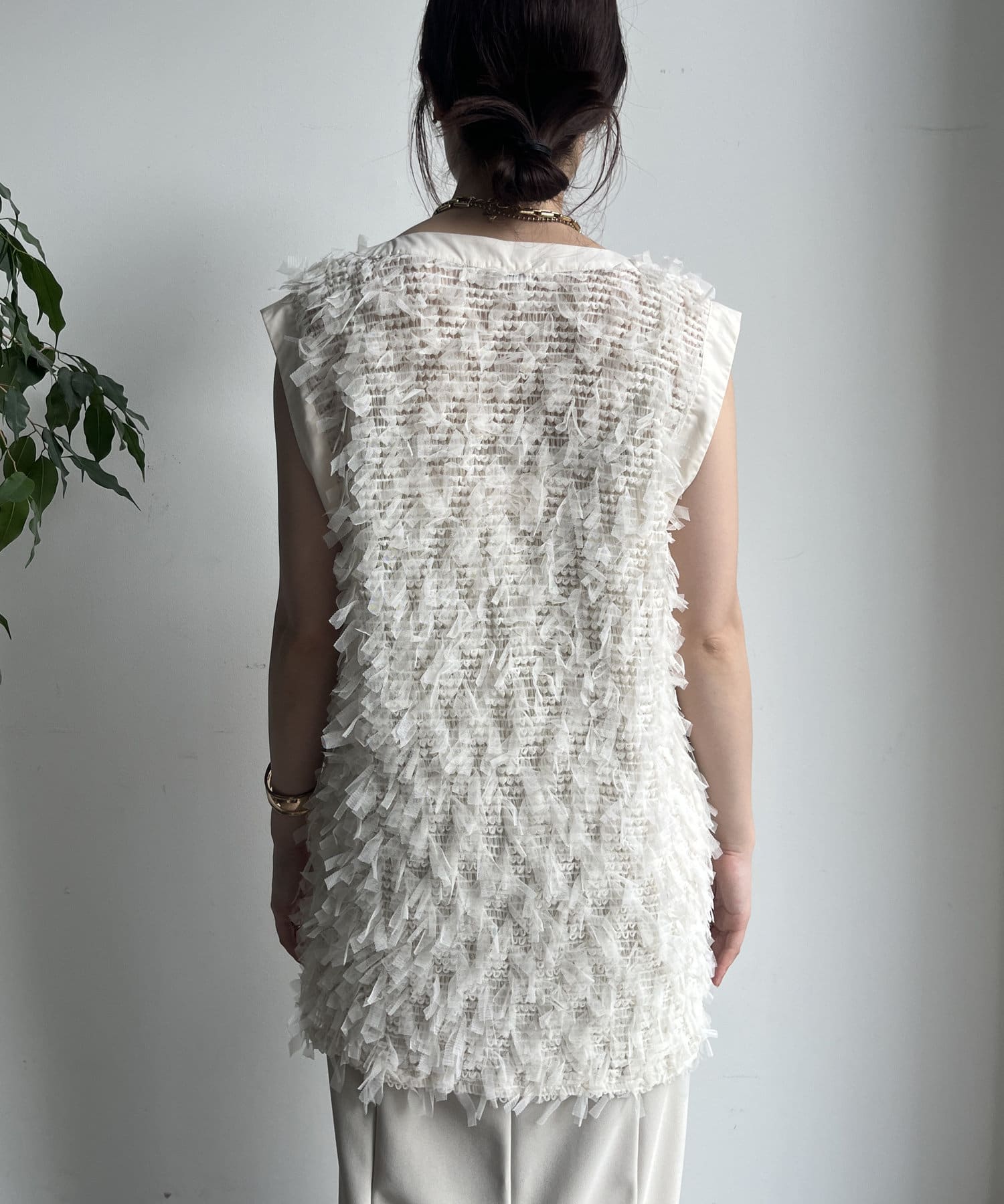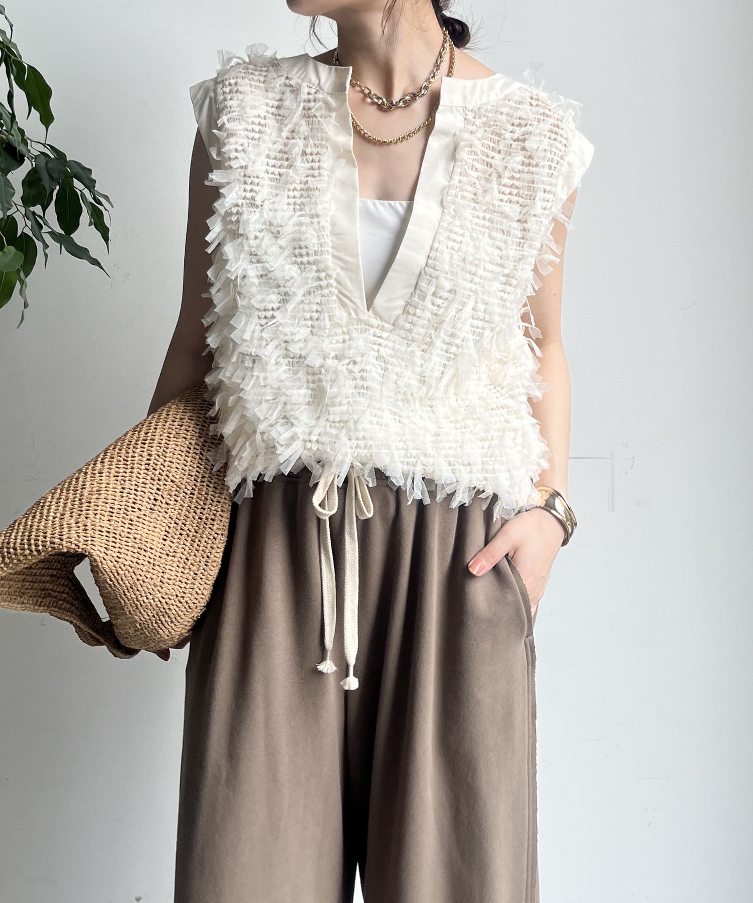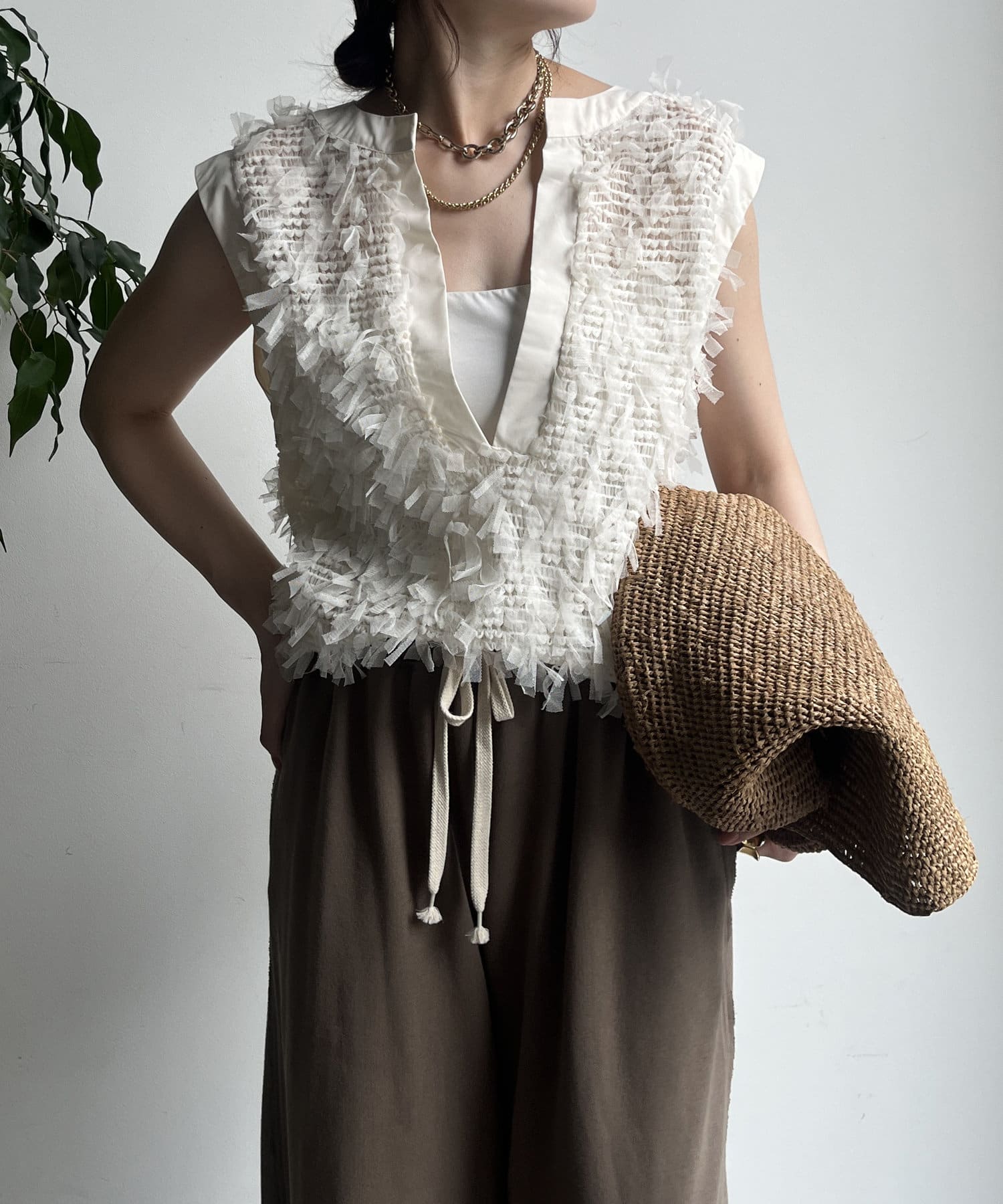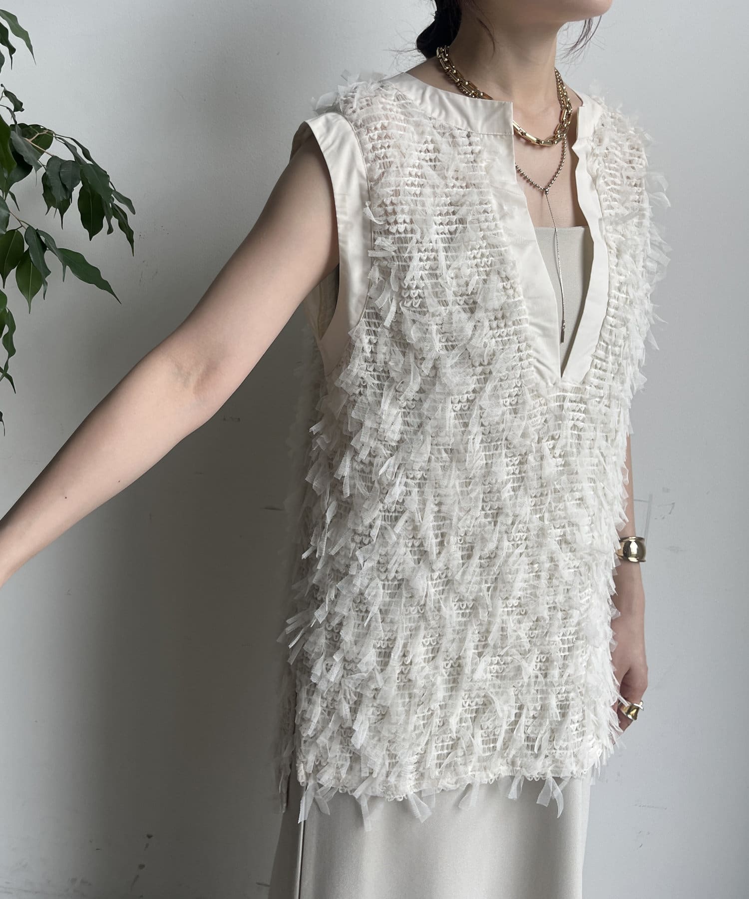 シンプルなワンピースに、デザイン性の高いベストを重ねることで