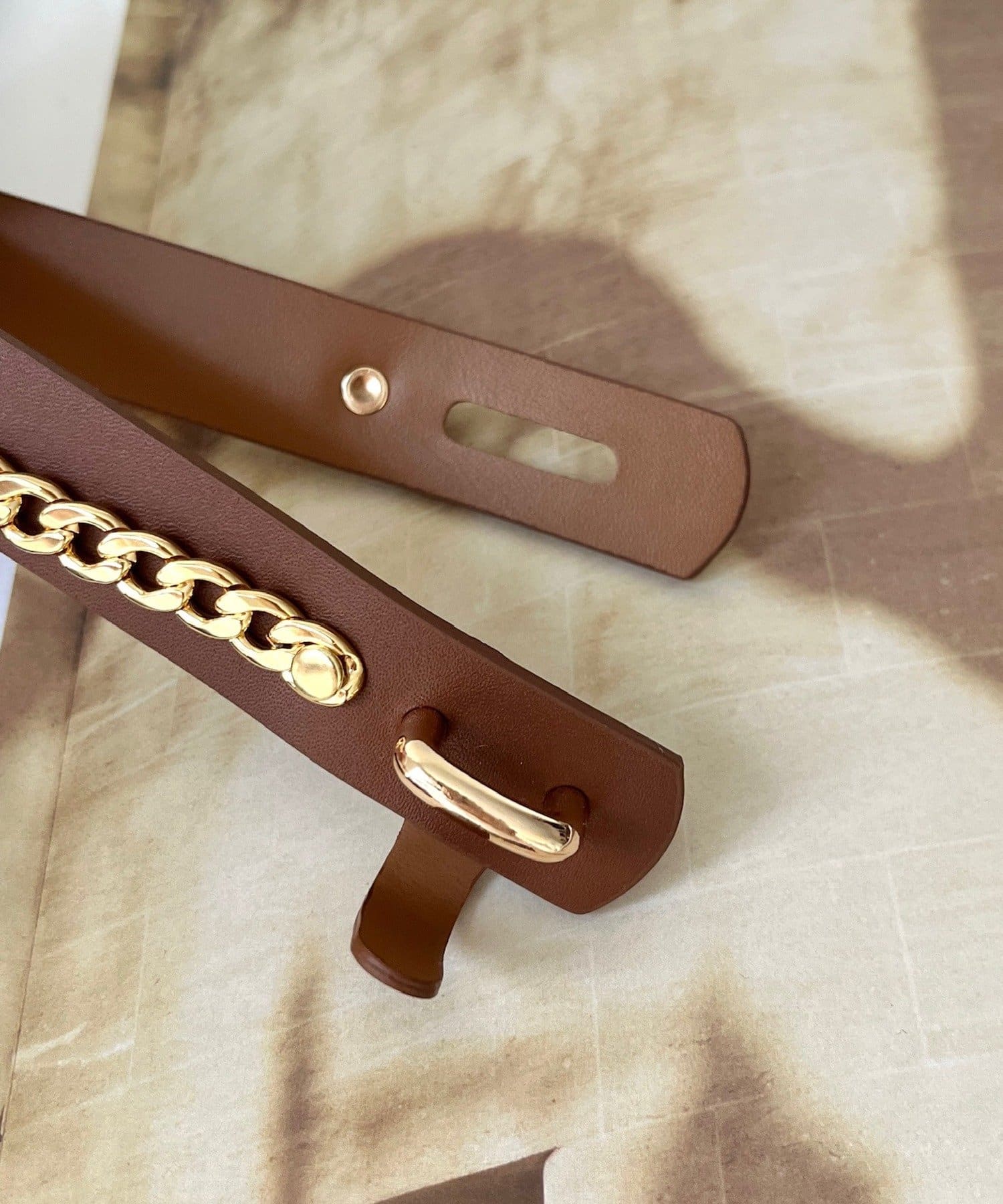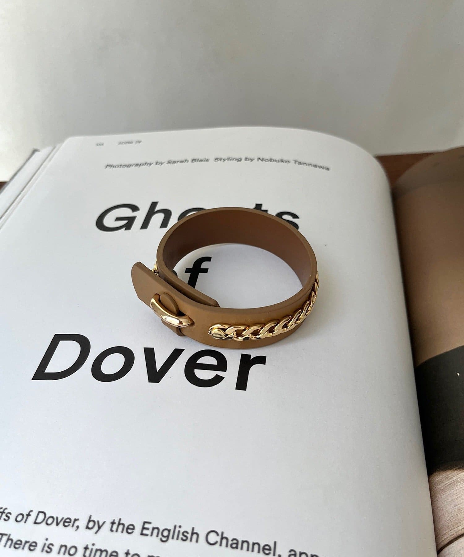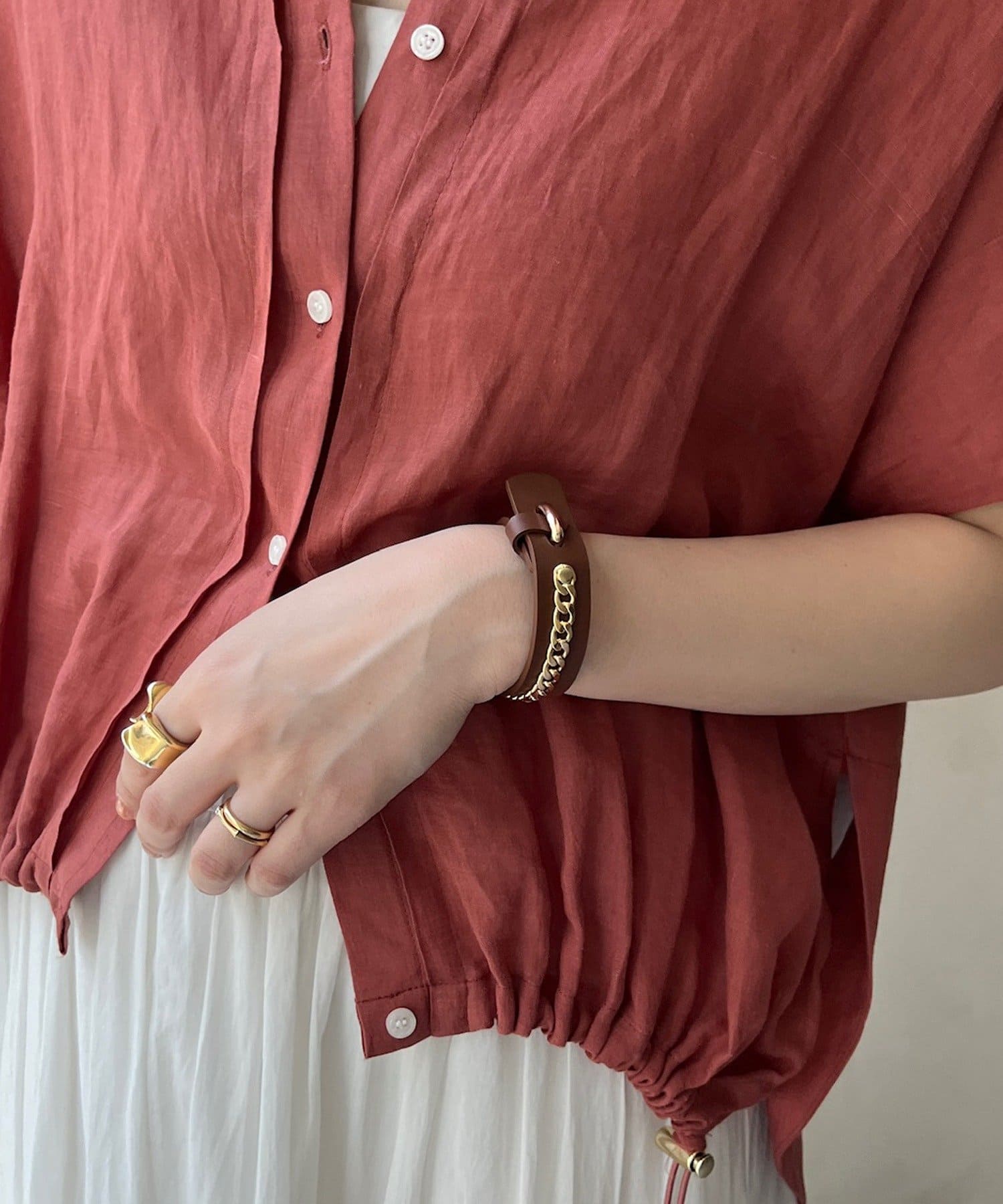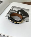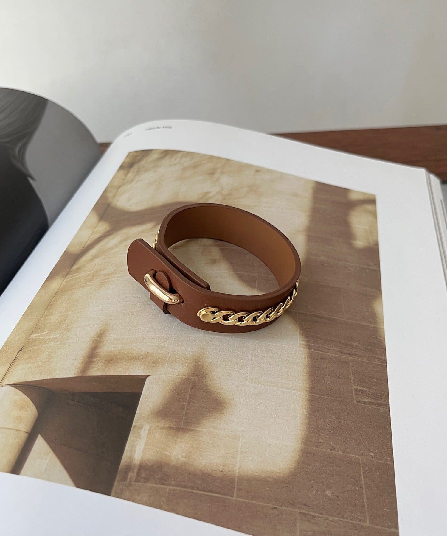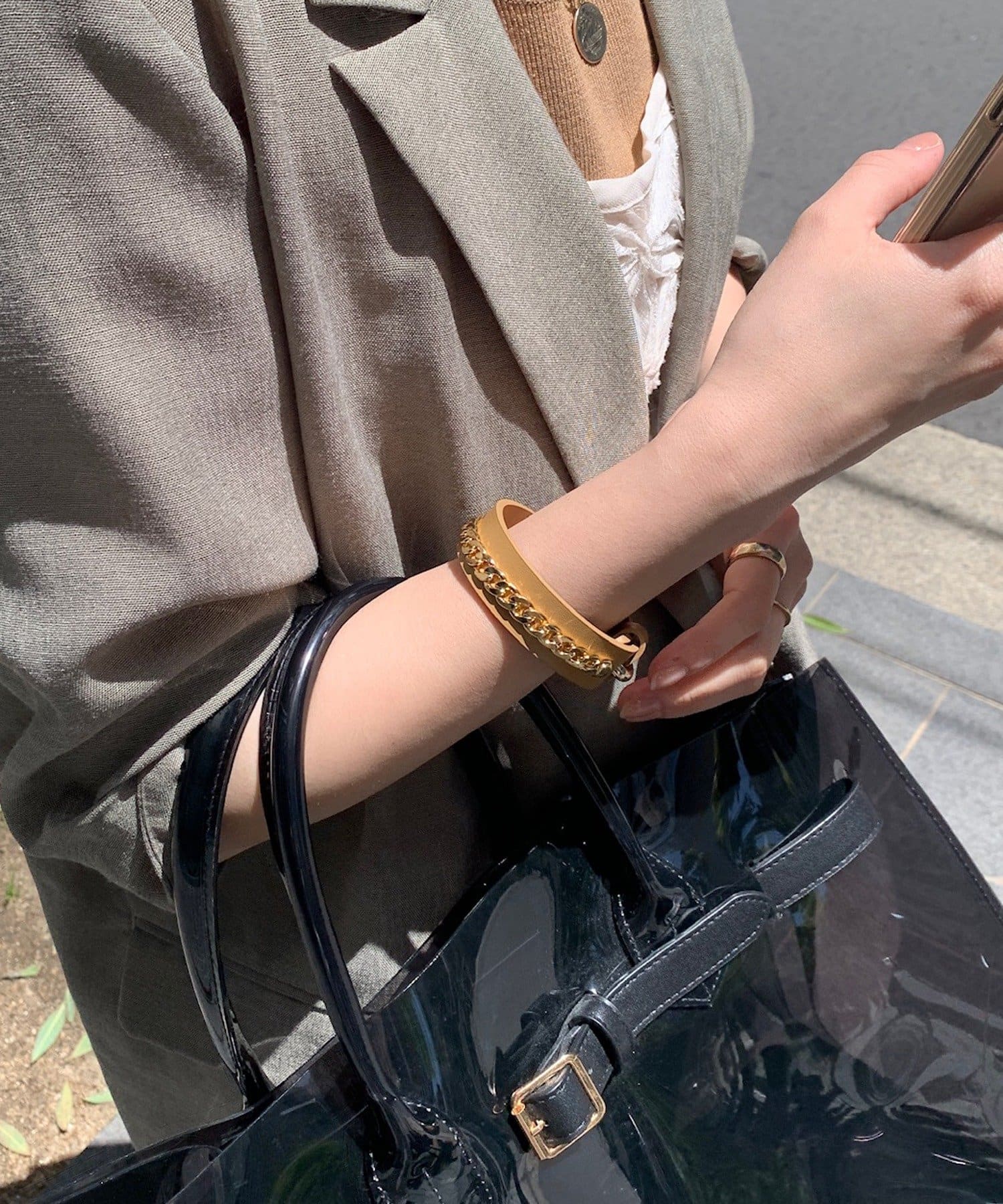 レザーと、ゴールドチェーンの組み合わせが、手元に華やかさを!