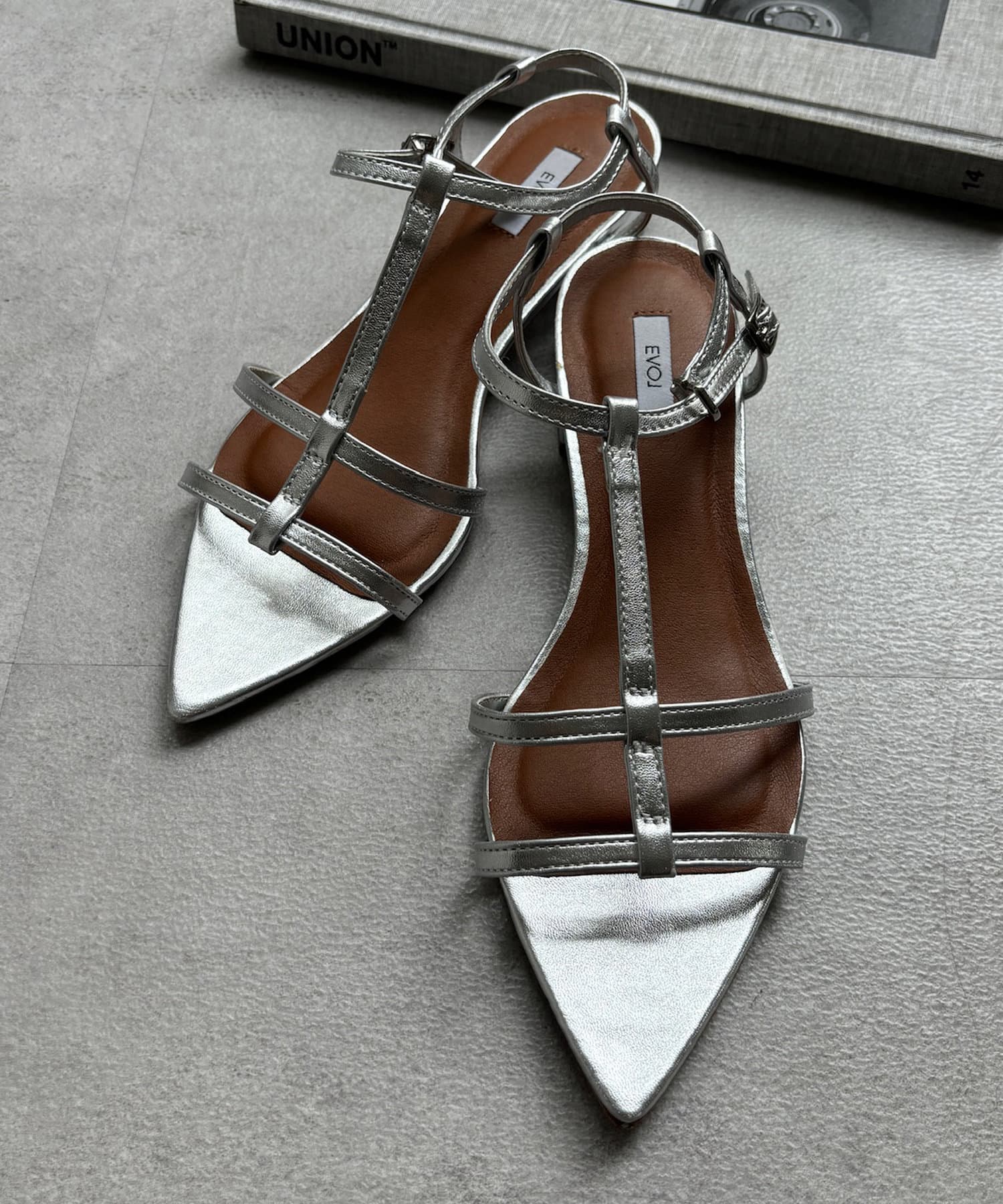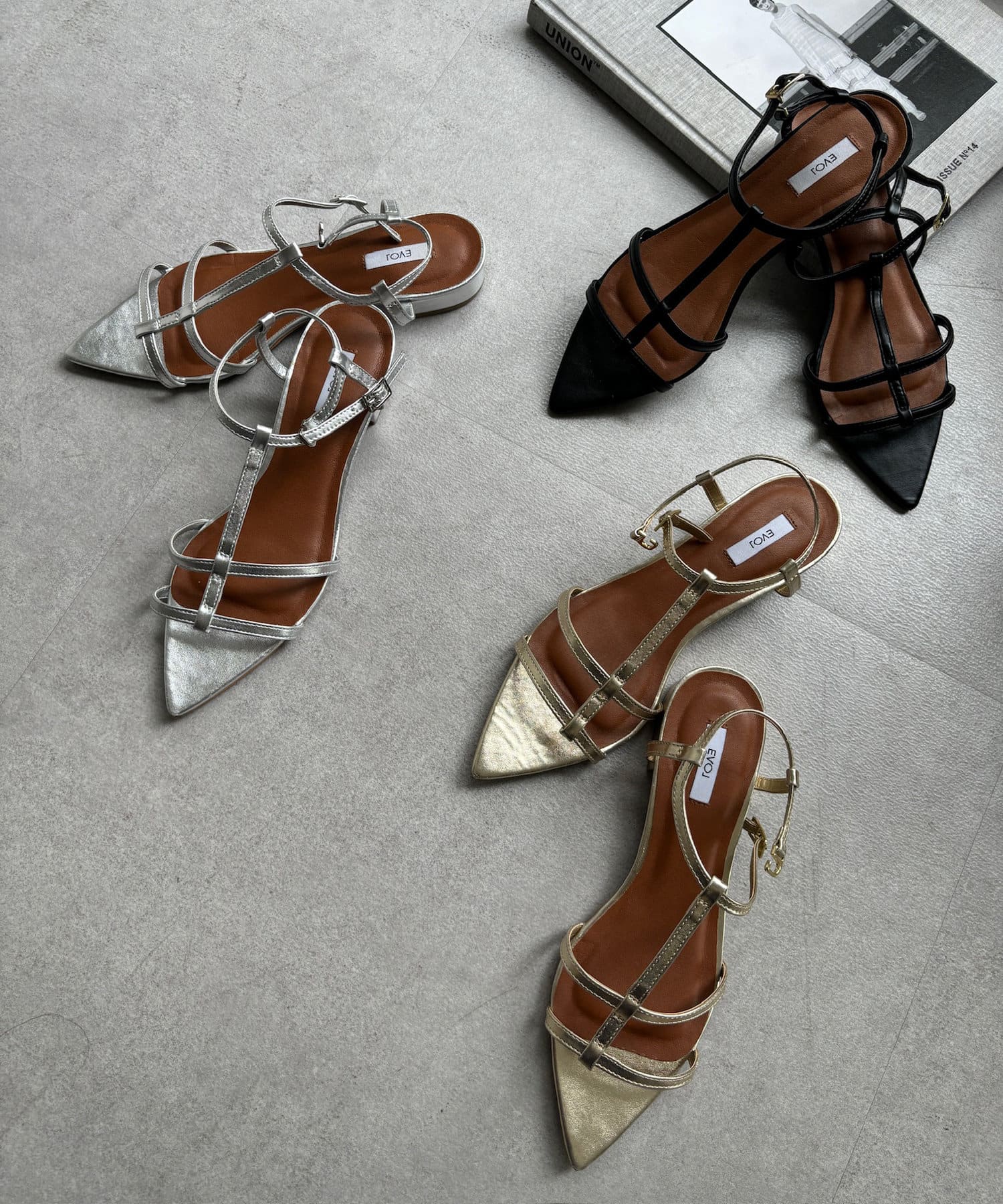 安定感がありつつも、スタイルアップも叶うポインテッドサンダル