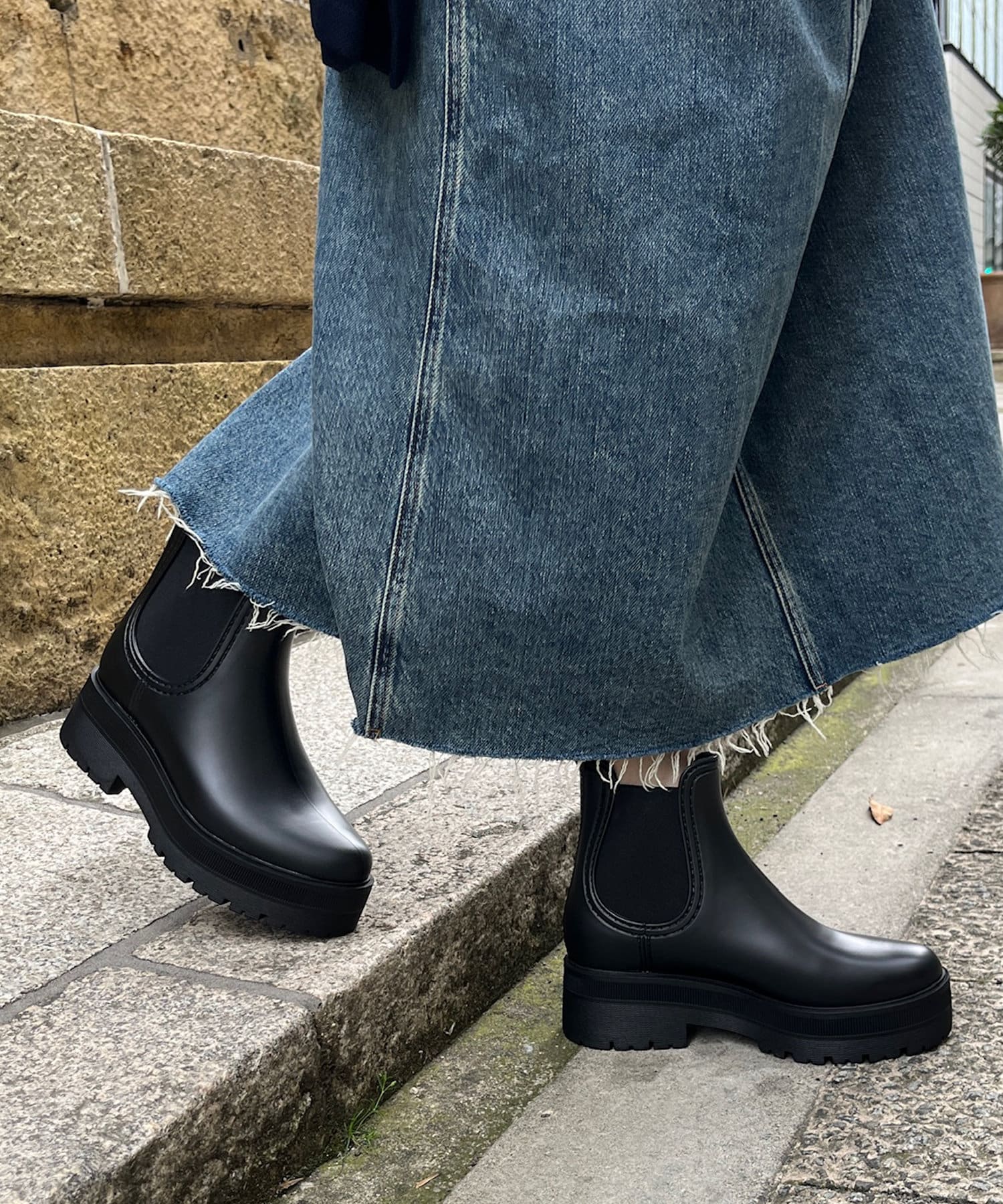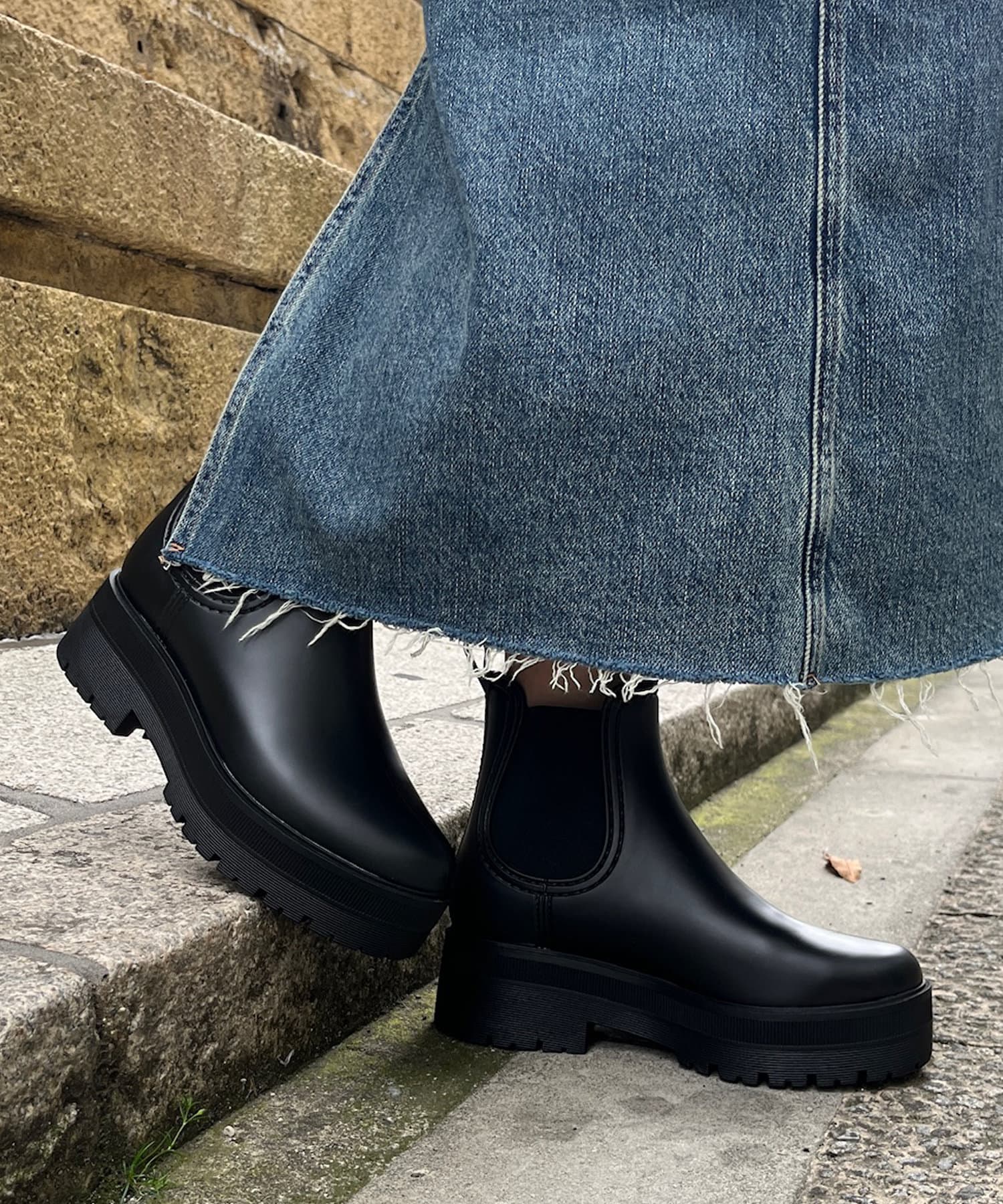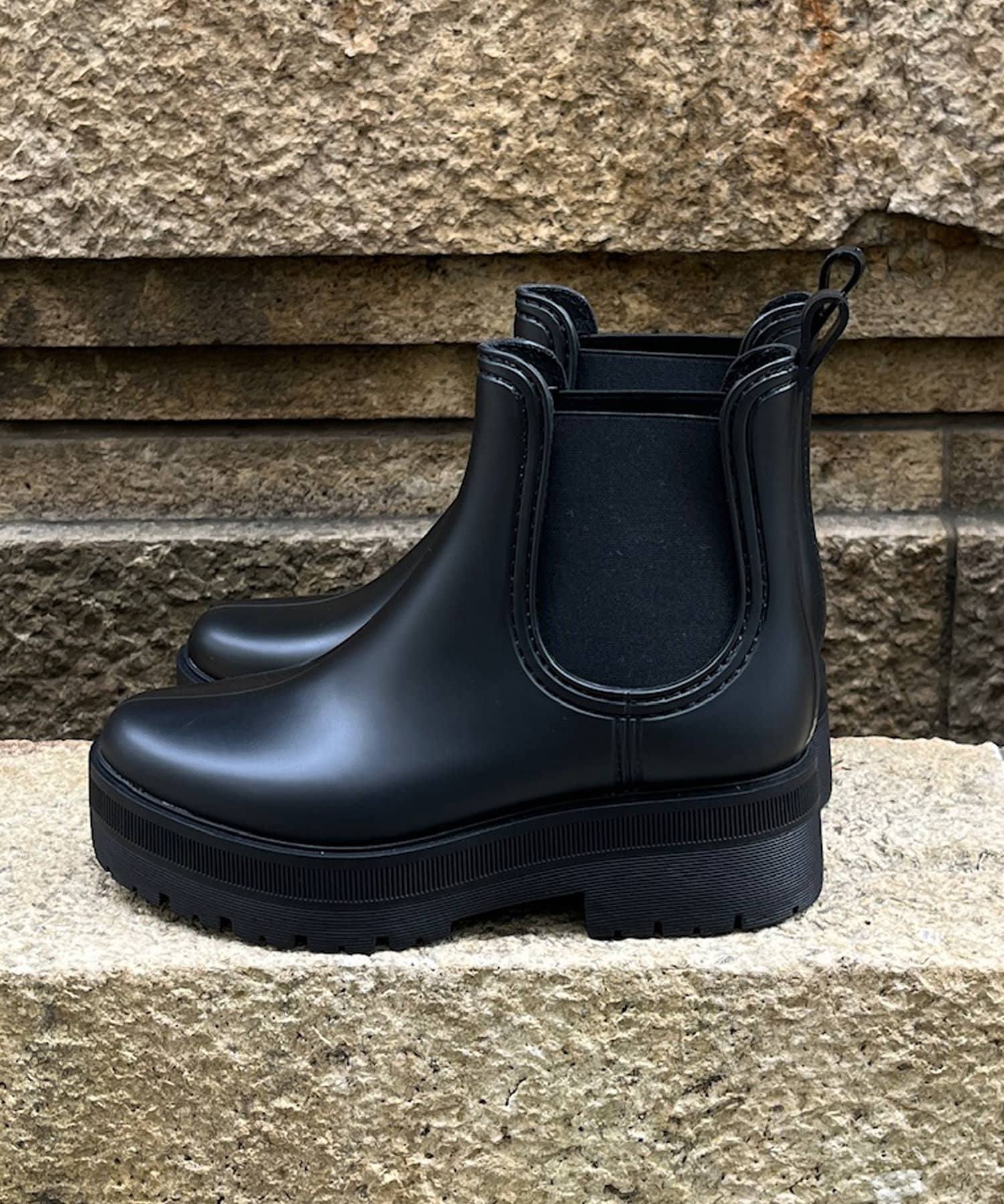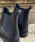 レインブーツながらもデザインにこだわり、厚底ソールの切り返しがコーディネートにアクセントを加えてくれます。