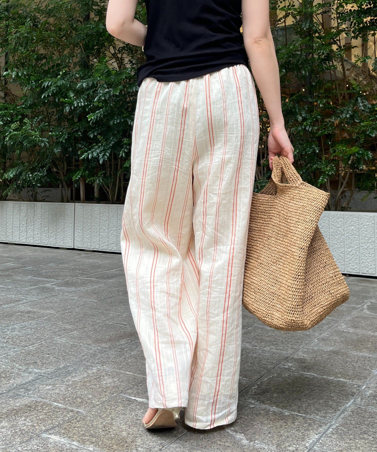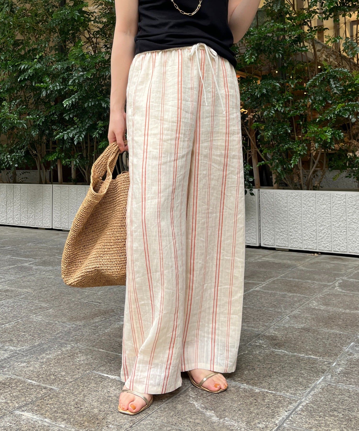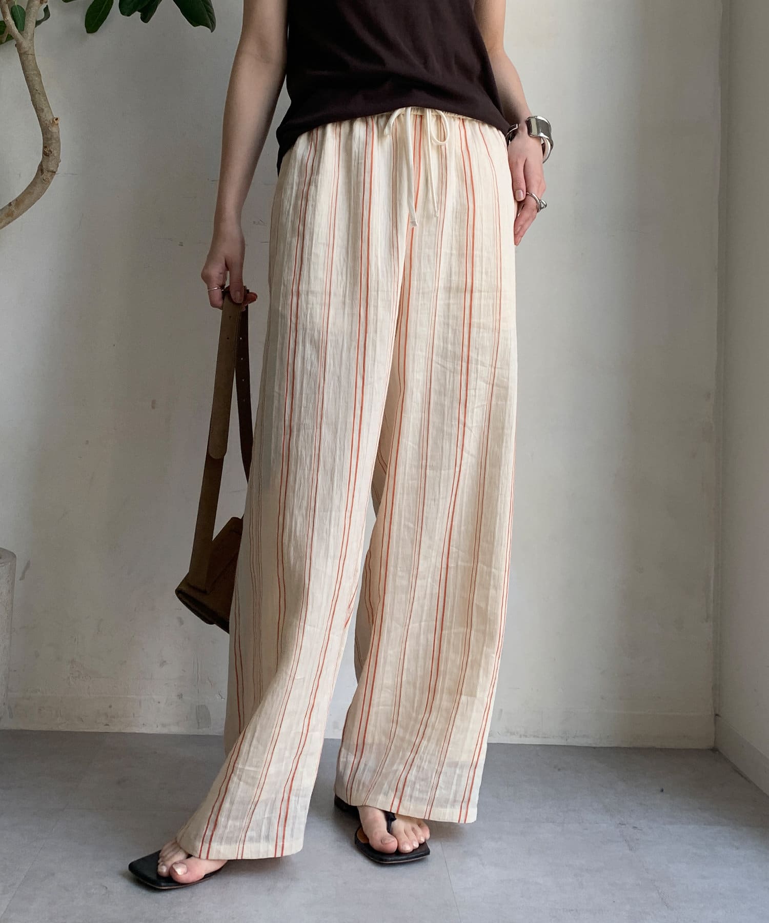 リゾートライクで軽やかなストライプワイドパンツ。