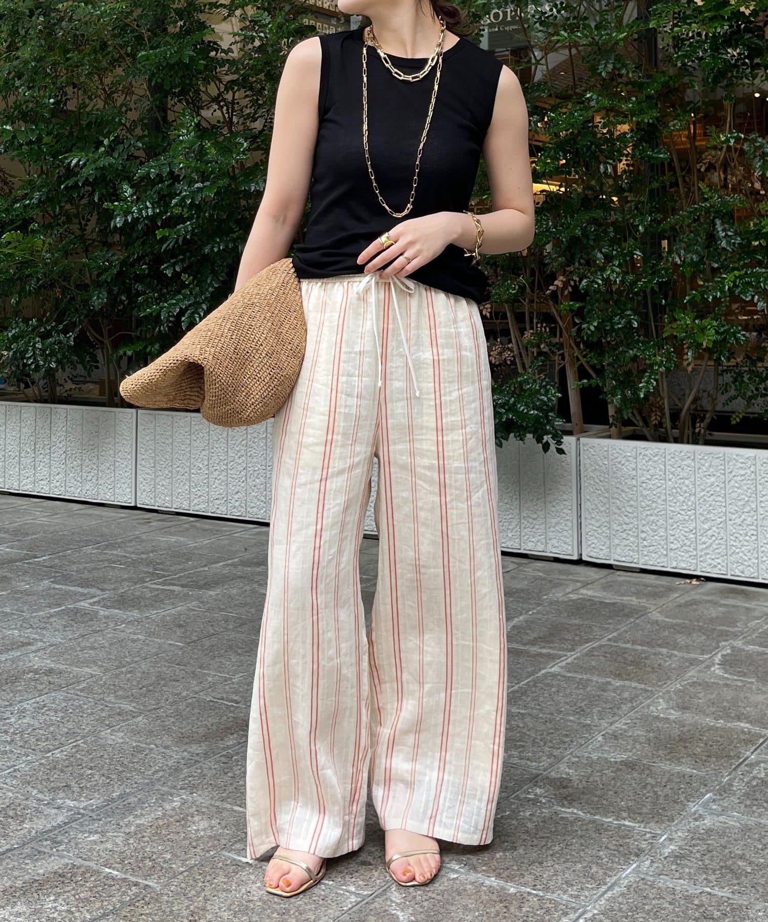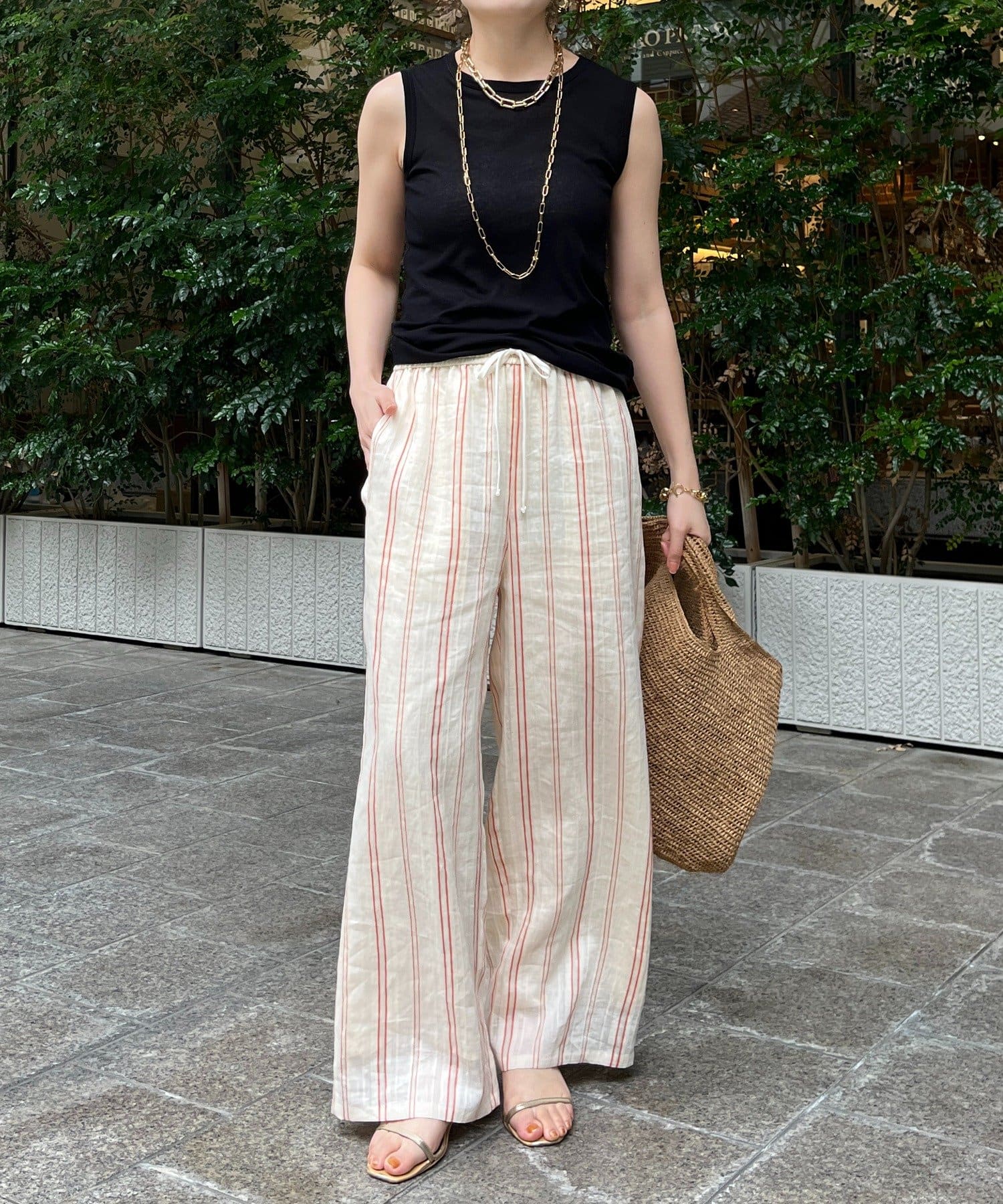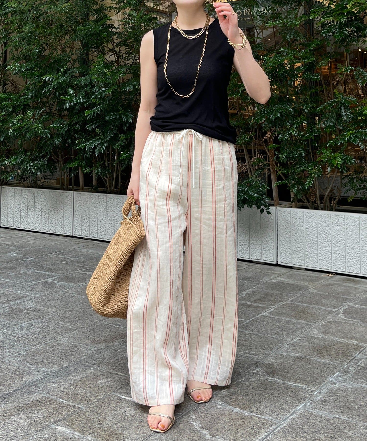 リゾートライクで軽やかなストライプワイドパンツ。
