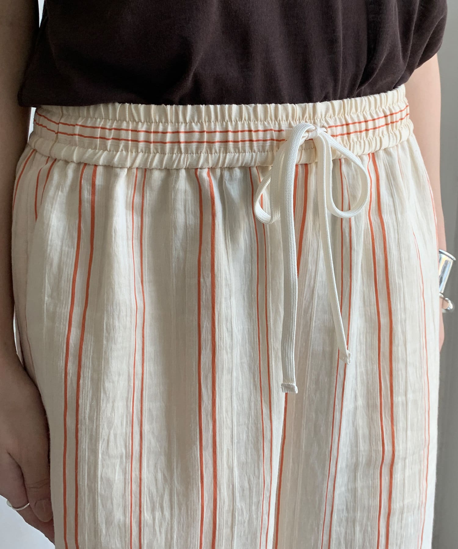 ナチュラルなベースカラーに、さりげなく主張するオレンジのストライプが、洗練された大人のカジュアルスタイルを完成させます。